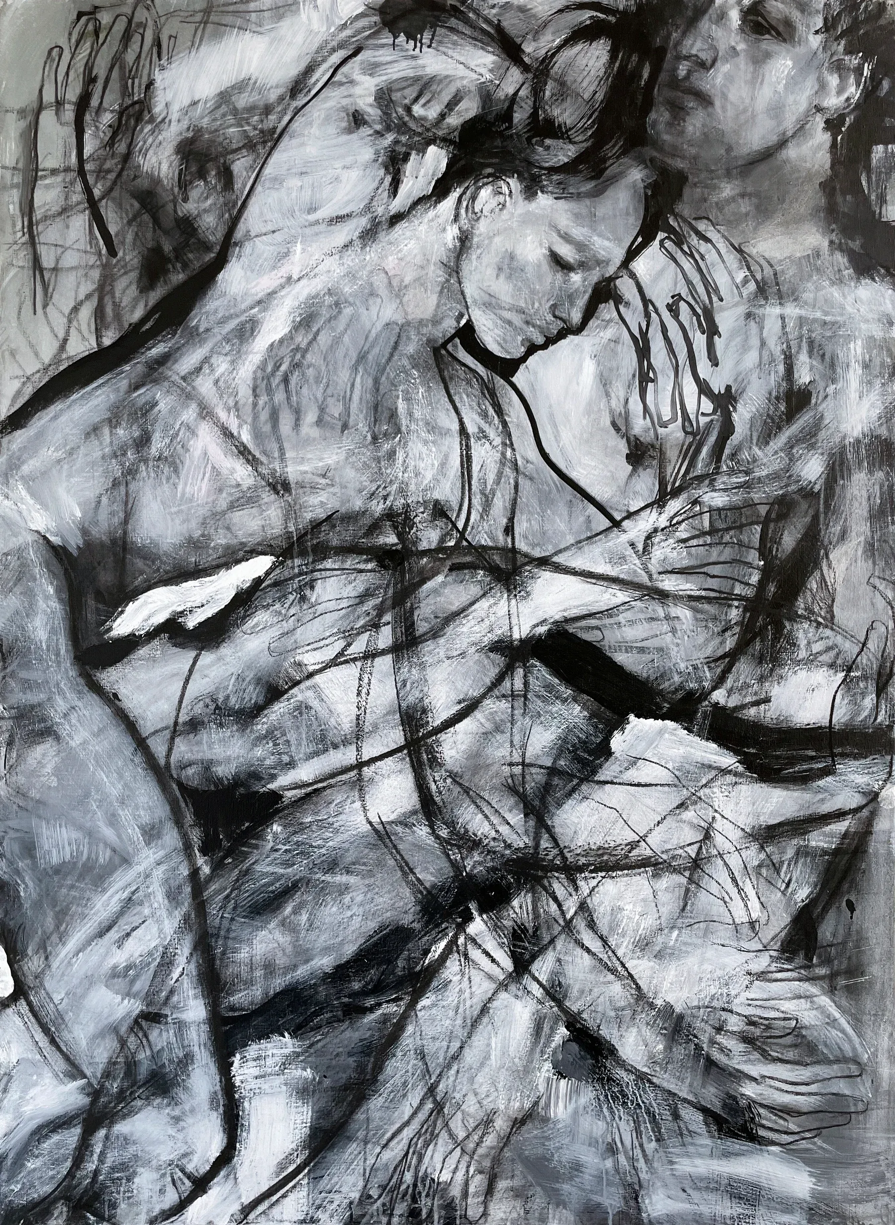 Charcoal lines move across acrylic and pastel in ways that feel both swift and reflective.