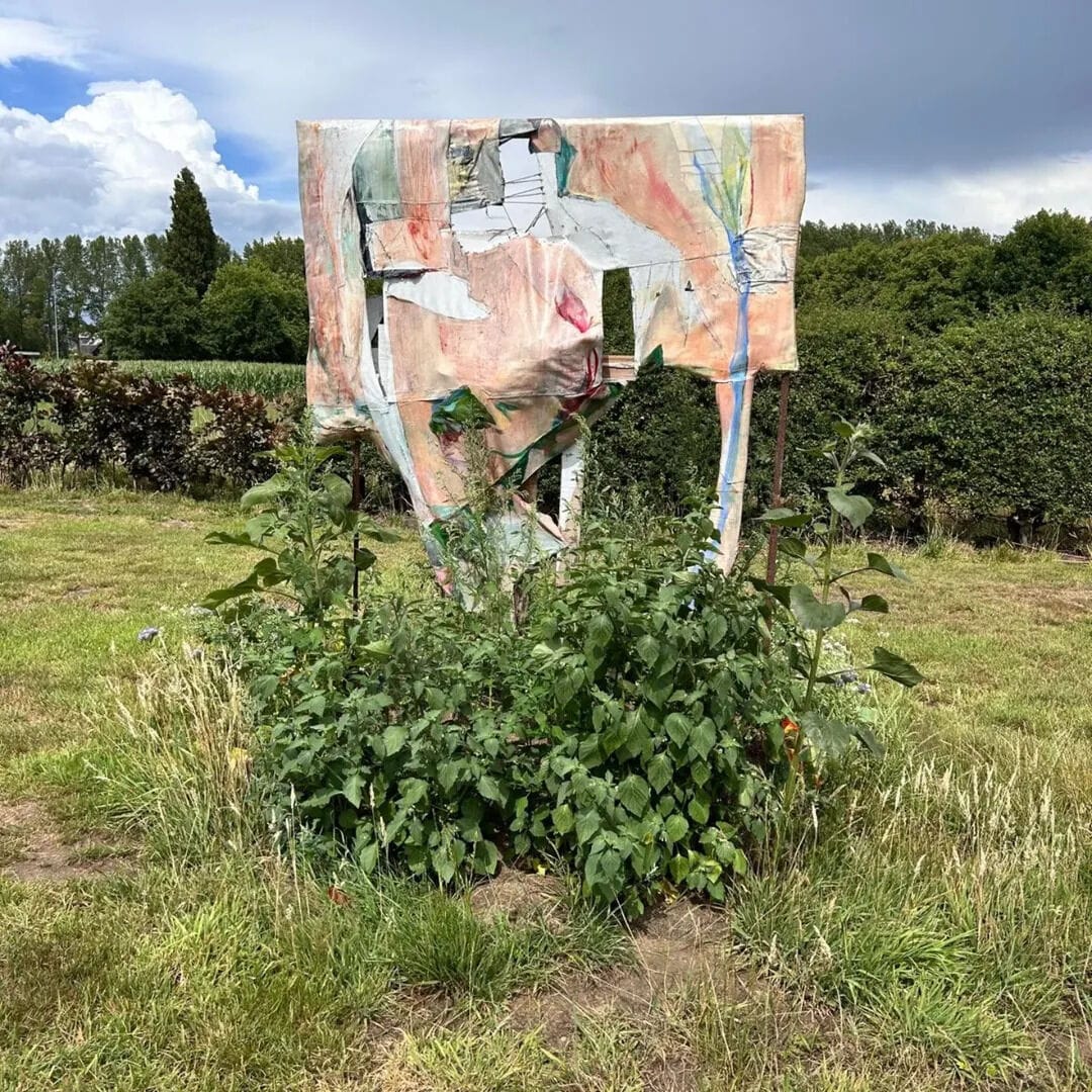 Ruth Devriendt, outdoor installation view from the series shown at Nature in flux, combining painted textile panels with garden growth. Image courtesy of the artist.