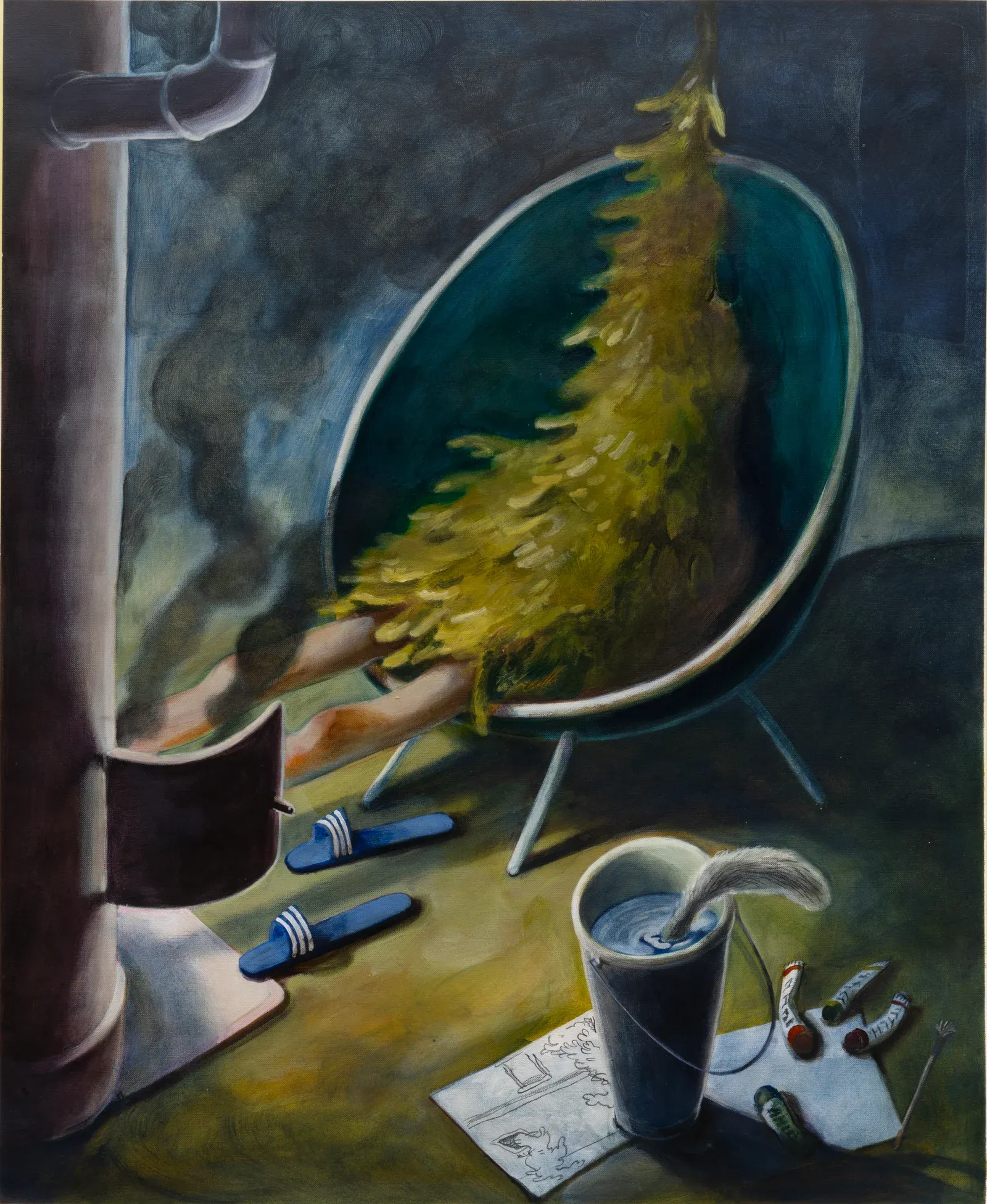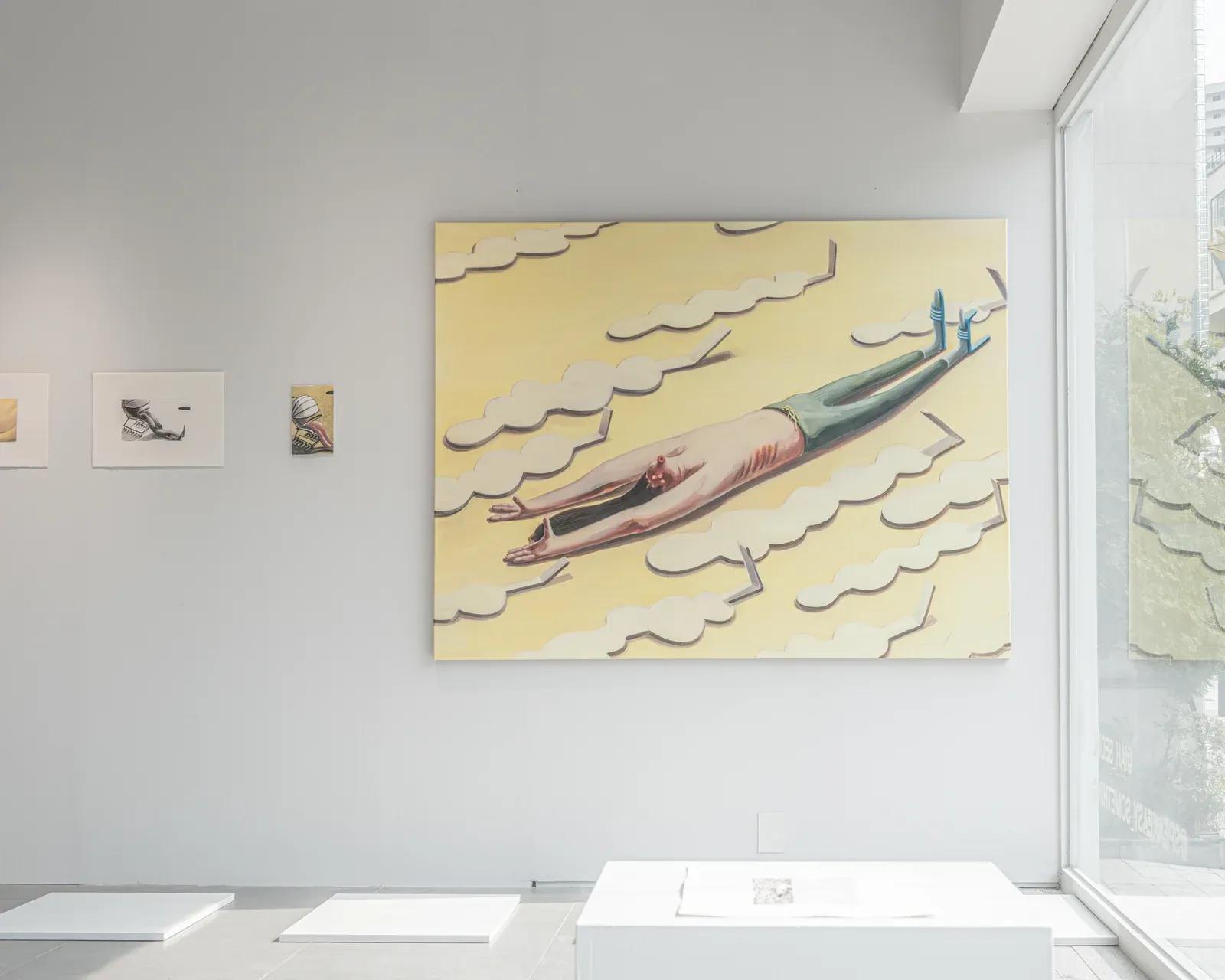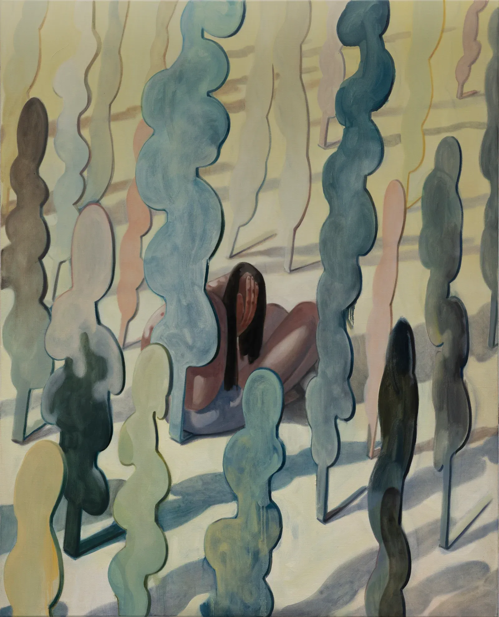 Her figures lean, hang, or sink into staged interiors defined by artificial light and hard shadows. Luminous, almost tender colors overlay scenes of uncertainty. The tension does not arise from narrative events but from lowered intensity. In a cultural climate that demands visibility and productivity, Song situates exhaustion as a structural condition. The body does not collapse. It softens.