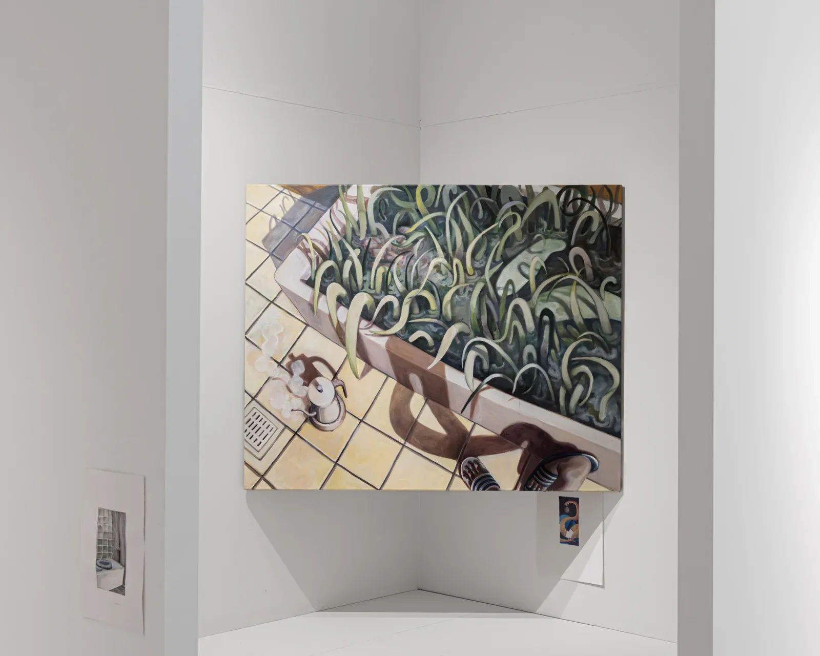 In more recent works, the space expands toward landscape. Water surfaces, plants and horizons gain weight while the figure becomes smaller, less central. What remains is not disappearance but trace. The body persists as a fragile element within a larger field, no longer dominant yet still there.