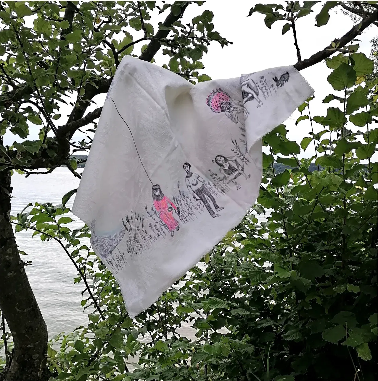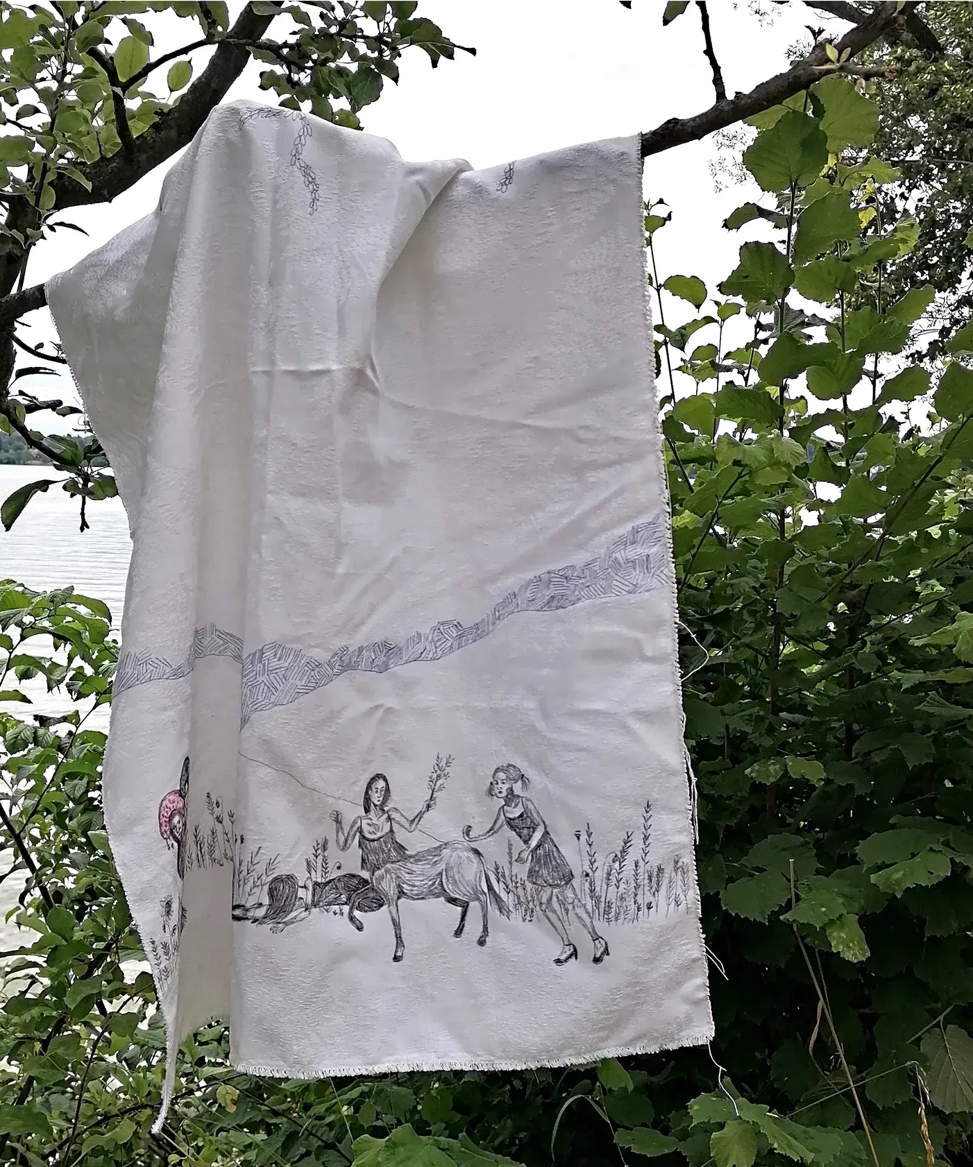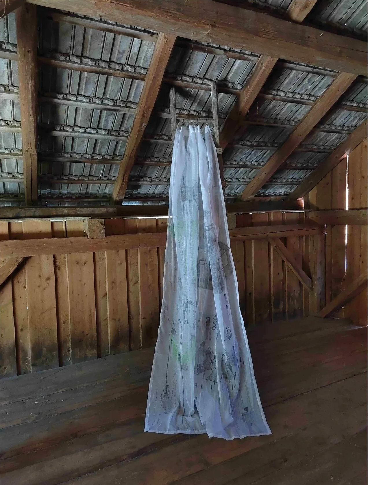 Julia Zöhrer lives and works in Linz. Her practice unfolds between textile, drawing, and installation, often extending into natural or rural contexts. Rather than treating textiles as surfaces, she approaches them as structures of thought, layered, fragile, and charged with memory. Her works appear suspended, hung from trees, beams, or temporary architectures, positioned between shelter and exposure.