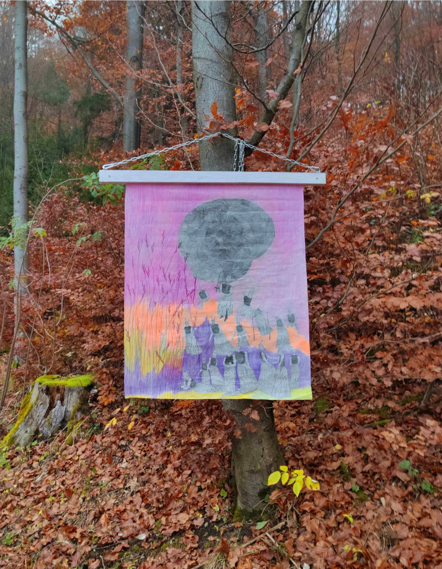 Zöhrer works with fabric and paper as carriers of symbolic imagery. Figures, animals, and hybrid beings populate her compositions, arranged in distorted groupings within reduced landscapes.