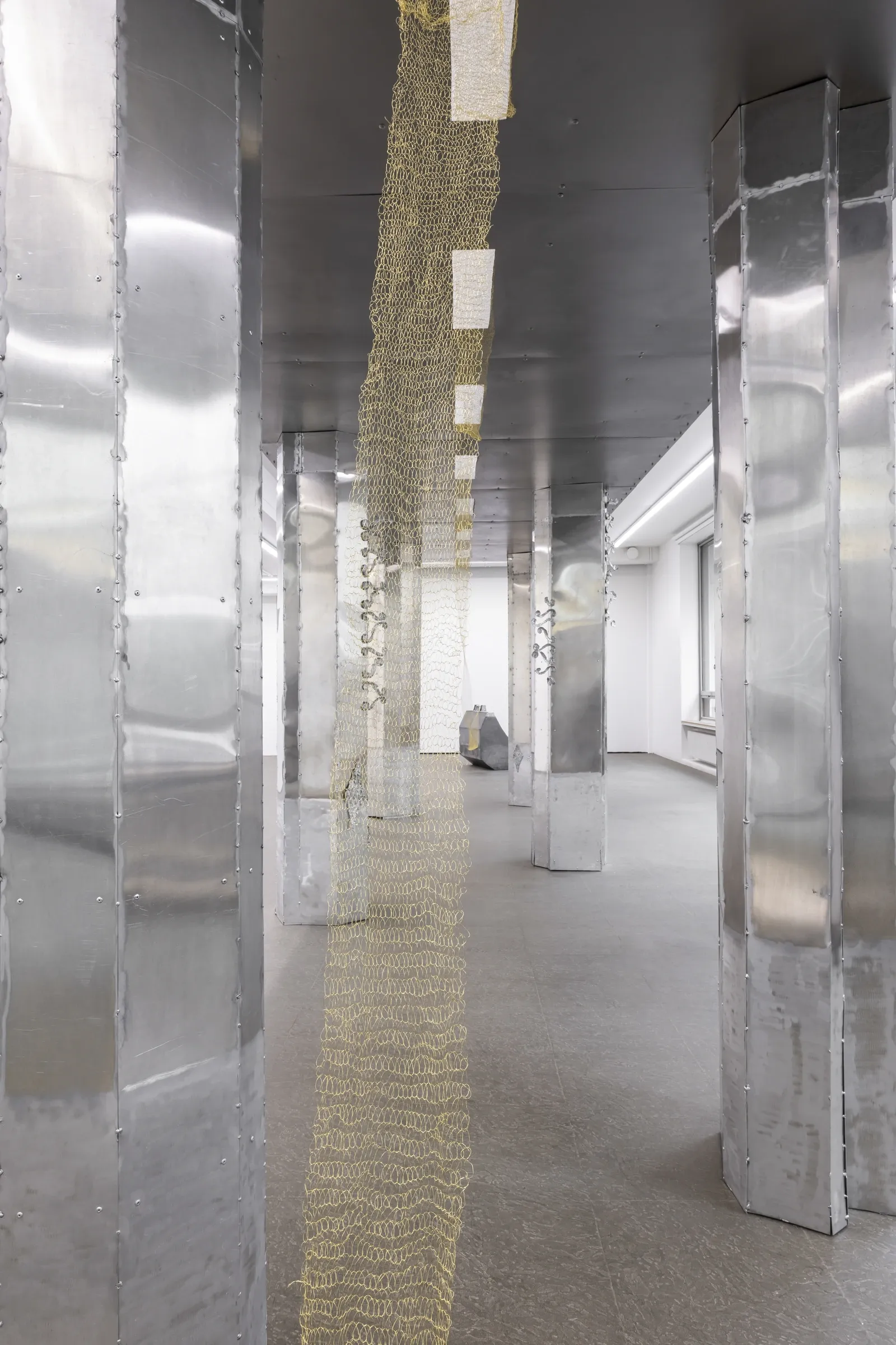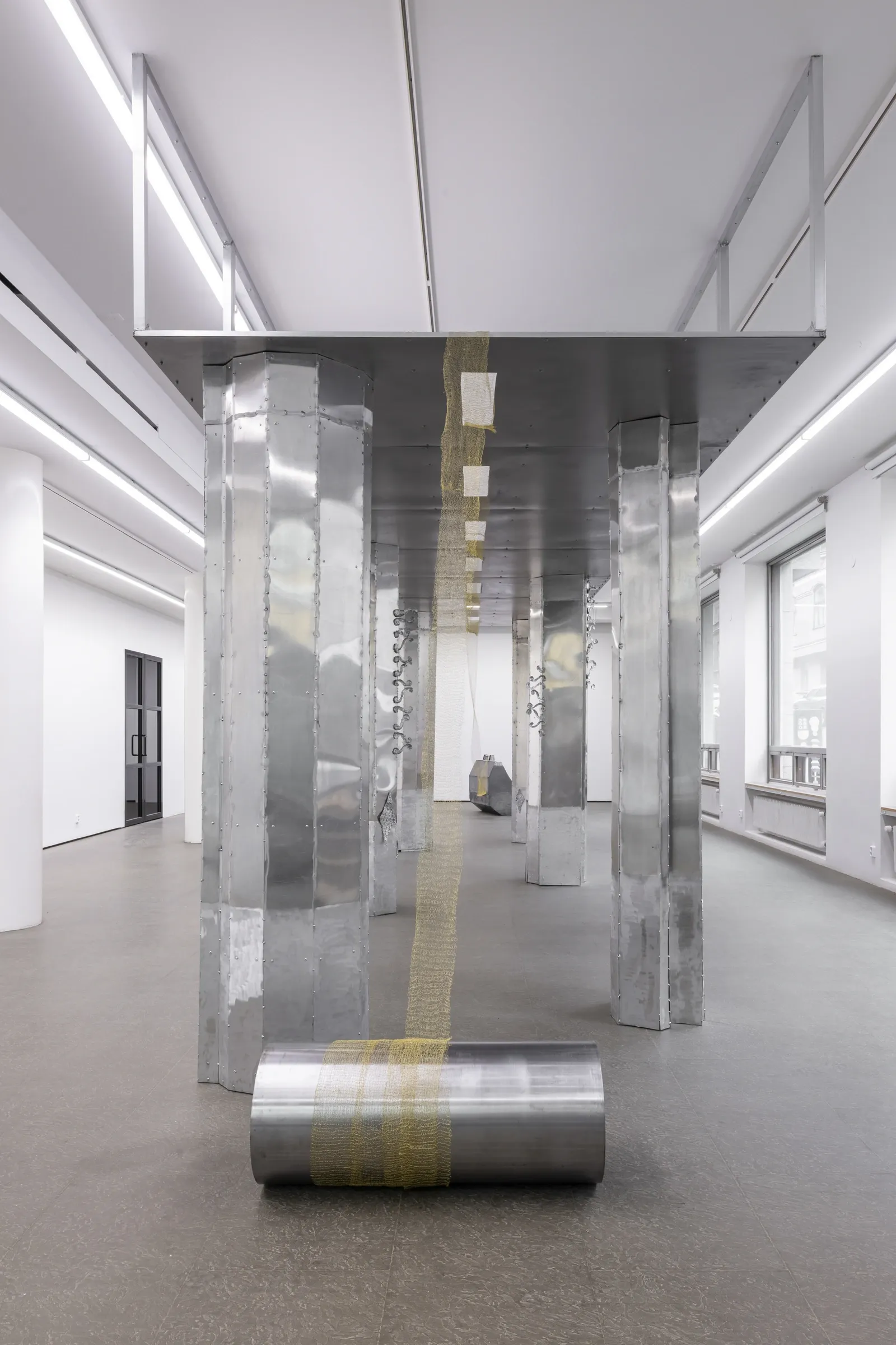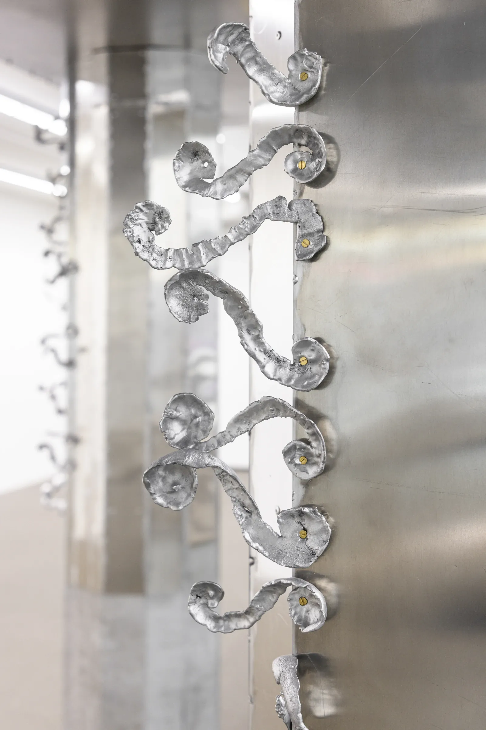 Sinne, Helsinki's institution for contemporary sculpture and installation, is a space that makes room for work rather than merely displaying it. Maija Fox's exhibition Hard Shoulders fills it with a single large-scale installation, through and through, built from cast brass, cast aluminium, forged steel, and stainless steel fixtures. The material weight is real. So, unexpectedly, is the fineness of certain elements within it.