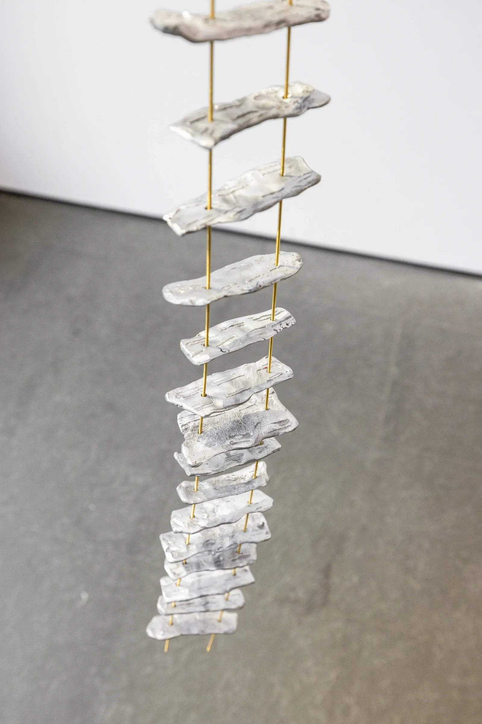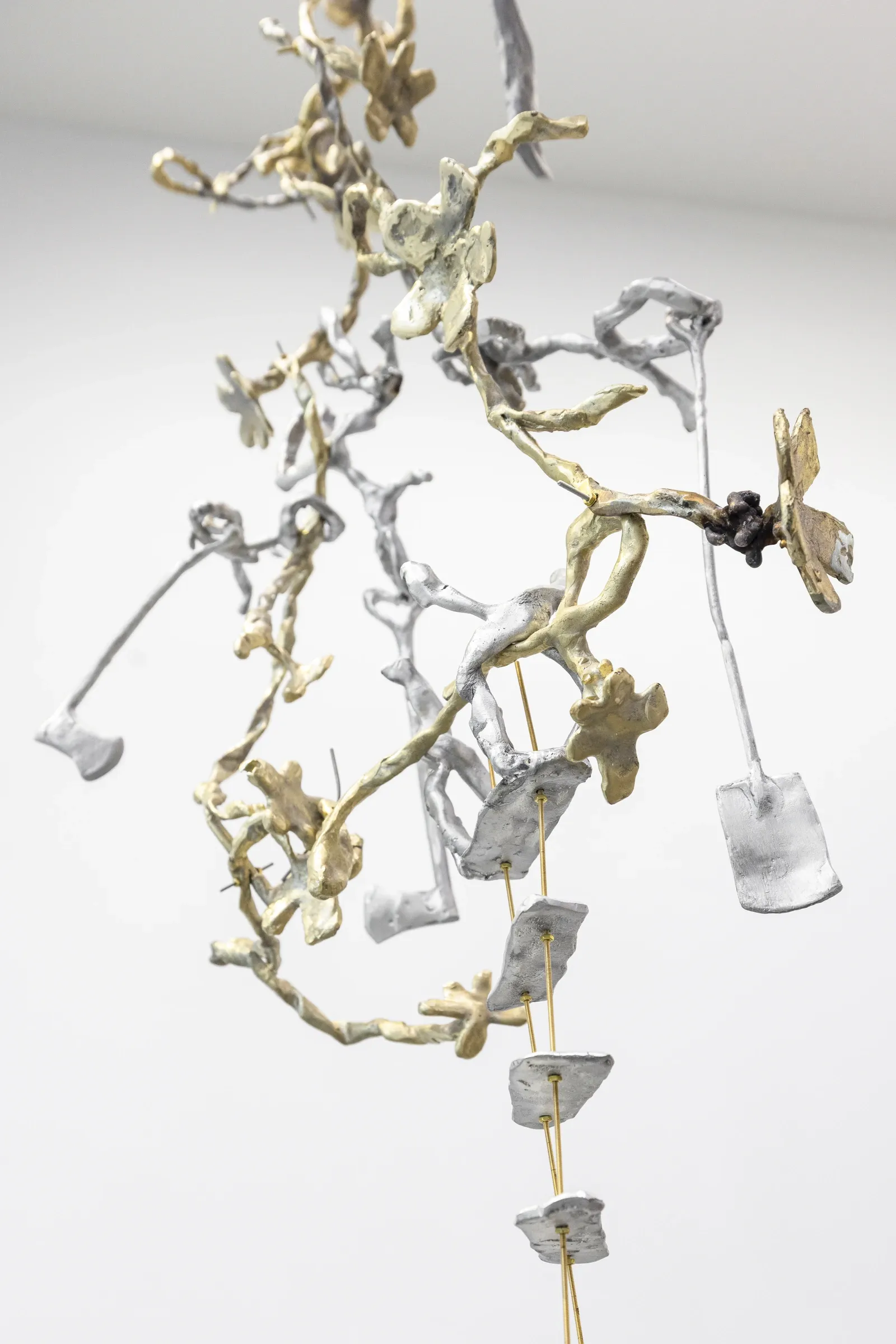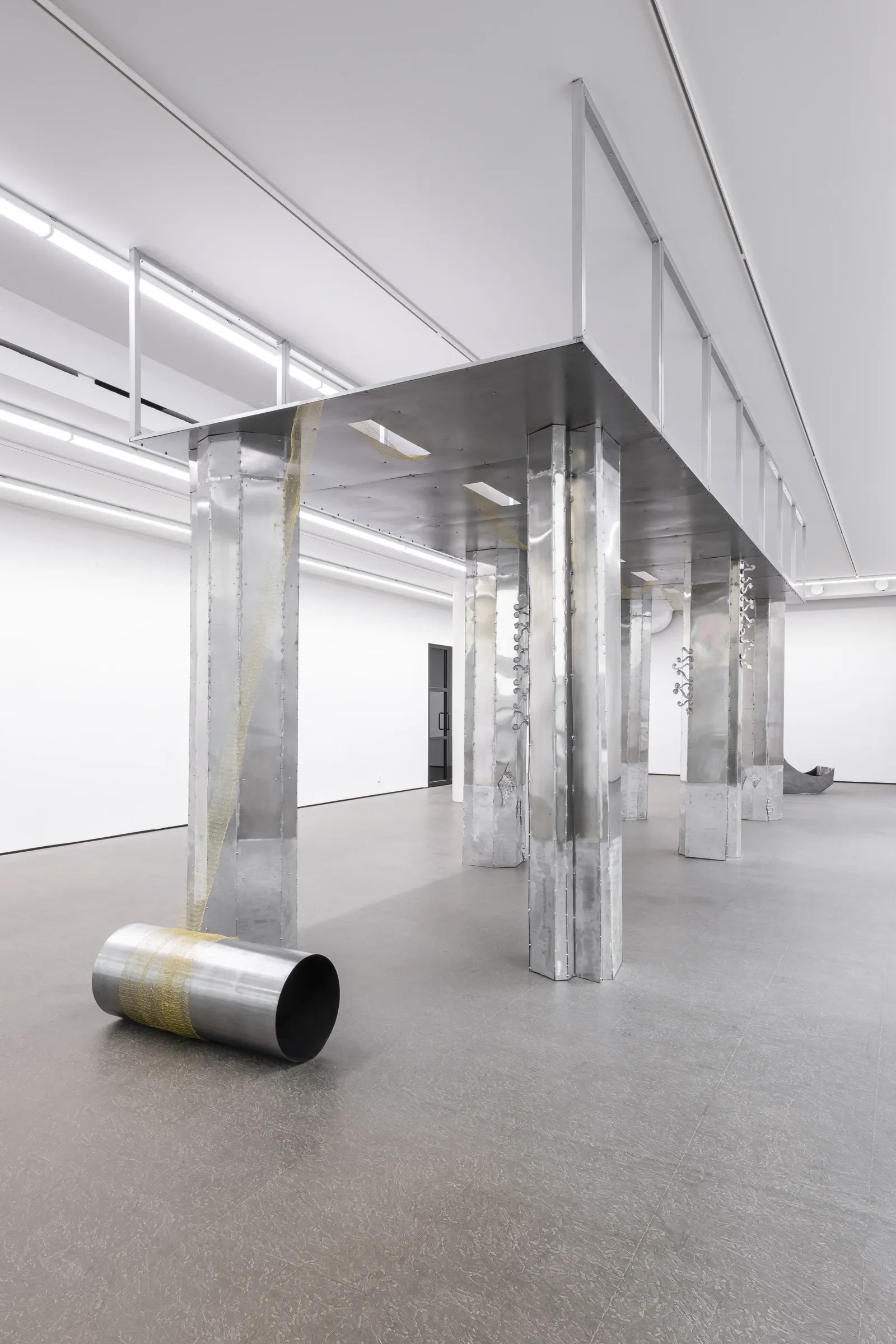 Sinne, Helsinki's institution for contemporary sculpture and installation, is a space that makes room for work rather than merely displaying it. Maija Fox's exhibition Hard Shoulders fills it with a single large-scale installation, through and through, built from cast brass, cast aluminium, forged steel, and stainless steel fixtures. The material weight is real. So, unexpectedly, is the fineness of certain elements within it.