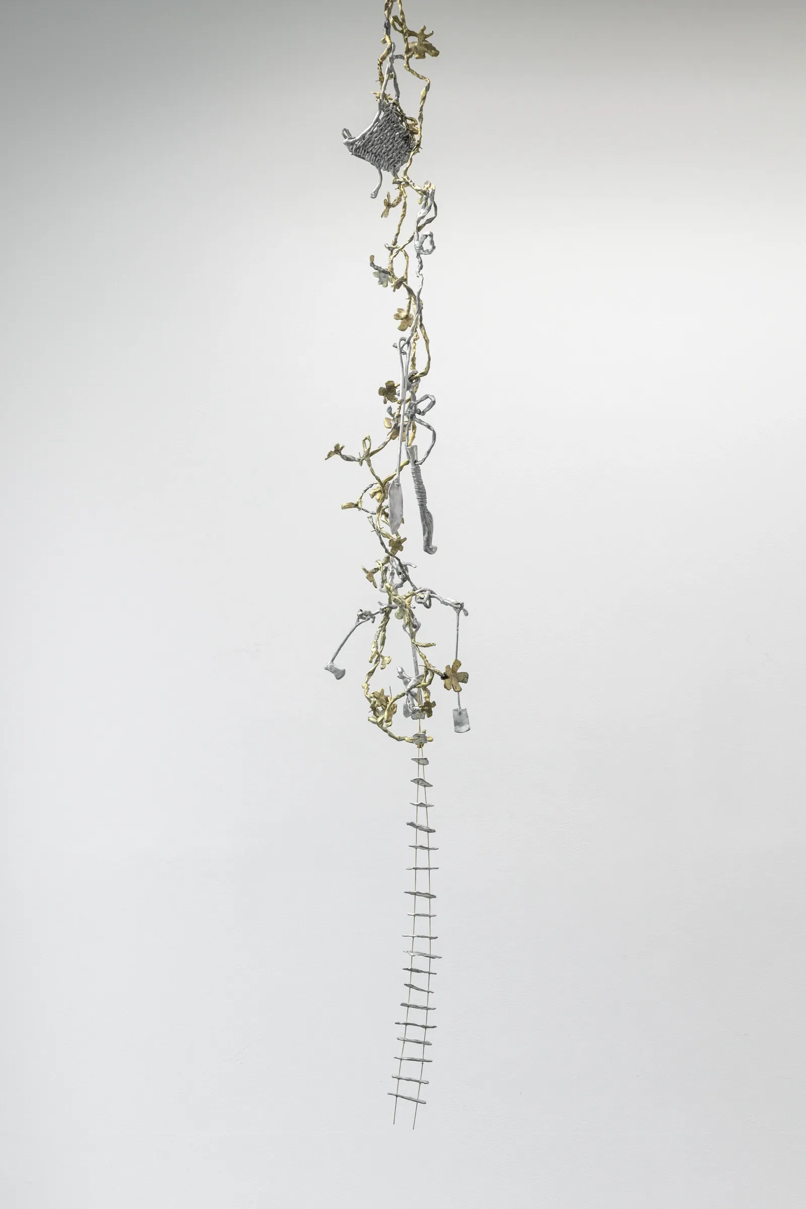 Metals are a key, recurring material that Fox reworks using various techniques. She has developed her own poetic form language, in which she makes open-minded, creative use of the techniques and methods of the artisan, engineer, and artist. She combines various familiar mechanisms and structures, producing something that is evidently intended to elicit new functions and even to attain dreamlike states.