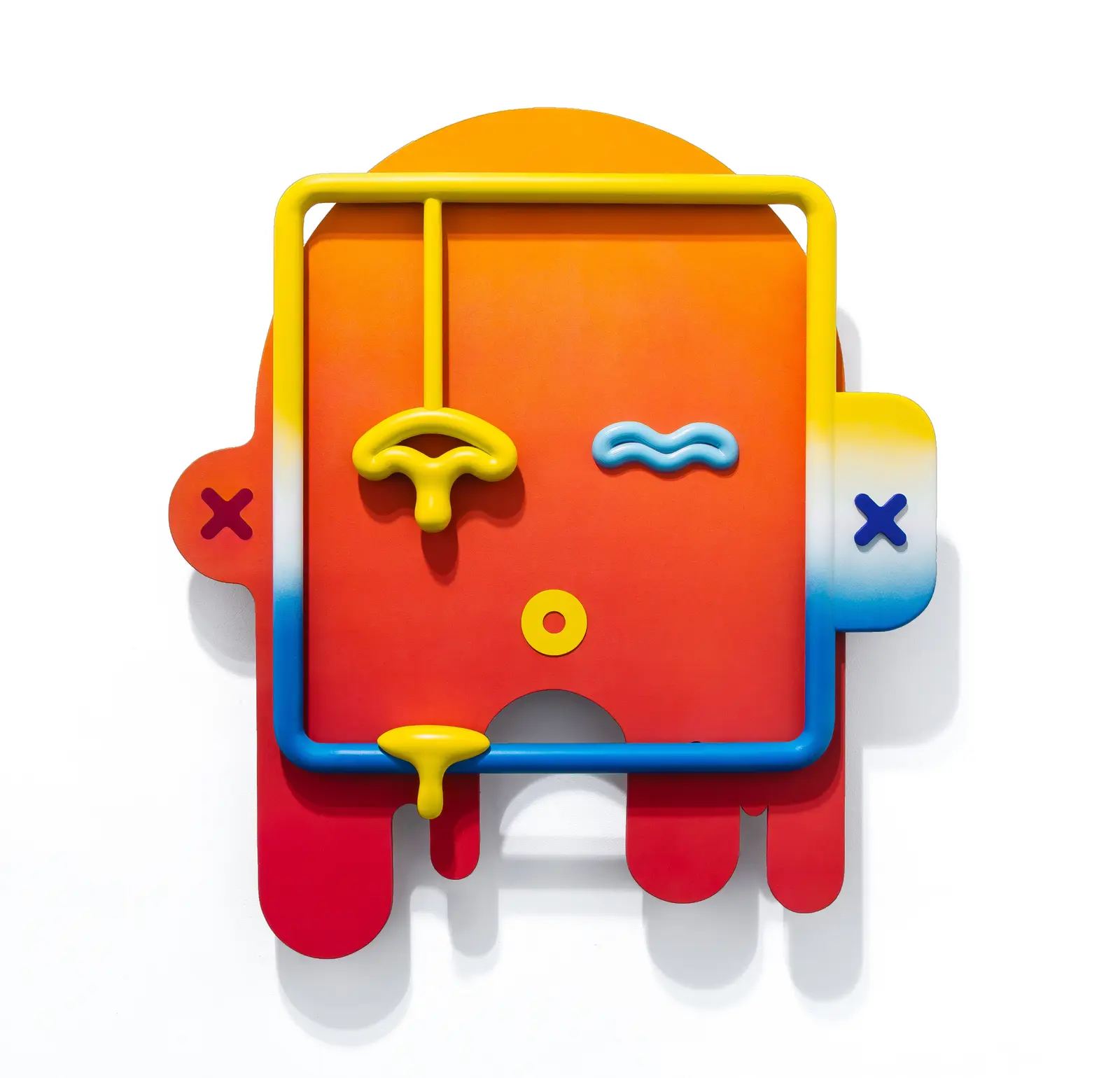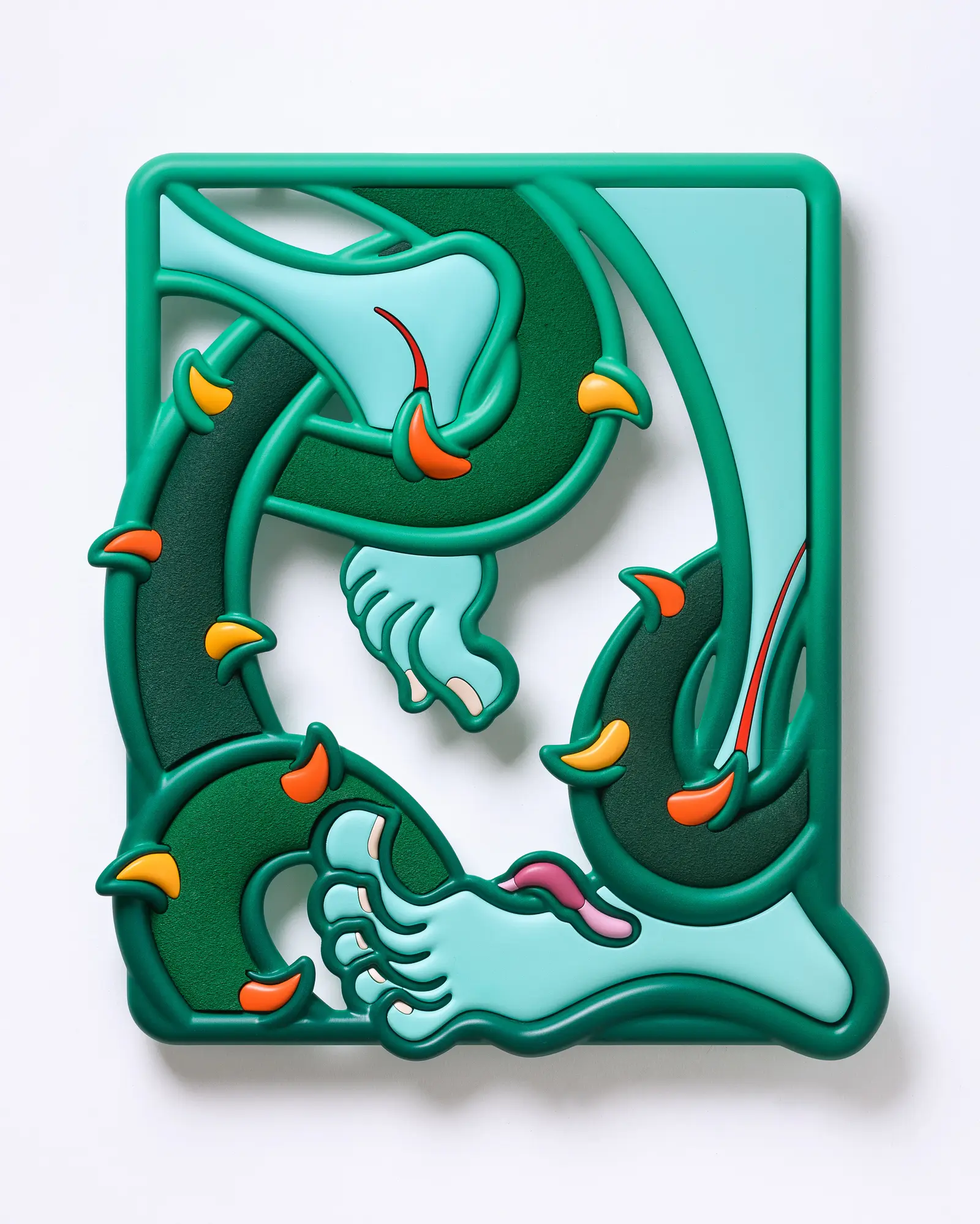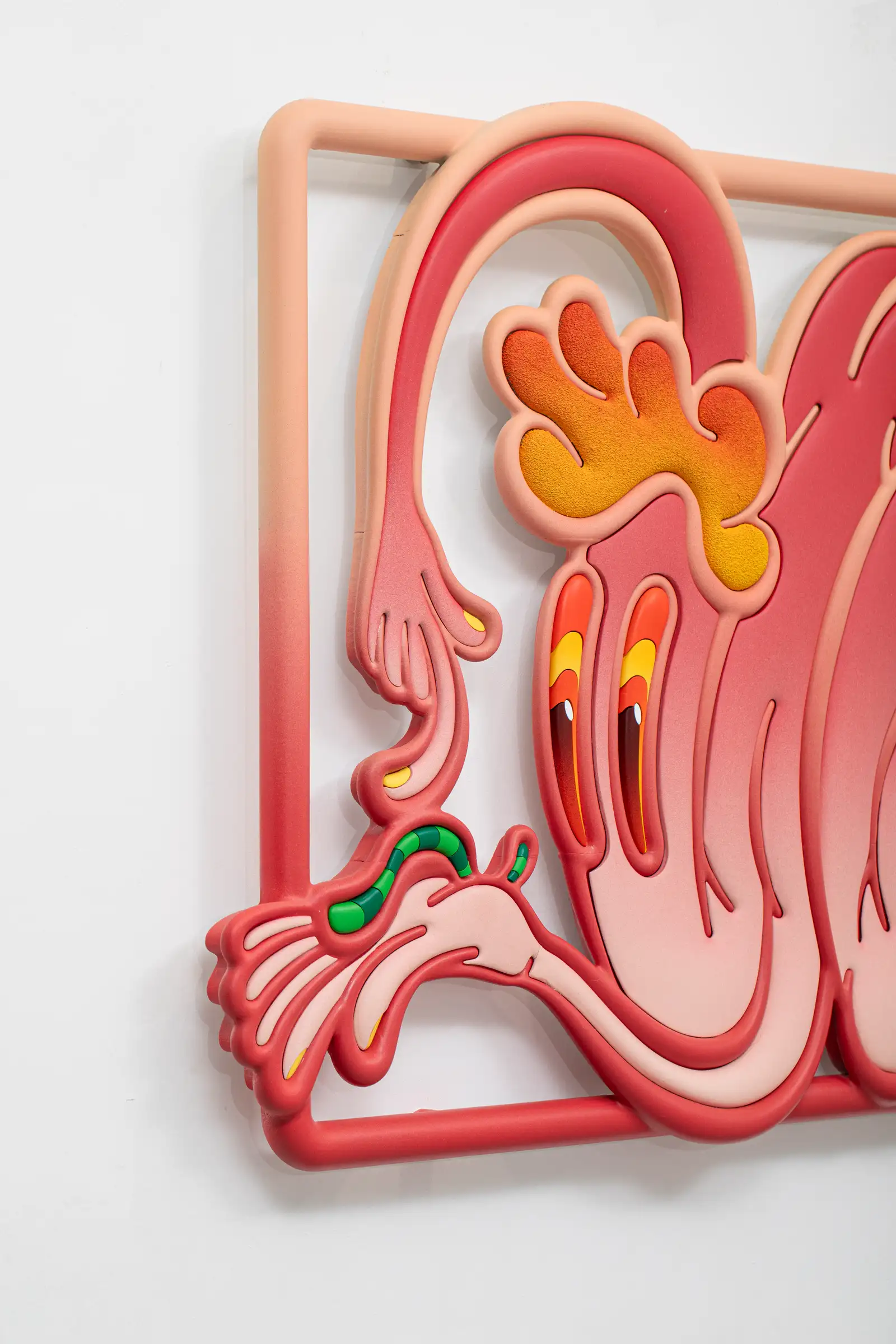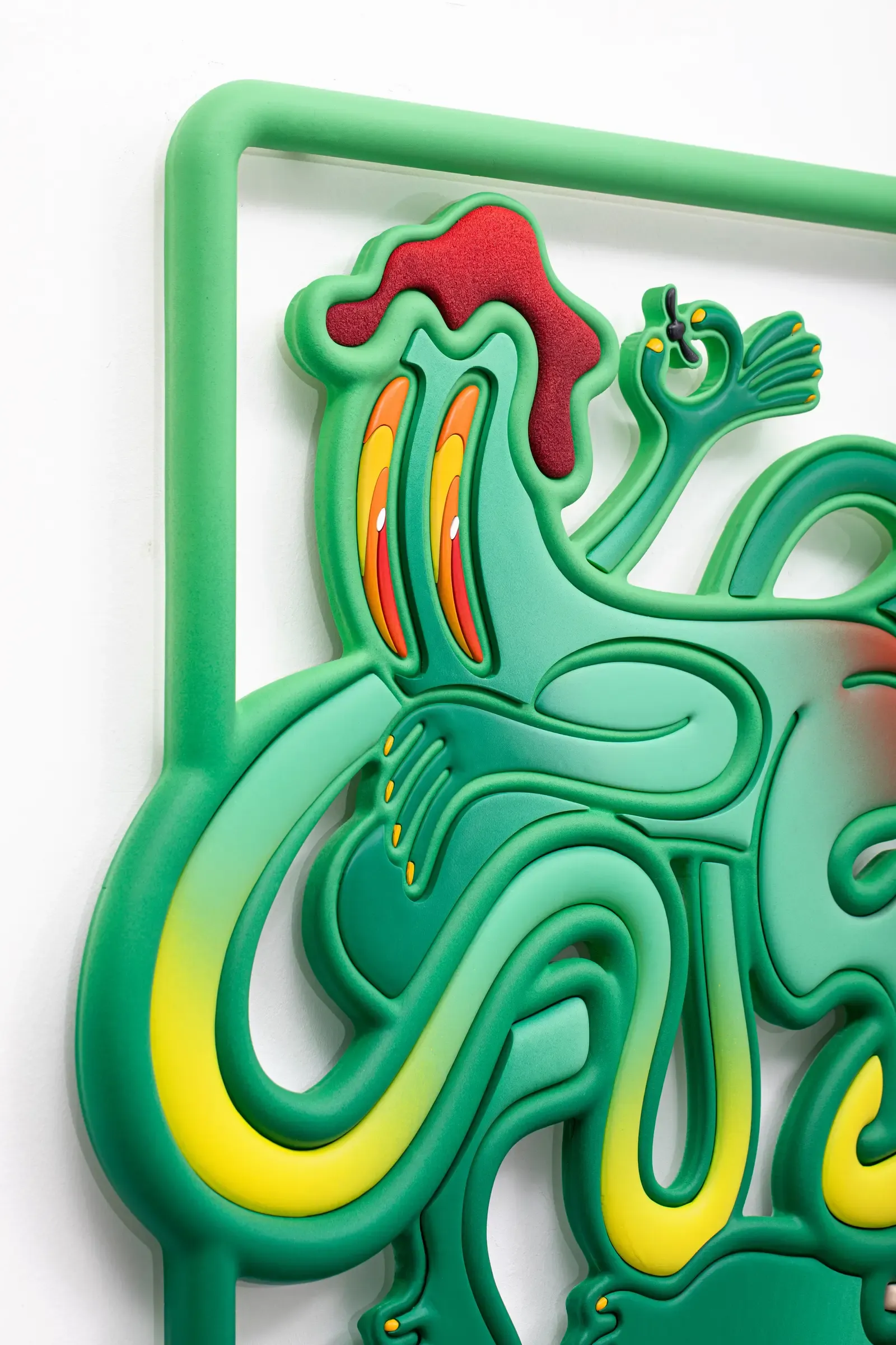 Color plays a decisive role here: saturated gradients and synthetic hues reinforce the artificial nature of the material while introducing a playful, almost disarming surface language.