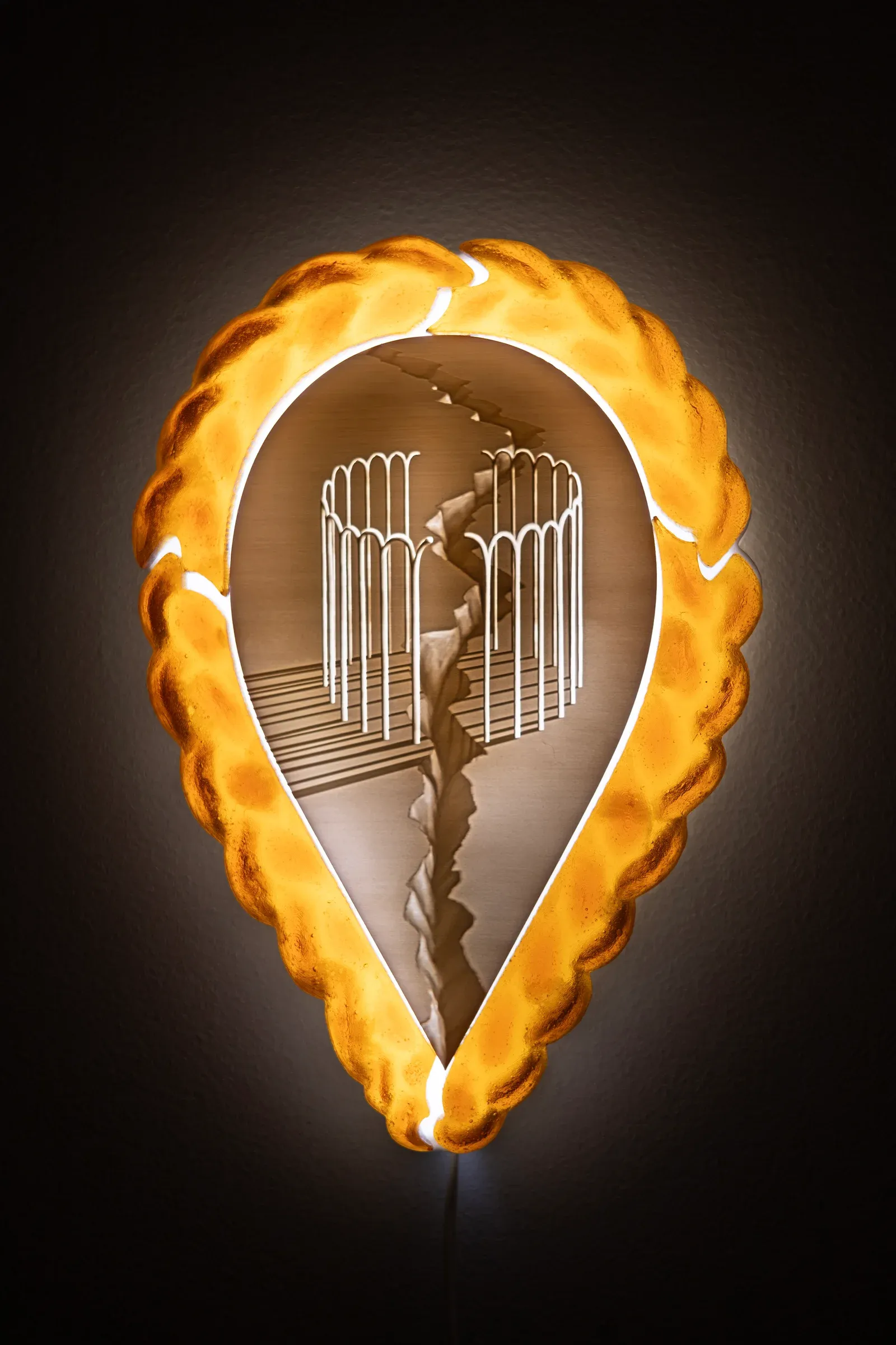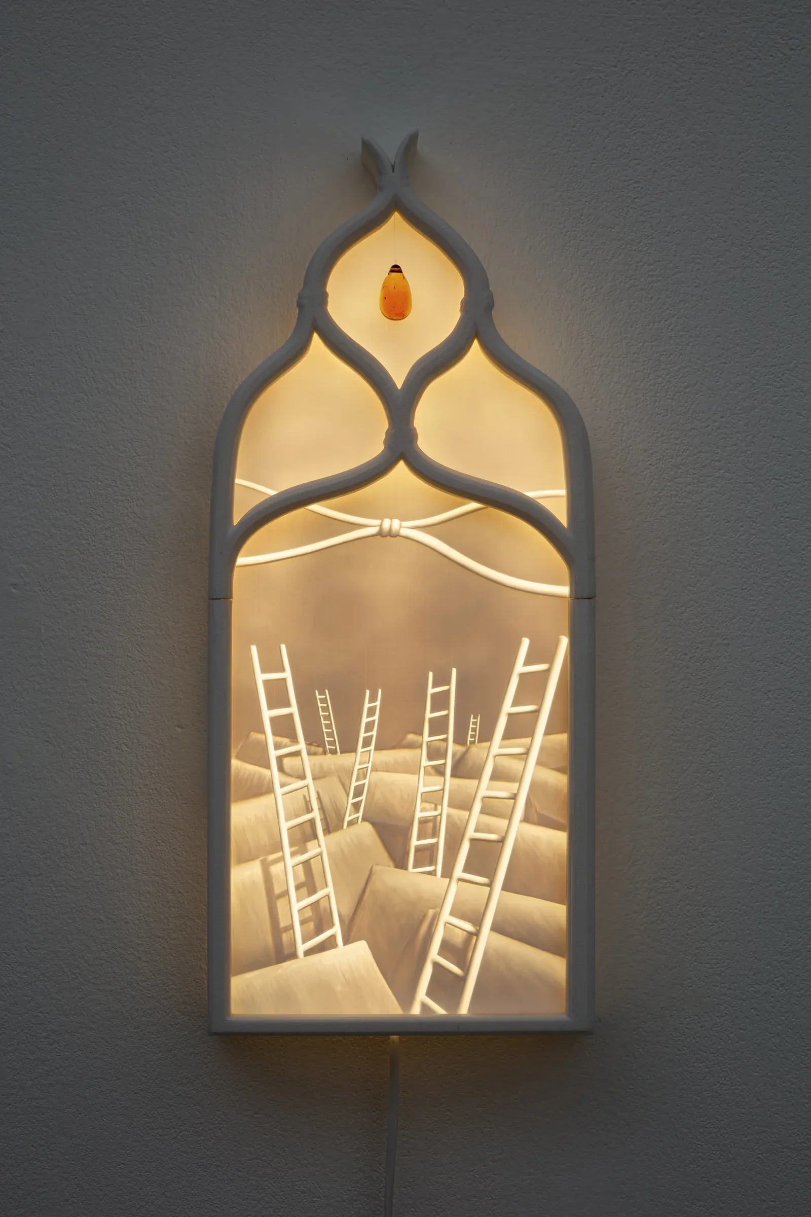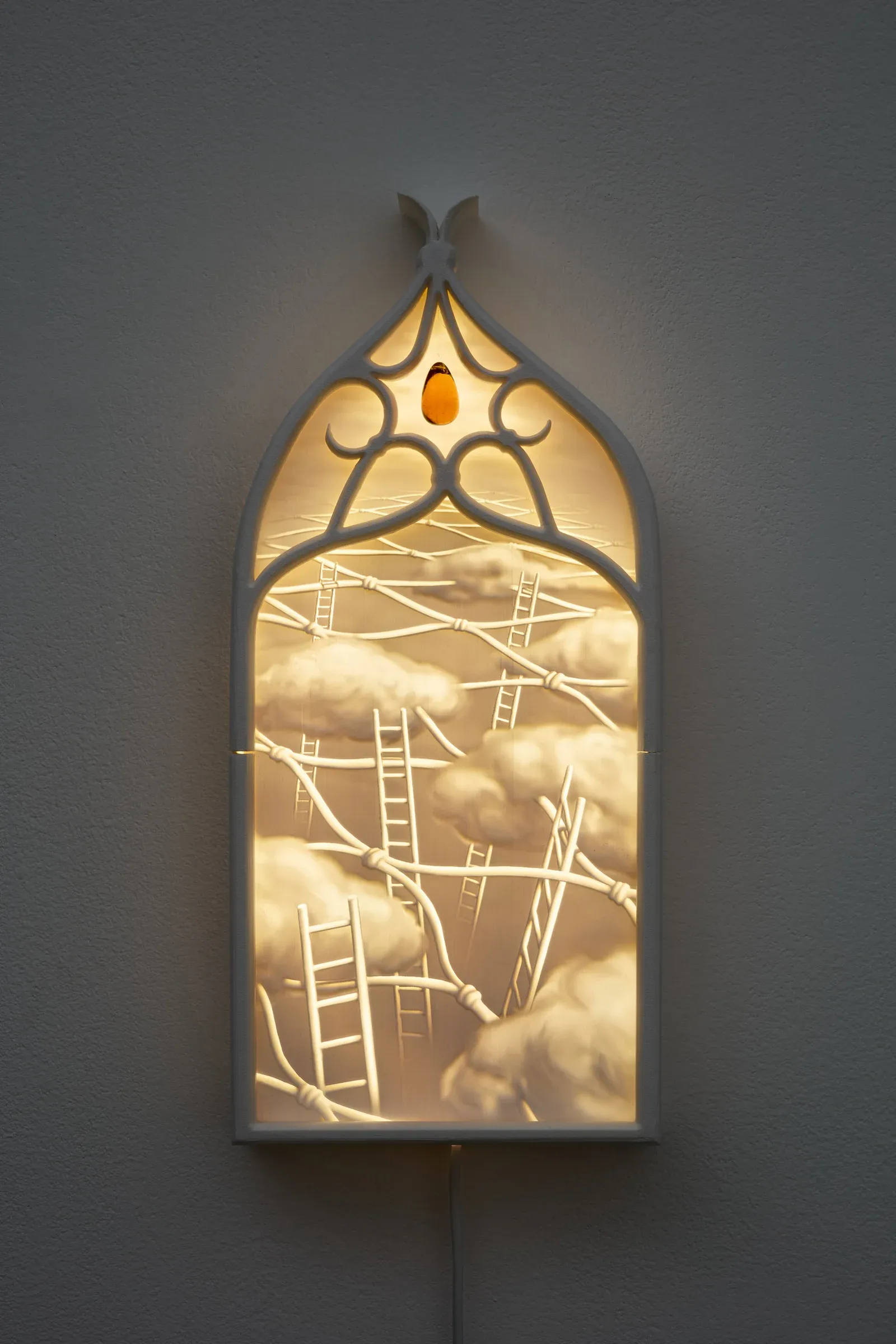 Her work is grounded in research into 19th-century visual techniques, particularly lithophanes as early light-based mass media. By translating her digital drawings into backlit, three-dimensional objects, she turns light itself into a carrier of meaning, belief and control. Screens, nets, enclosures and architectural fragments recur as structural motifs, linking historical forms of power to today’s algorithmic infrastructures.