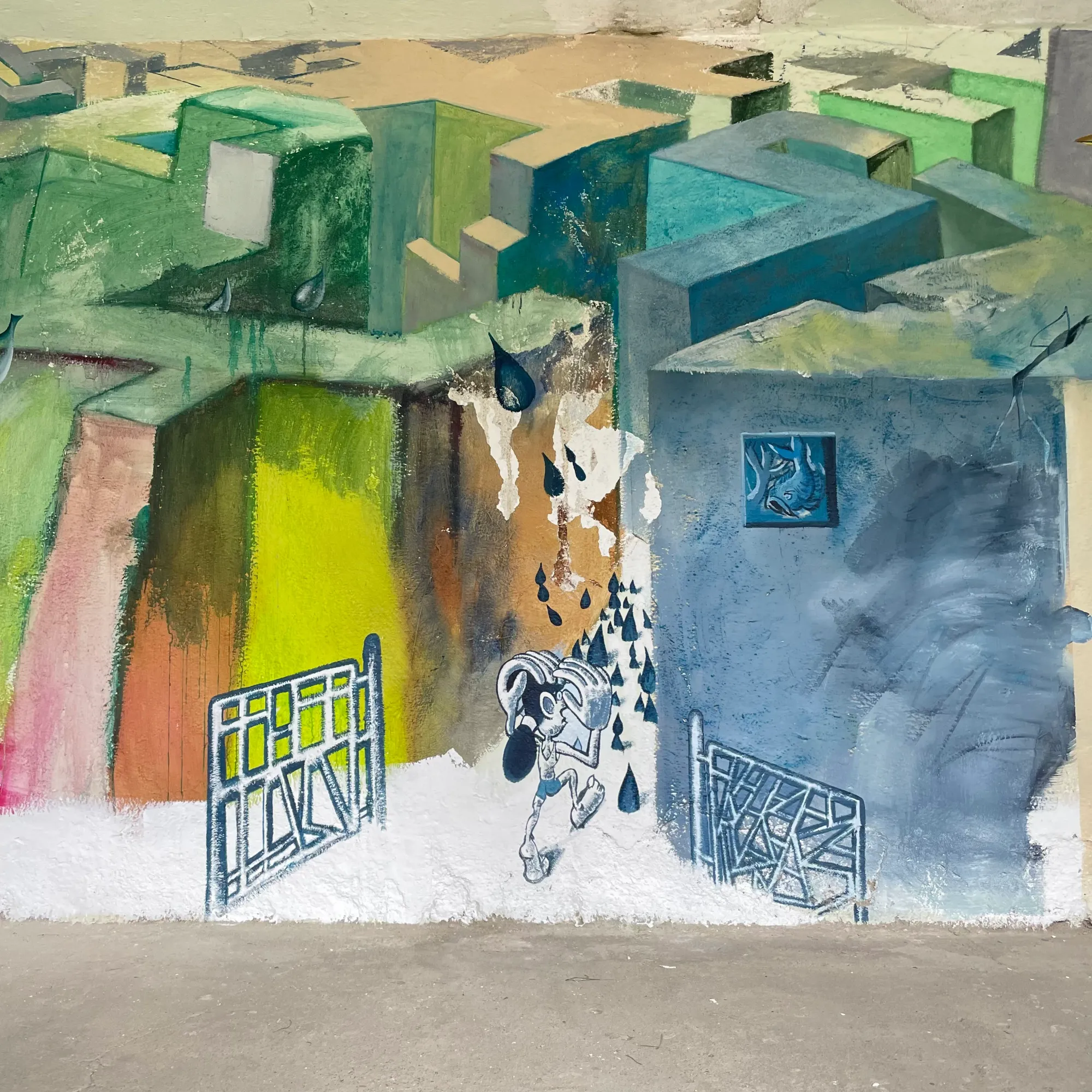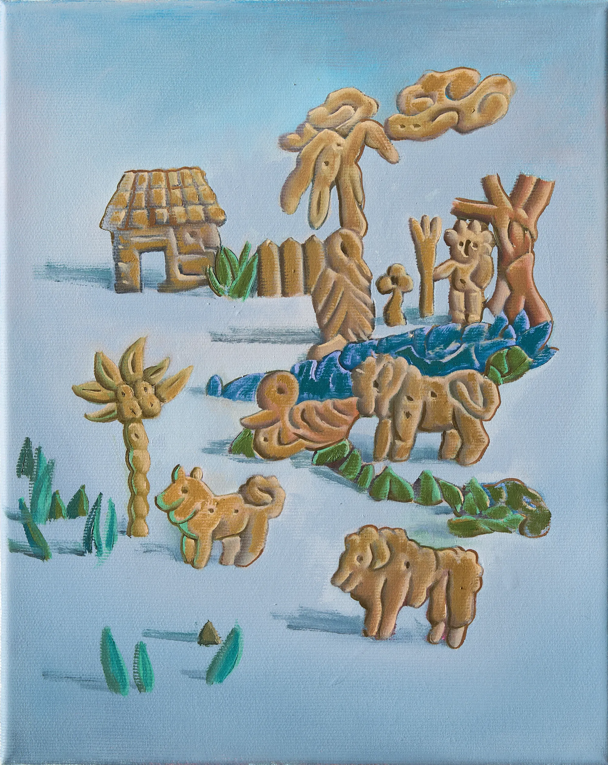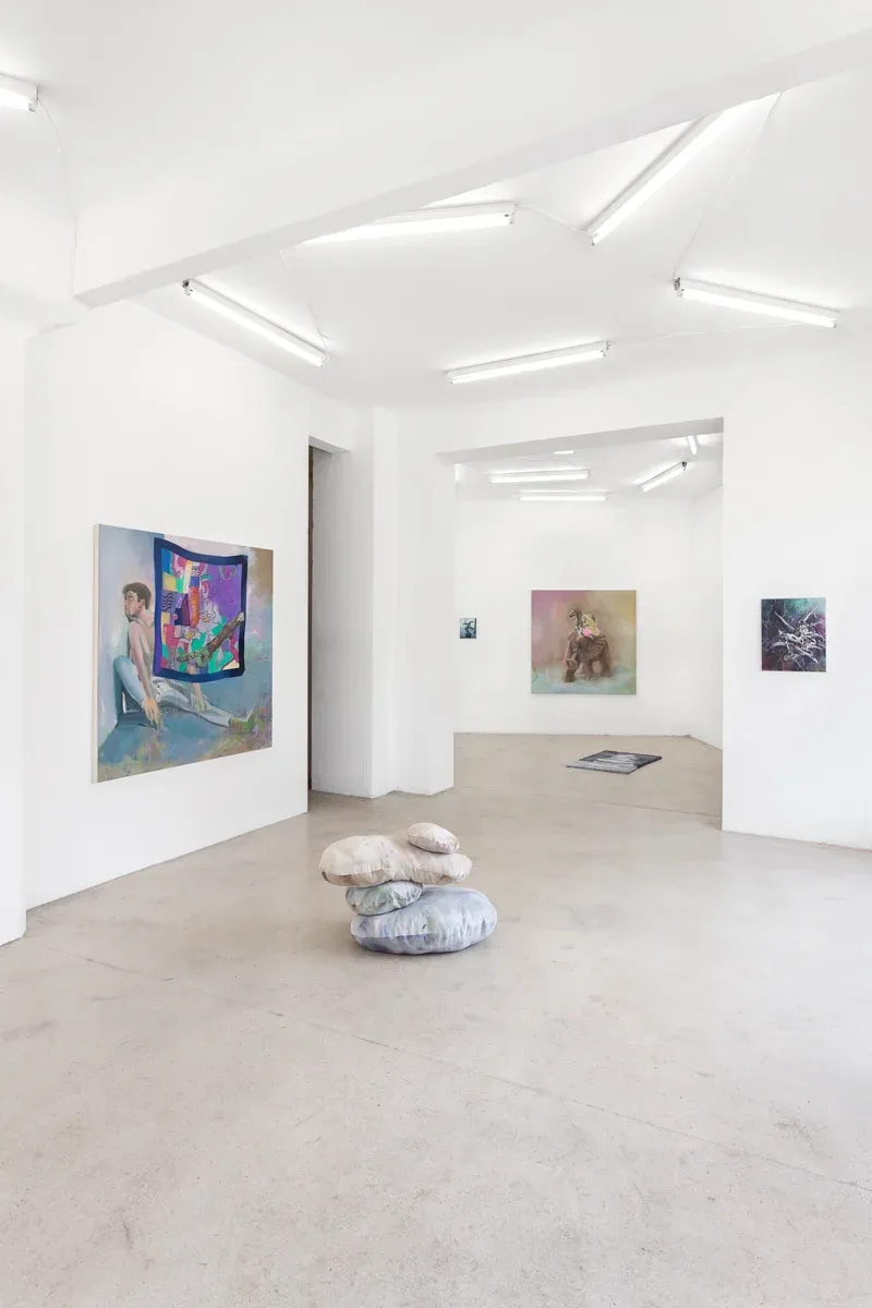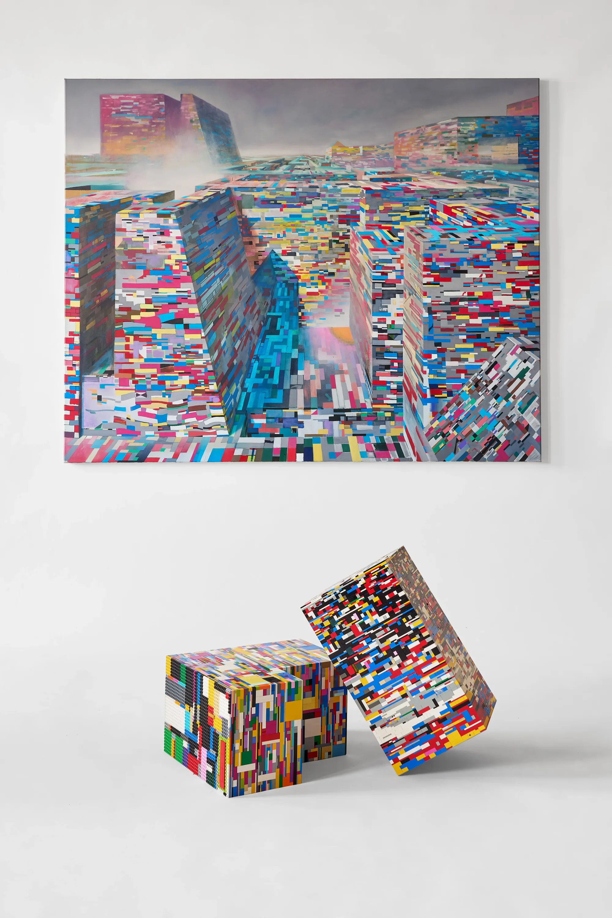 Alongside the canvases he produces objects and installations that extend this stage feeling into space: modular cube sculptures with pixel-pattern surfaces that echo the Real Estate logic, wooden paired animal forms from 2024, and site projects such as FREMDTEILCHEN and the Podelwitz bus stop wall painting.