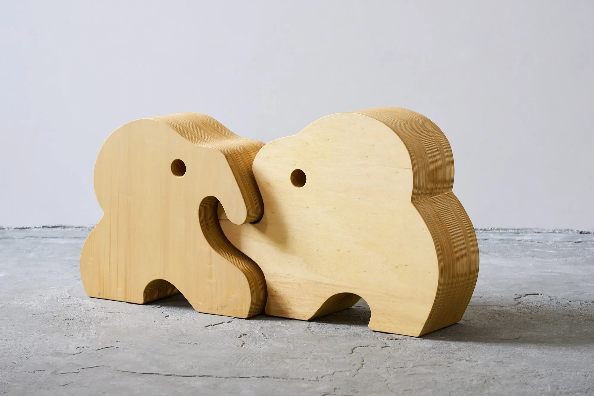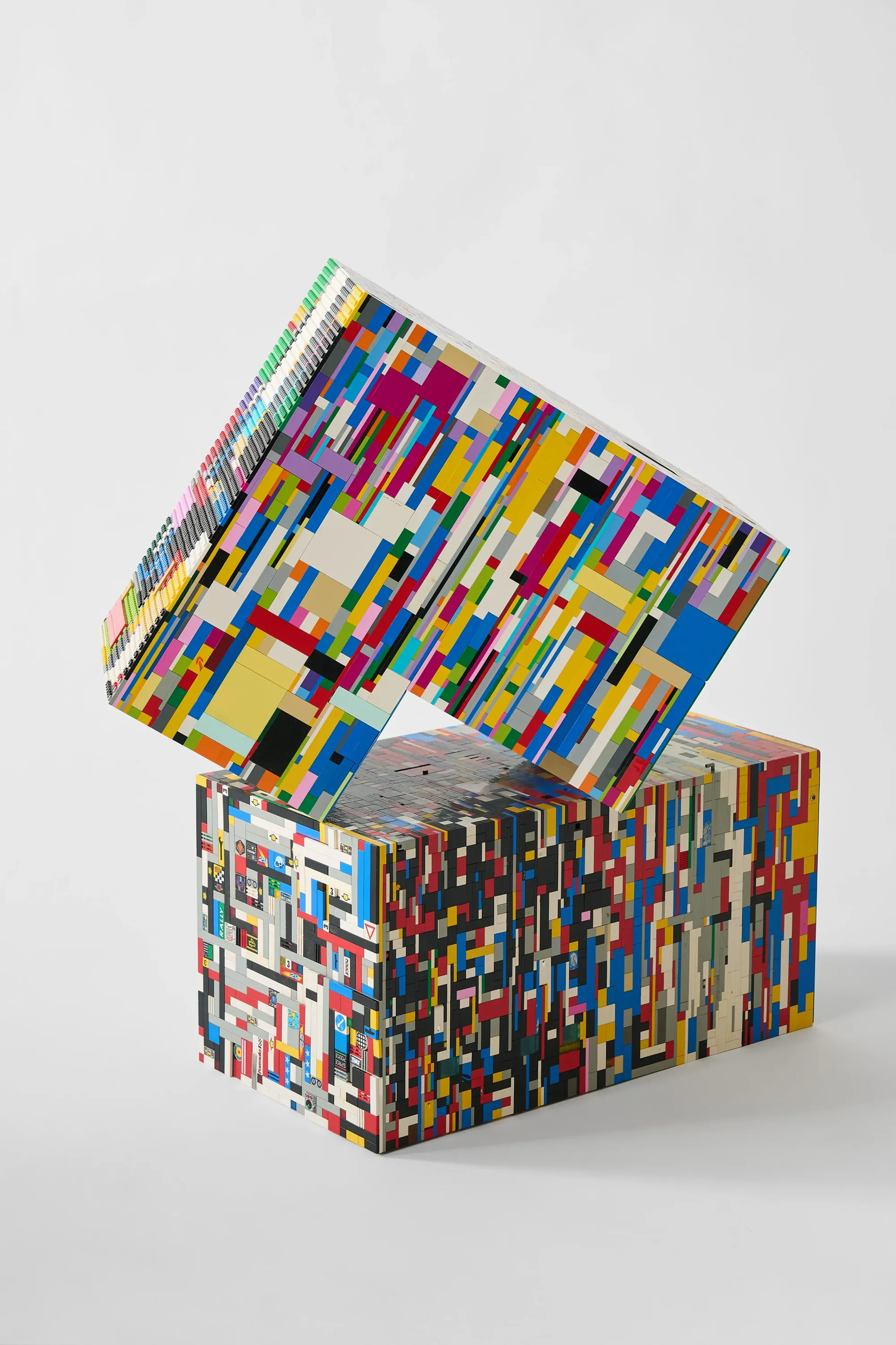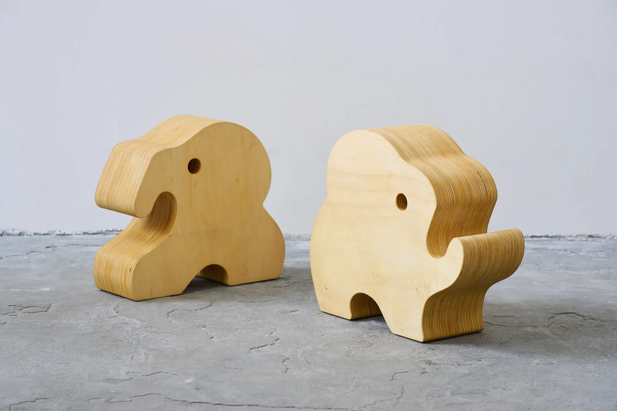 Alongside the canvases he produces objects and installations that extend this stage feeling into space: modular cube sculptures with pixel-pattern surfaces that echo the Real Estate logic, wooden paired animal forms from 2024, and site projects such as FREMDTEILCHEN and the Podelwitz bus stop wall painting.