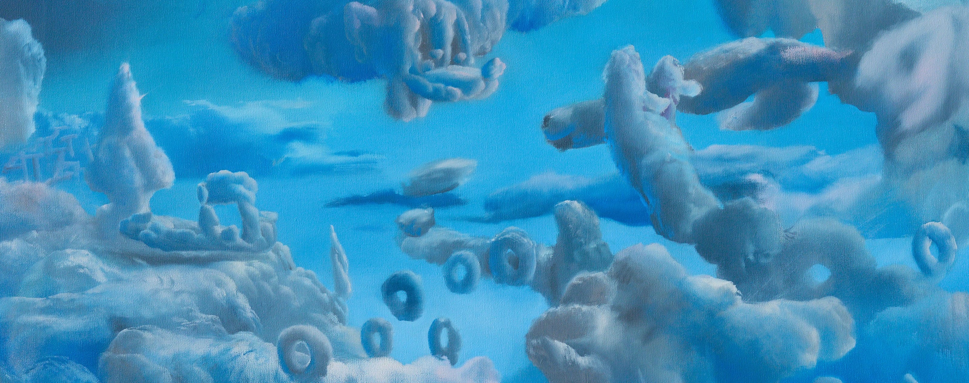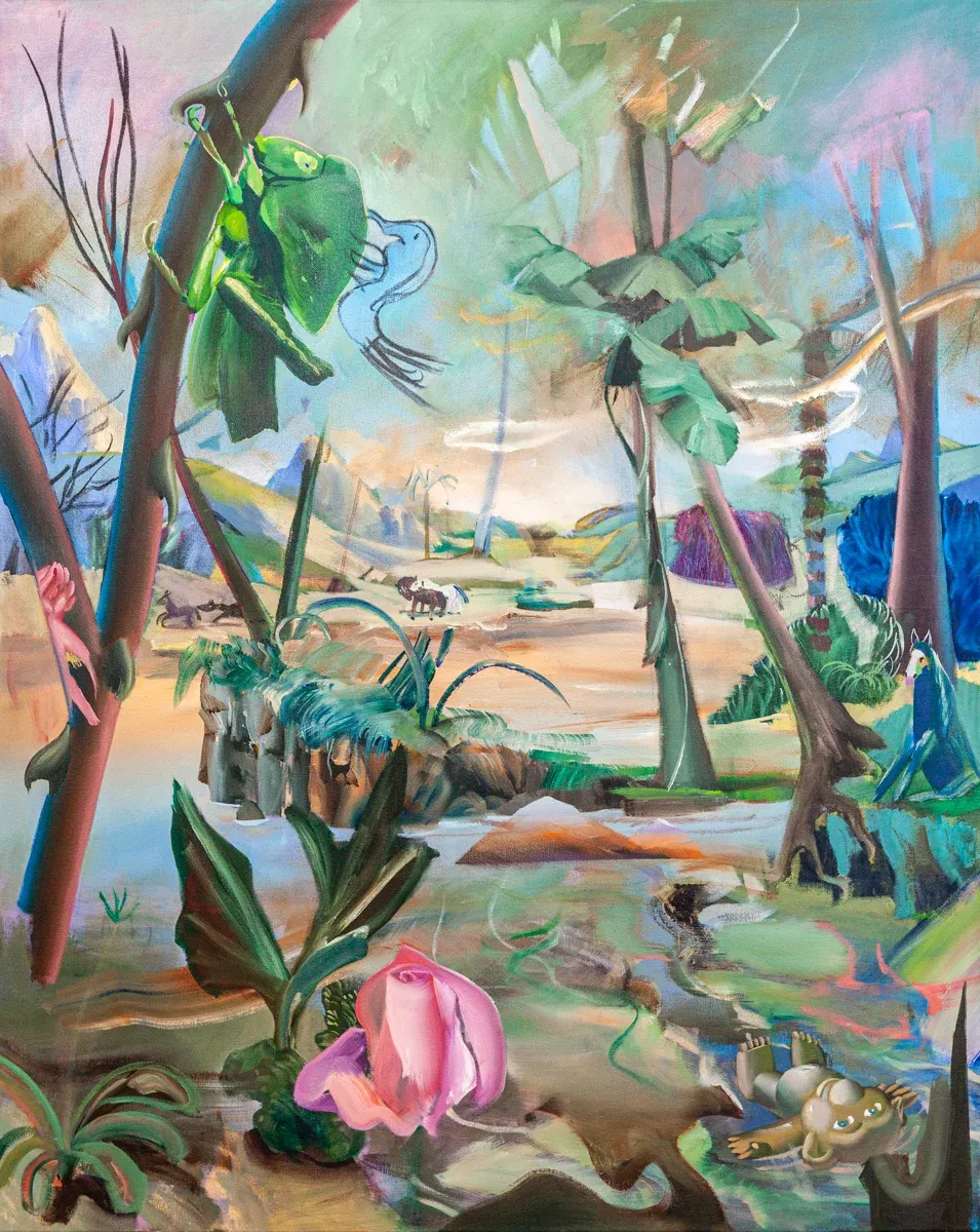 At first glance the paintings look playful: party fragments, travel signs, toy architectures, cartoon fauna, bright skies.