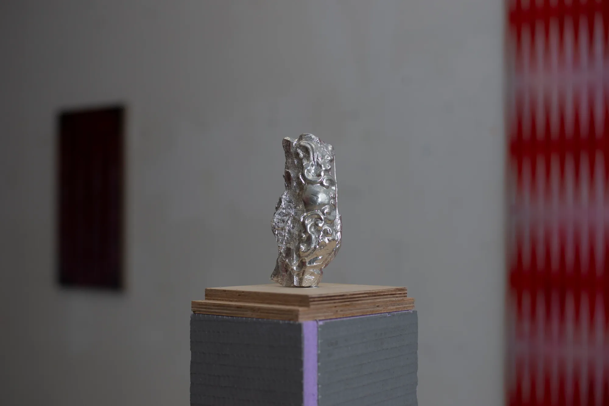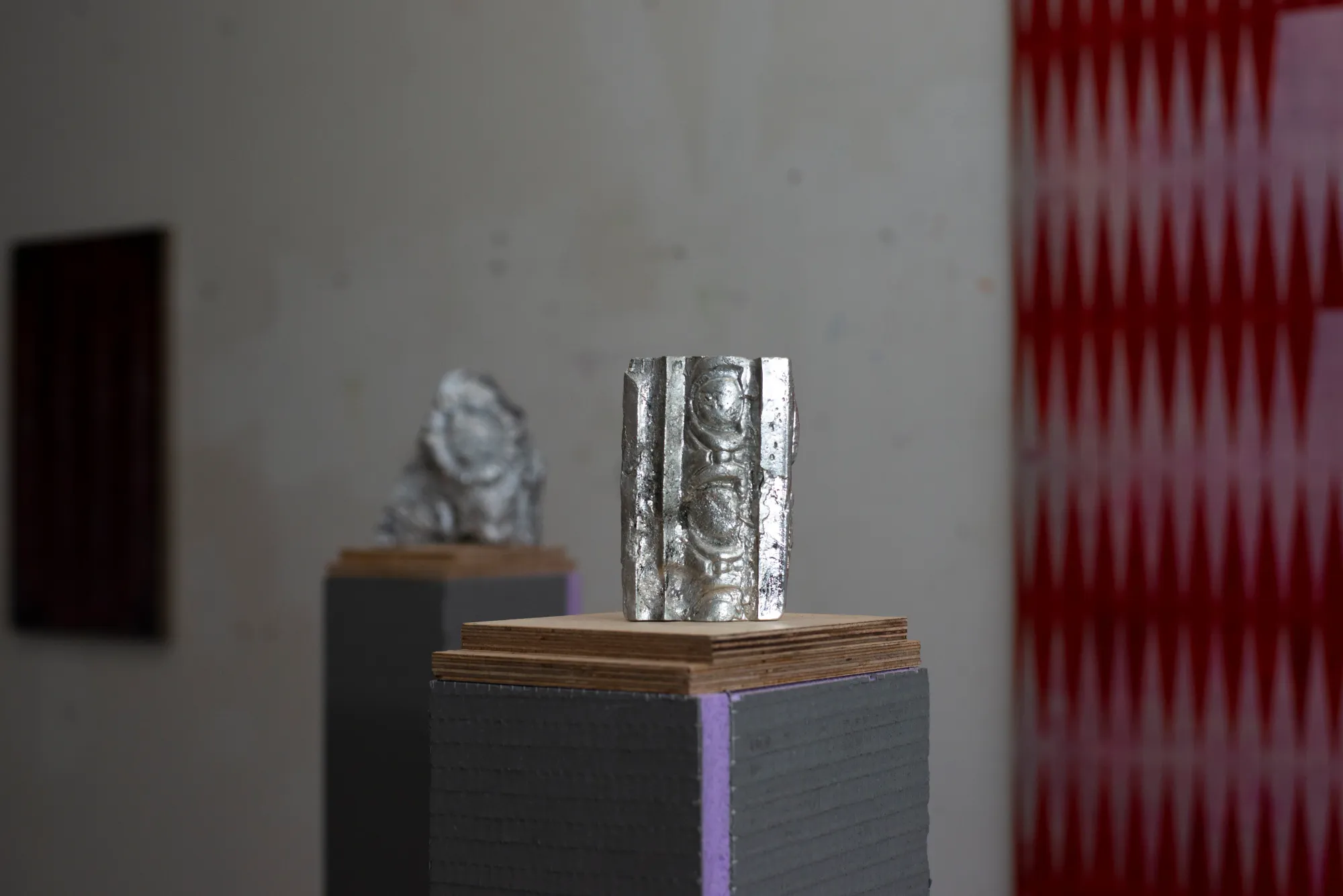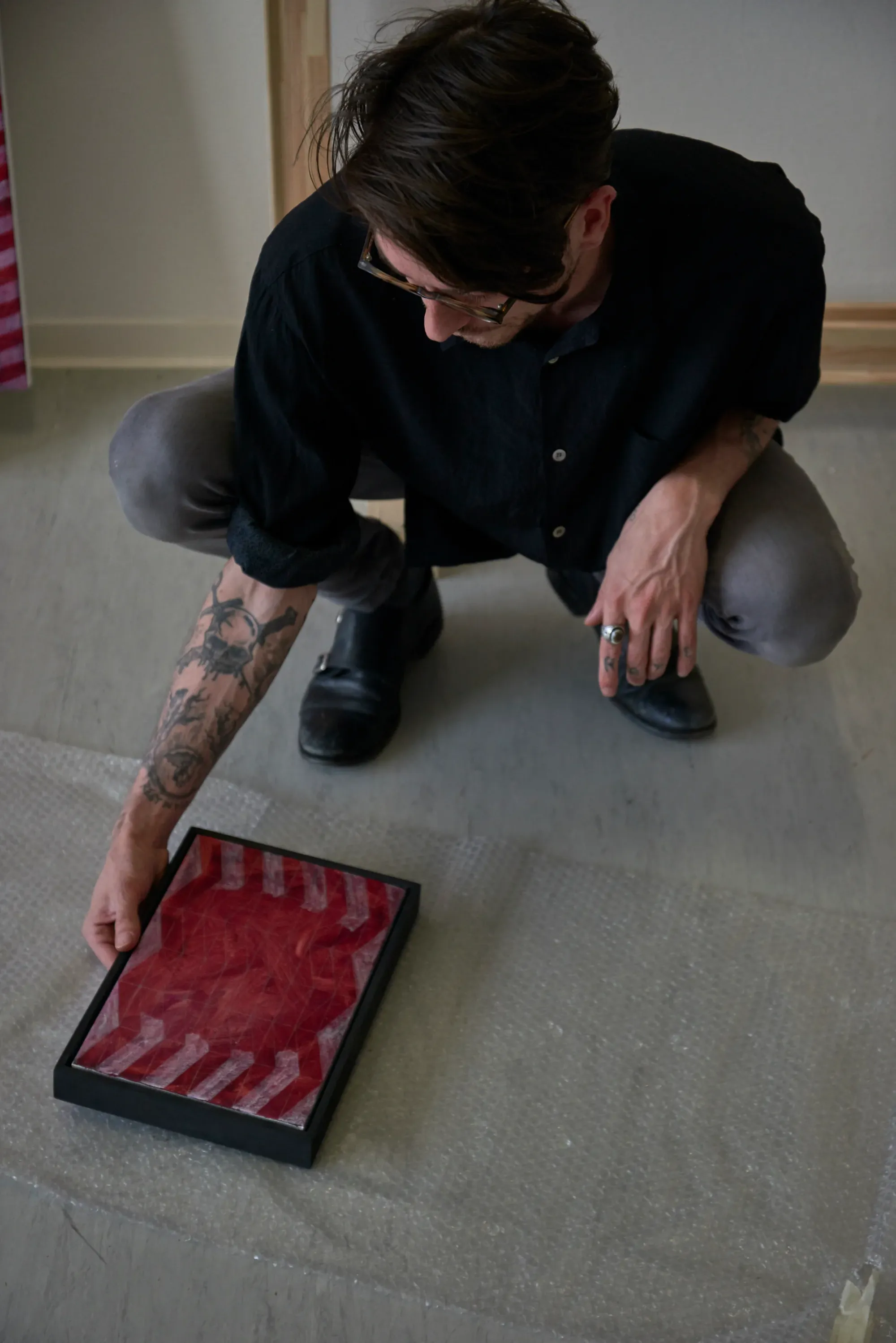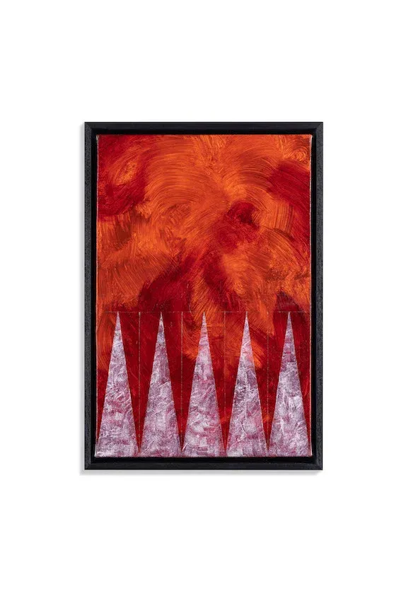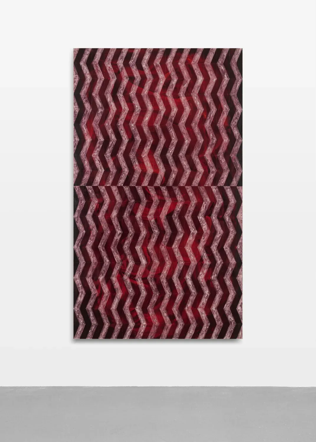The paintings stage a persistent tension: instinct versus law, reality vs depiction, weather versus diagram. First layers in red behaves like climate, mother-of-pearl like a cooled skin laid over heat.