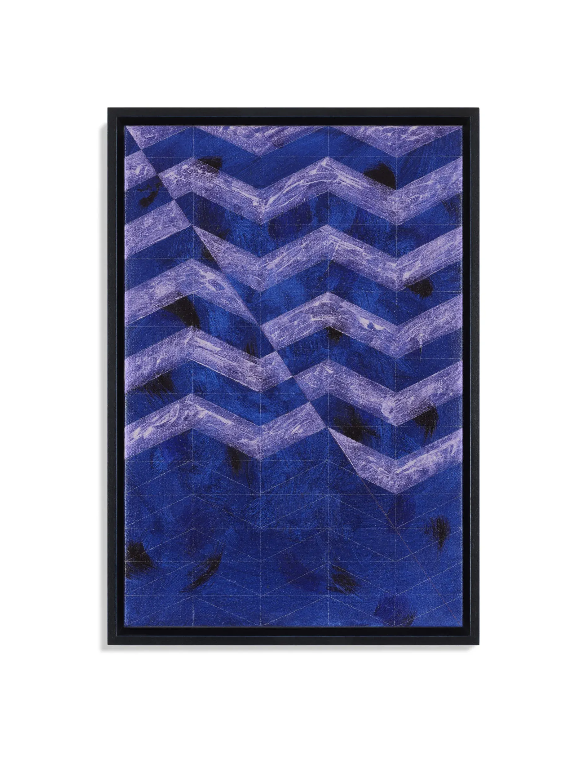 Each painting unfolds in three moves: a stormy ground in oil; a measured grid drawn onto the paint; a final layer that fixes the pattern while letting the ground show through.Made with mother-of-pearl or colour this last layer is „filling the system“, changing the final image even if the same patterned is used twice.