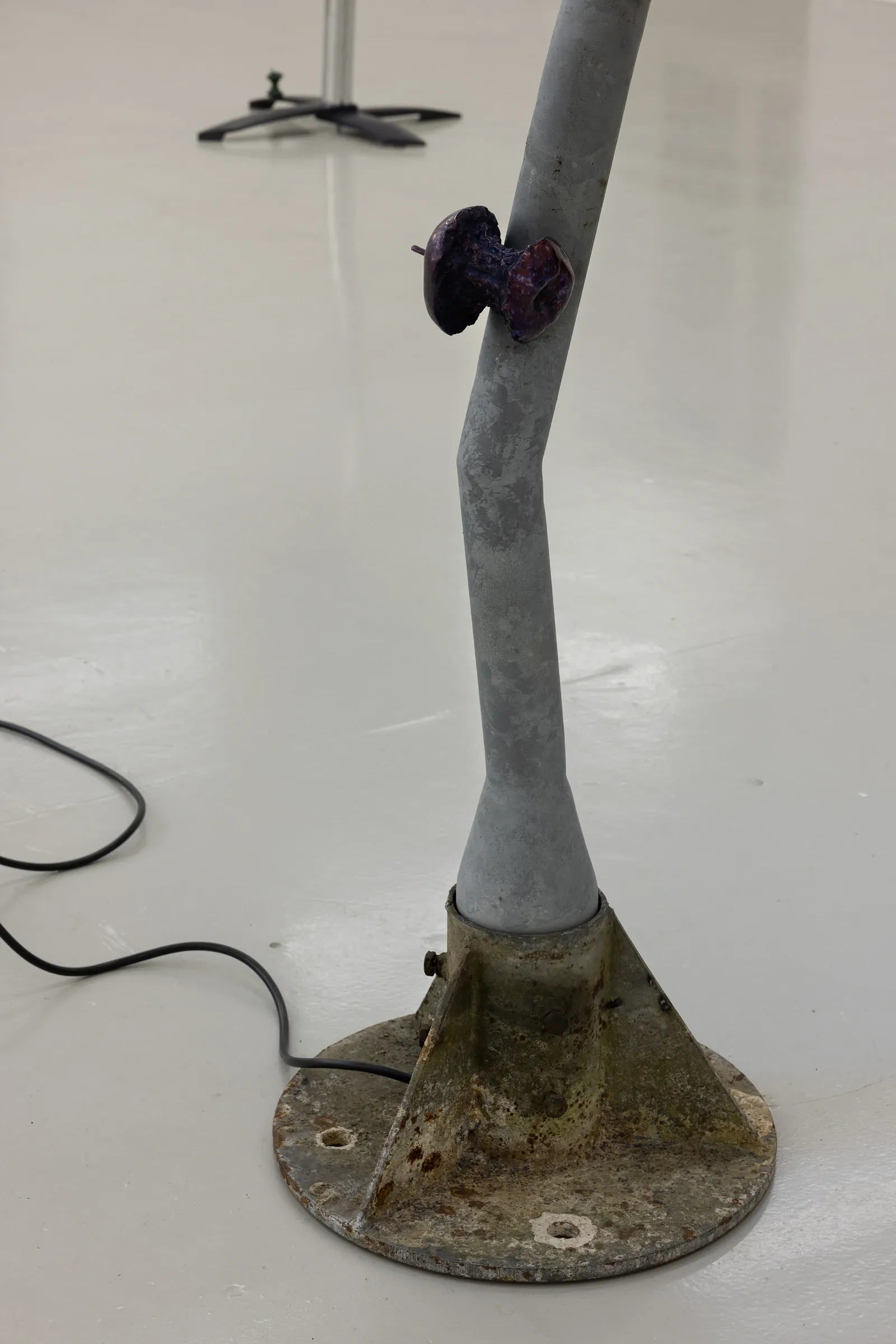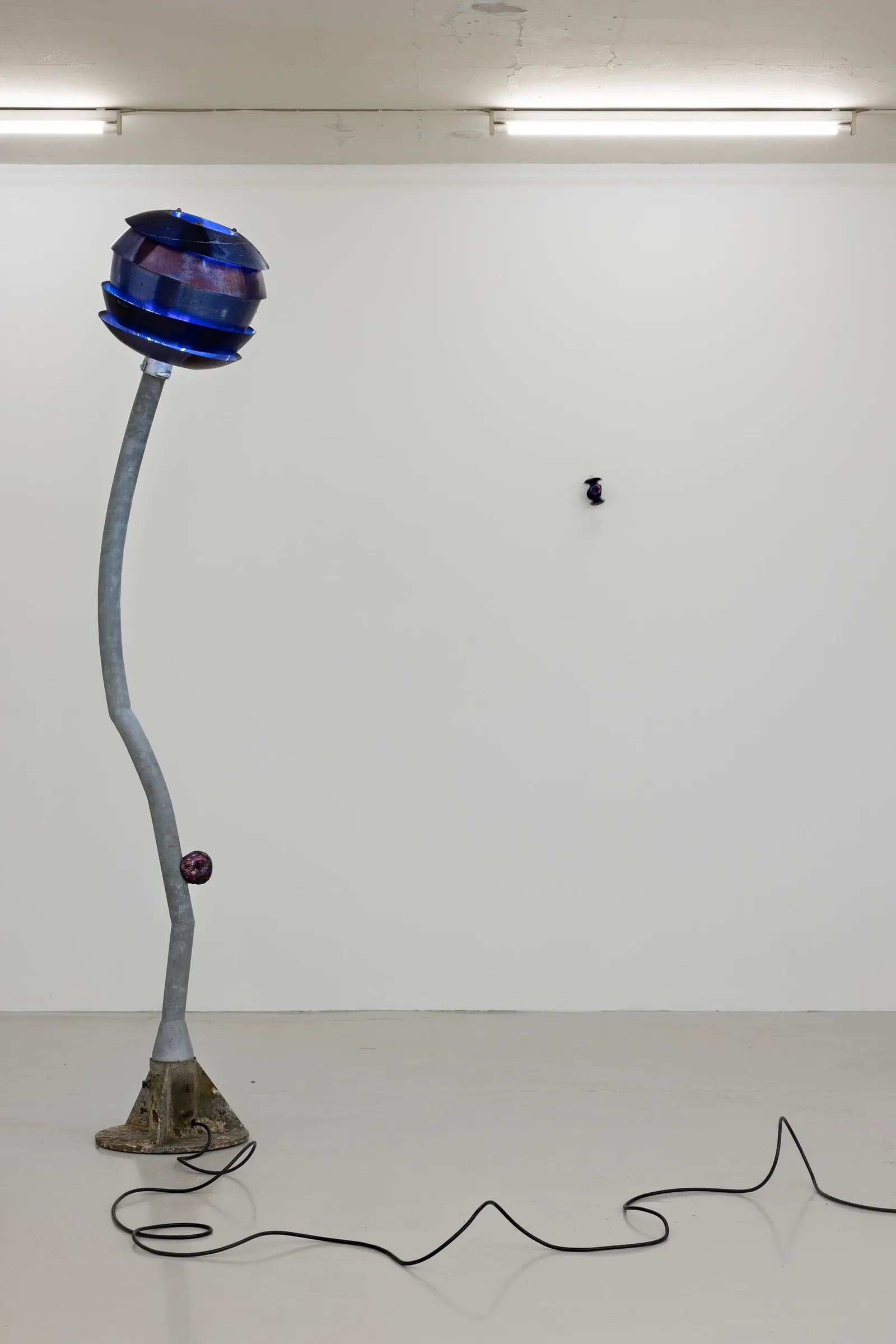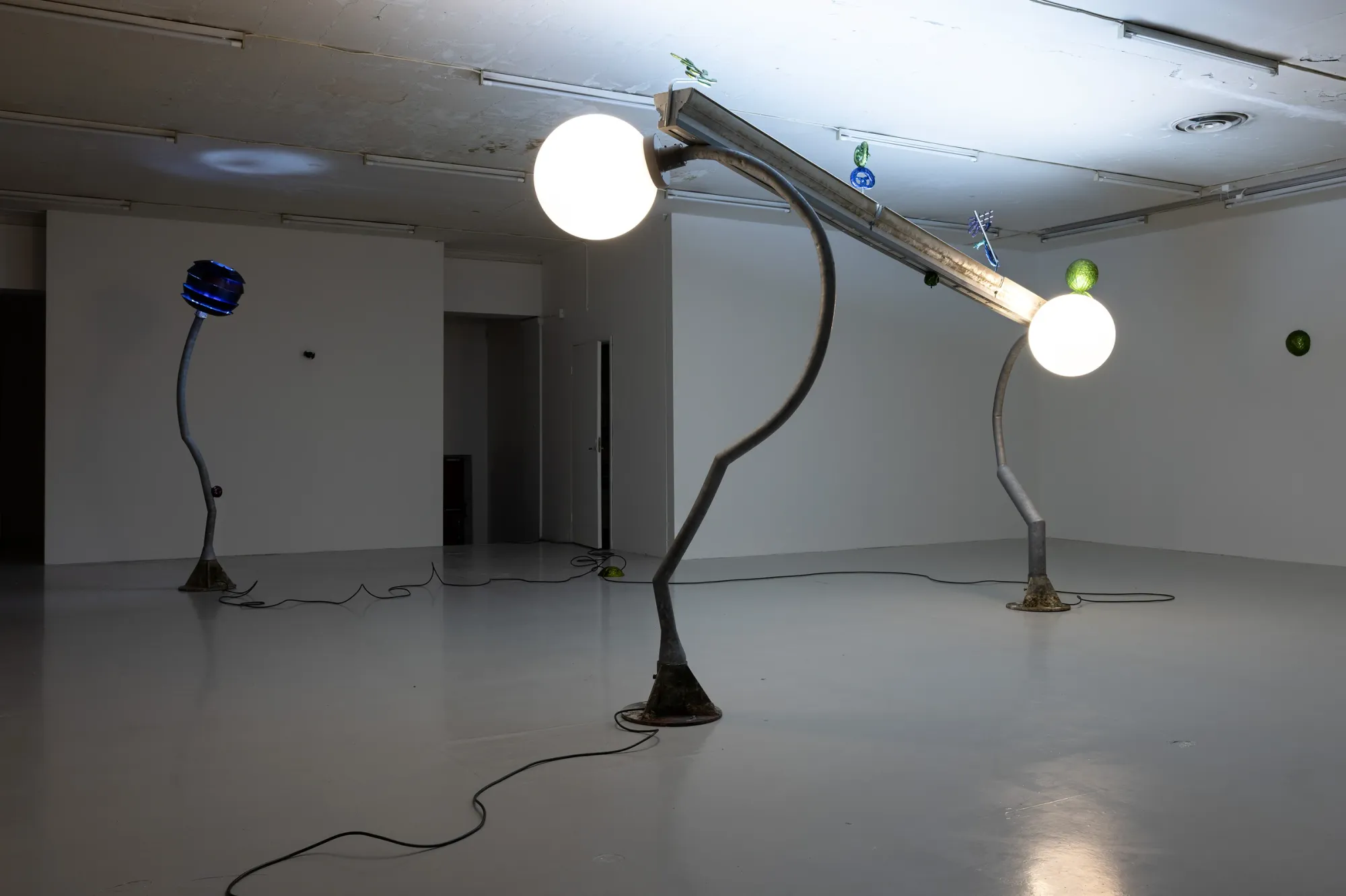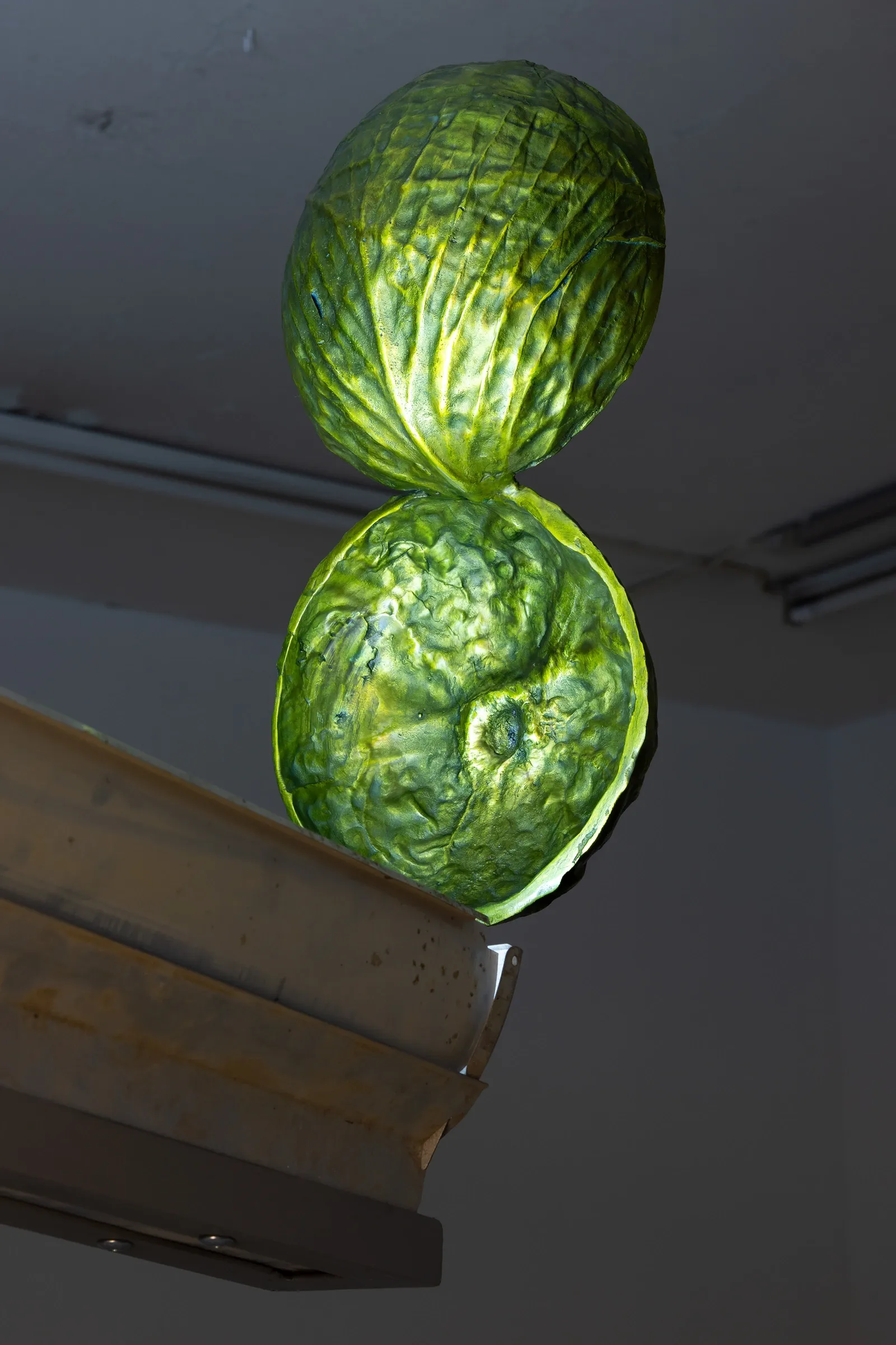 In the exhibition Worker Ant After Work , we encounter depressed, freelancing and unemployed lampposts, standing with their posture broken, hunchbacked through day and night. A cocktail table resembles solar panels made of cabbage. When sliced open, the cabbage evokes x-ray images of brains.