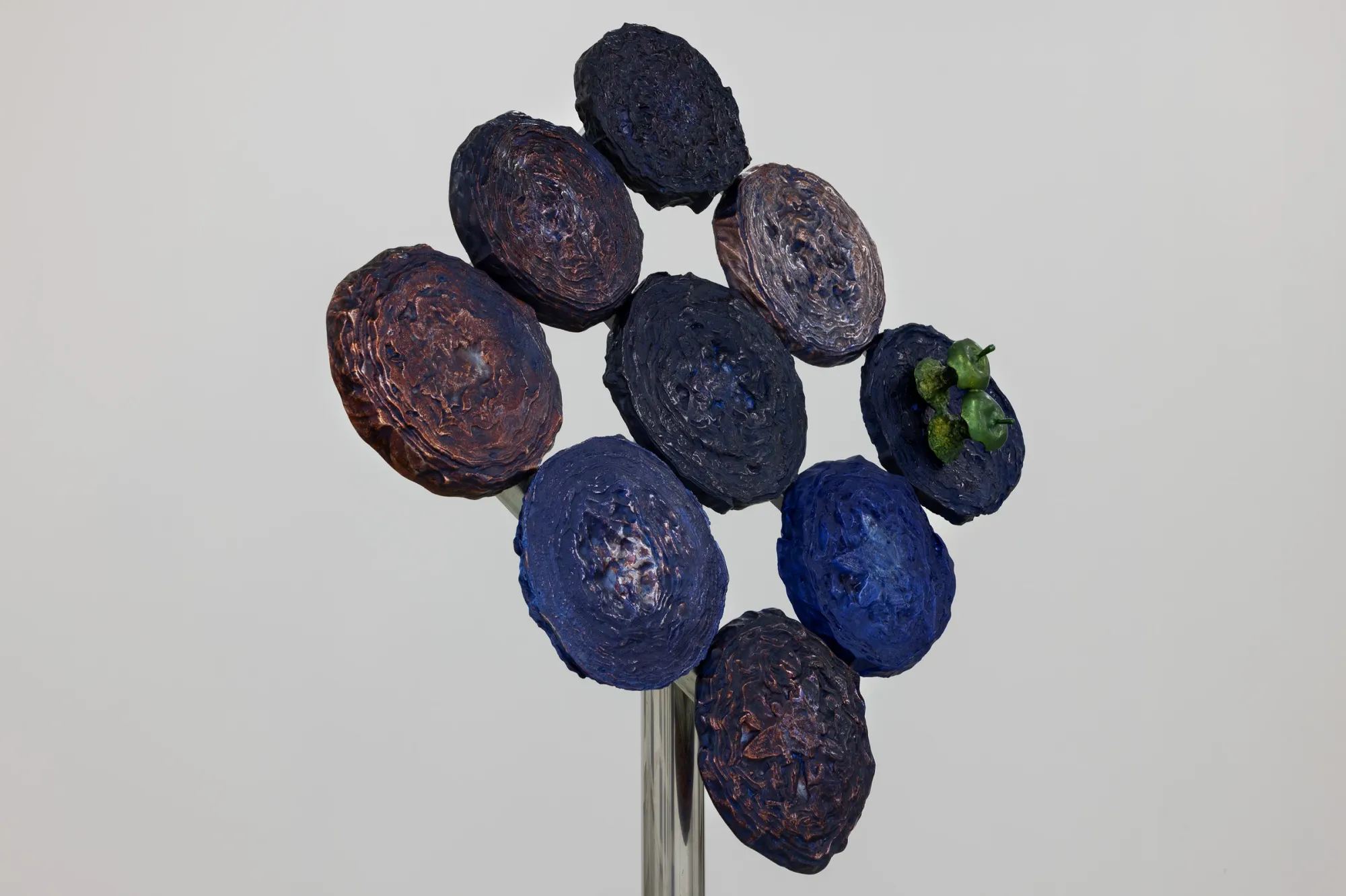 Found aluminium is cast into sculptures of everyday supplies, placed in an electrified acid bath and boiled in a vat, which have dyed them red and green. Thisresource-conscious refinement process recurs in multiple forms associated with Sumari’spractice: the fermented cucumber, the cabbage shredded into sauerkraut, the pretzel boiled in lye––somewhat dull, everyday symbols that reach beyond the present.