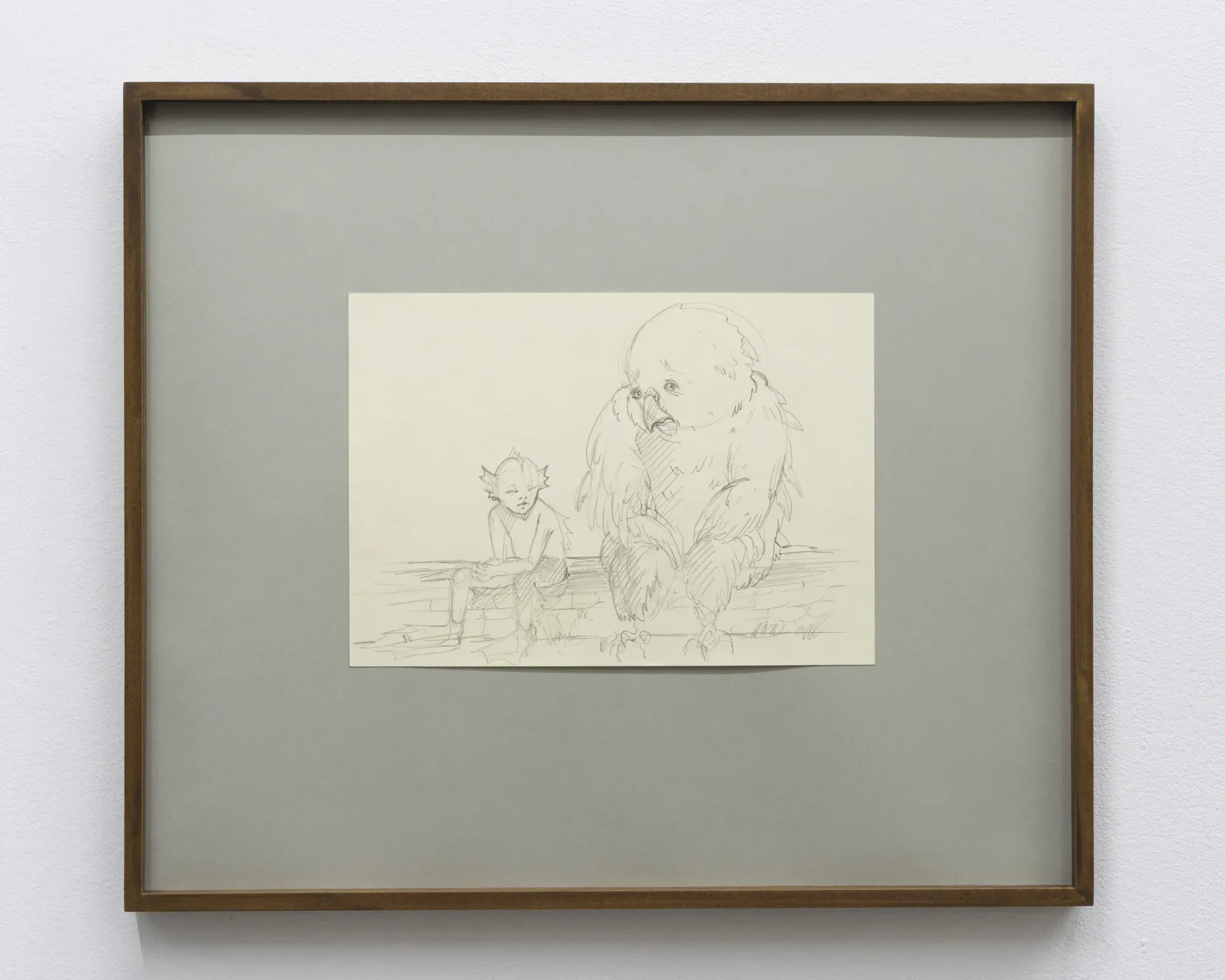 The exhibition concludes with La colpa, a graphite drawing that brings a parrot into proximity with a triton from earlier bodies of work. The encounter feels tentative and intimate.