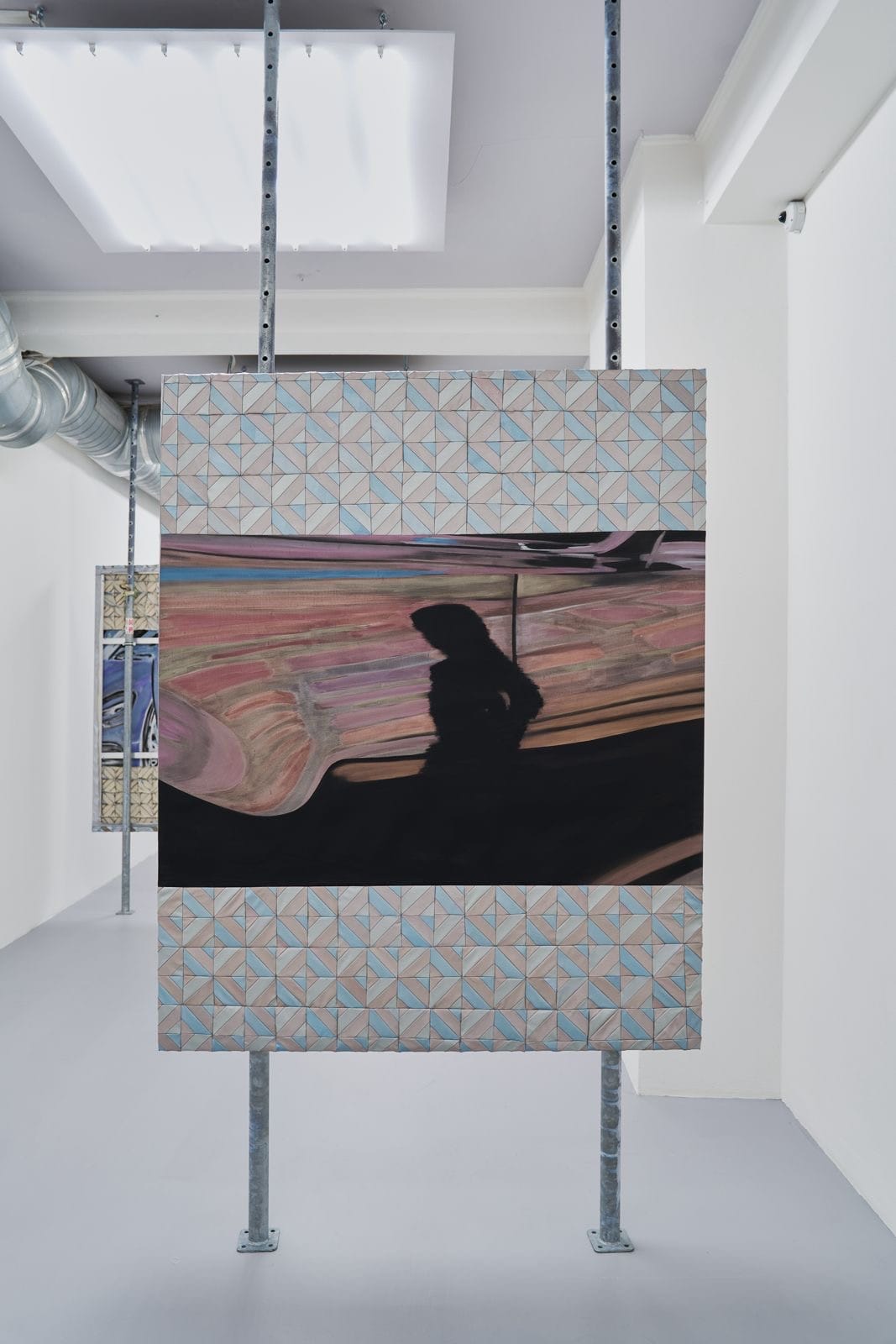 The patchwork textile borders surrounding each canvas carry the formal logic of the exhibition in concentrated form. Assembled from monochrome geometric segments, triangles and chevrons, in iridescent rose, beige, steel-blue, and silver-grey, these frames seem to belong simultaneously to quilting traditions and to automotive showroom aesthetics. Neither origin dominates. The stitch and the gleam hold each other in suspension.