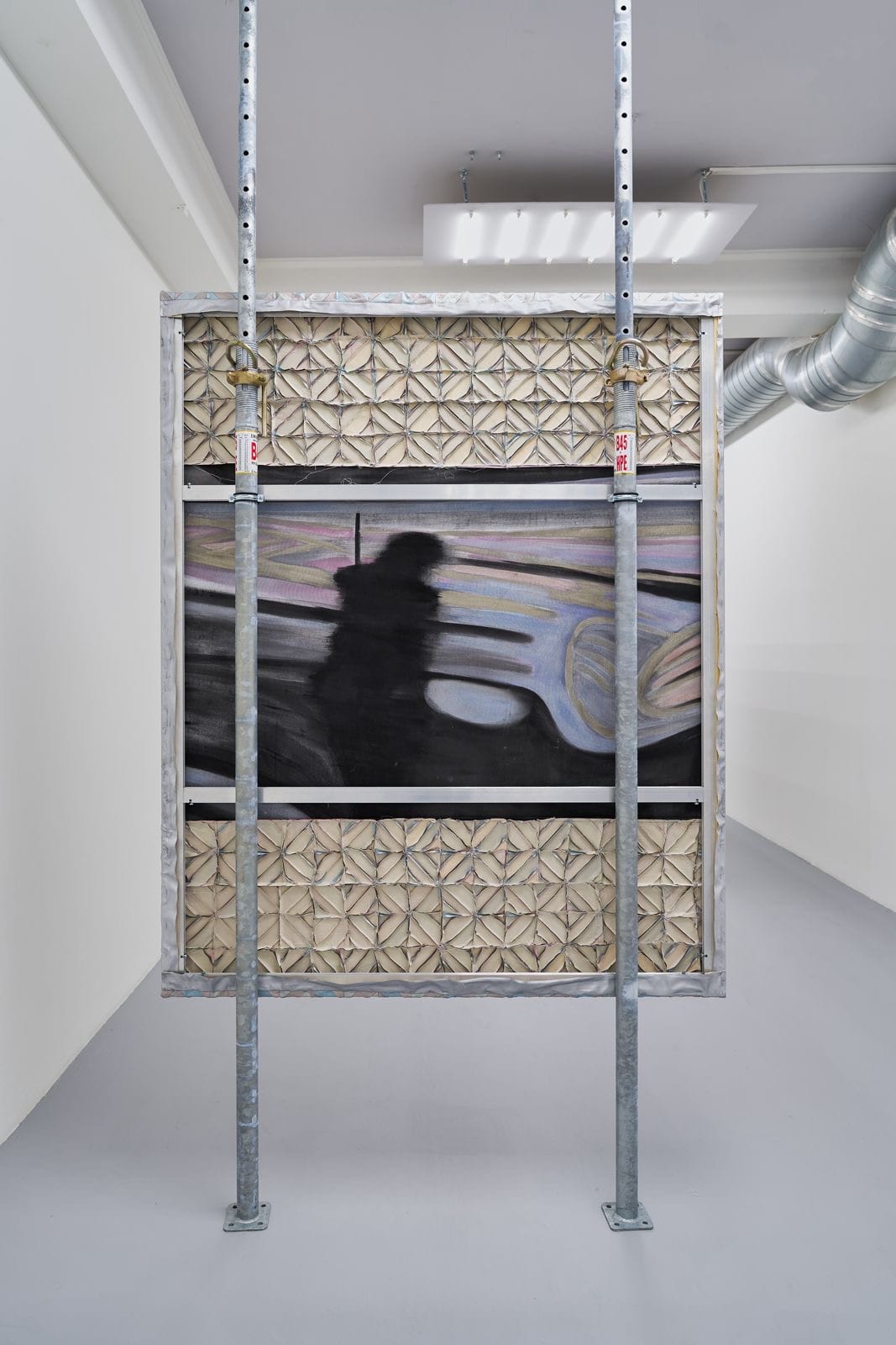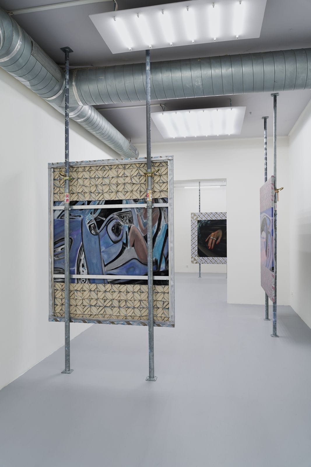 The paintings at Nod Gallery don't hang from walls. They float suspended between floor-bolted scaffolding poles, visible from multiple angles, turning in the gallery like signs in a showroom that has lost its product.