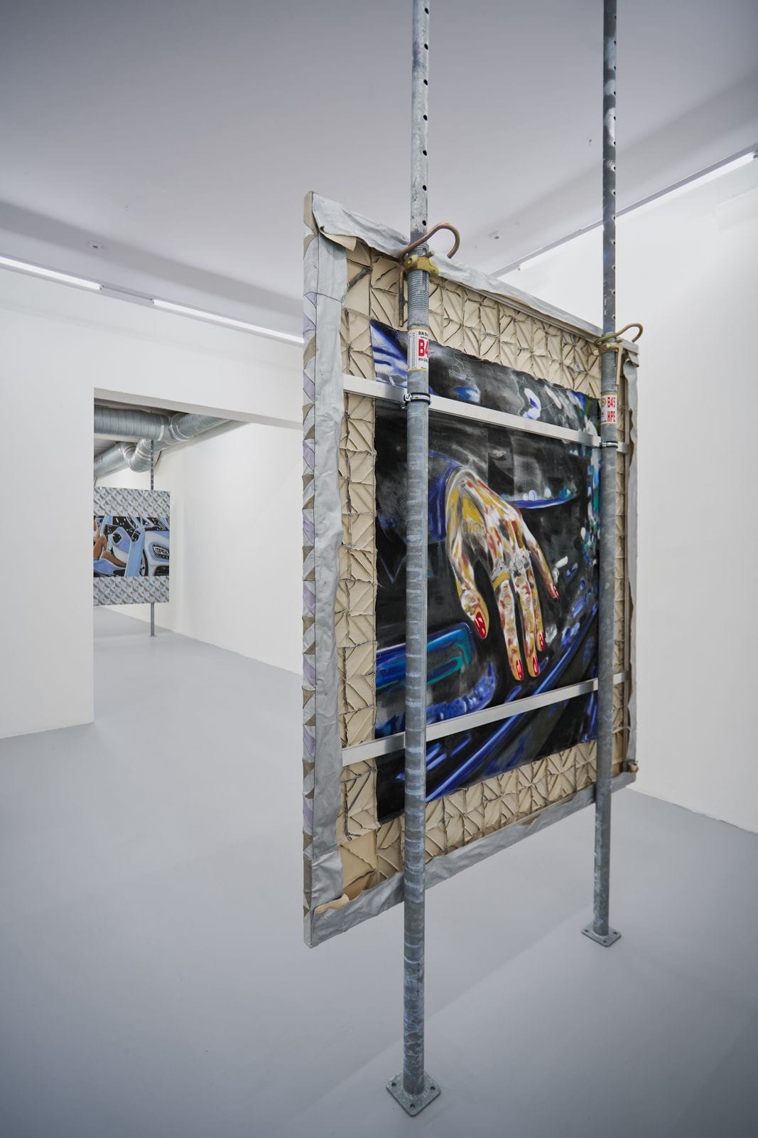 This decision to mount the works on galvanized construction supports carries its own argument: the car, stripped of its function and reconstituted as paint on canvas, now inhabits a frame that also refuses the conventions of the white cube. The gallery space, industrial ceiling ducts and fluorescent light, does not work against the work. It seems to have been anticipated.