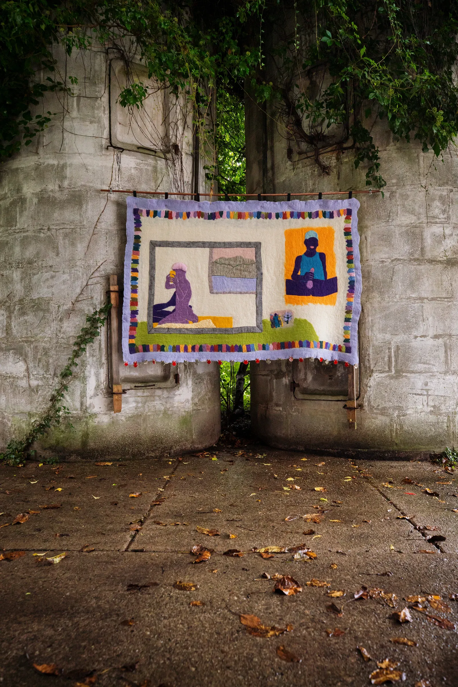 The textiles behave like soft architectures. Felted scenes stretch across large hanging panels while delicate crochet elements hover in space. Delannoy stitches dating app images, receipts and domestic objects into these fields. The material stays visibly handled, slightly uneven, sometimes rough. Nothing appears polished, everything carries the pressure of the hand.
