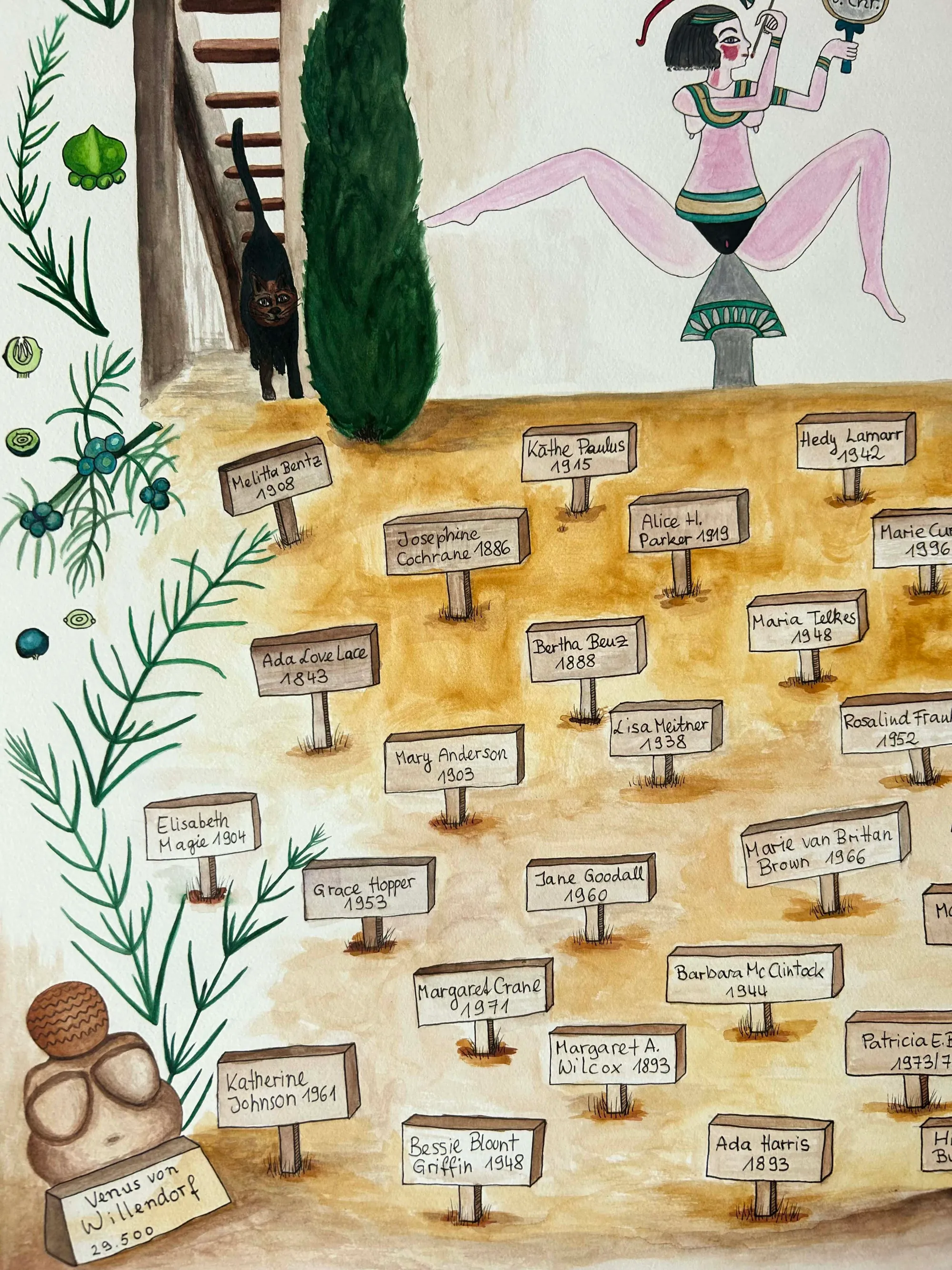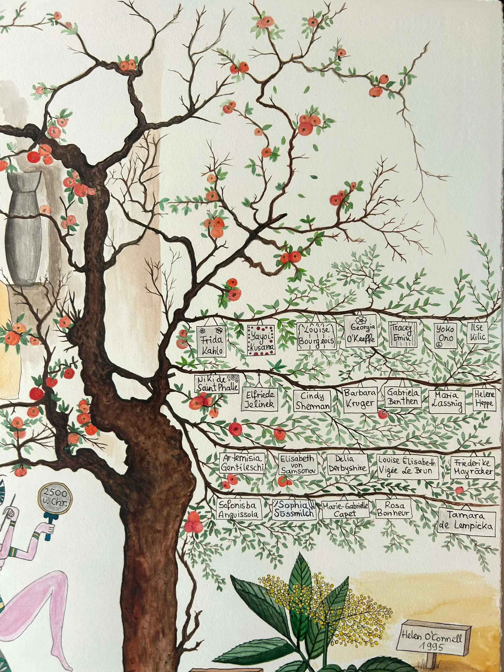 Rica Fuentes Martinez: Detail from watercolor and ink on handmade cotton paper, Vienna. The precision reveals how she intertwines myth, science, and overlooked voices into a living tree of knowledge and memory. Images courtesy the artist.