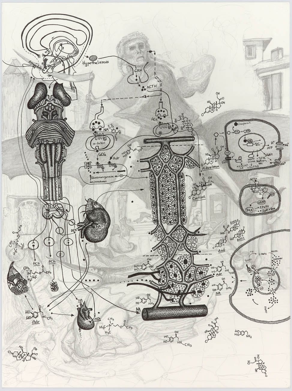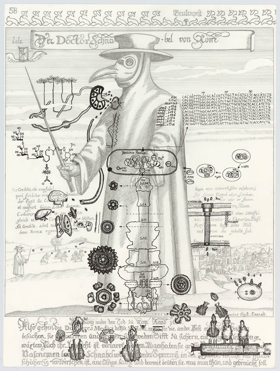 Rica Fuentes Martinez: On the left: “Yersinia Pestis II” (2022) and “Yersinia Pestis III” (2023) Pencil and ink on paper, each 30 x 40 cm. Yersinia Pestis III maps a dense network of anatomical pathways and chemical notations layered over spectral human figures. It evokes the clinical precision of medical diagrams while allowing plague histories to seep through as ghostly presences. Images courtesy the artist.