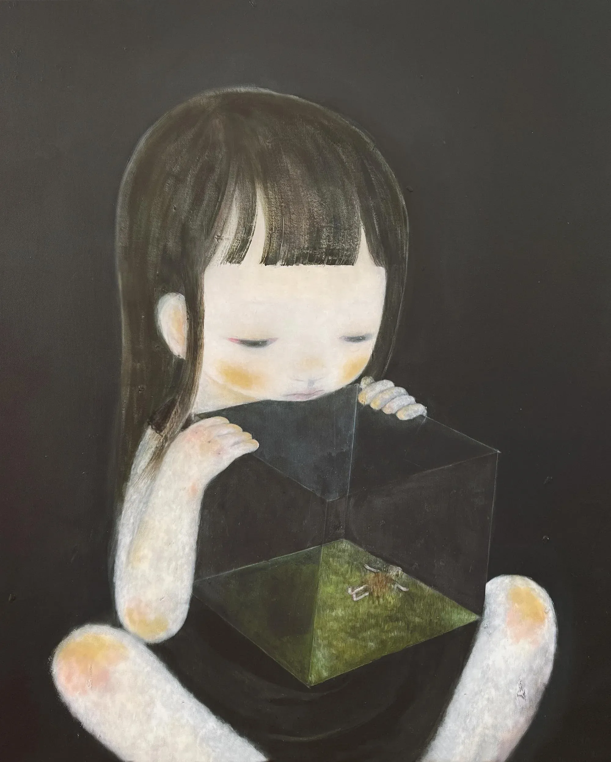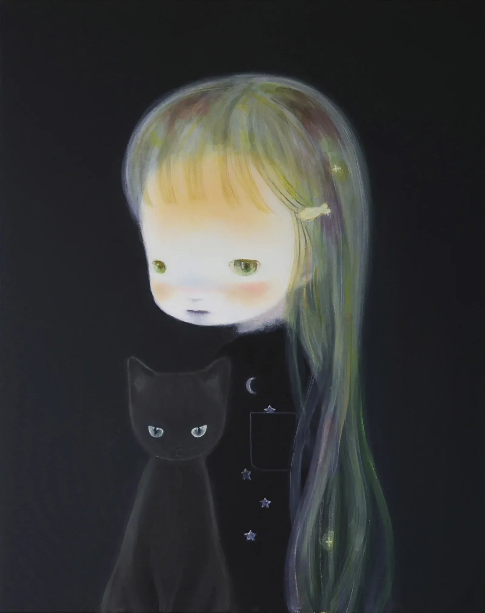 The distinction matters. Wu's figures choose to be alone. They're not abandoned or forgotten. They've found the exact distance from the world where companionship becomes optional but available. The cat in Little Shadow (100x80cm, 2025) isn't rescue, it's agreement. Two beings who understand that sometimes presence is enough.