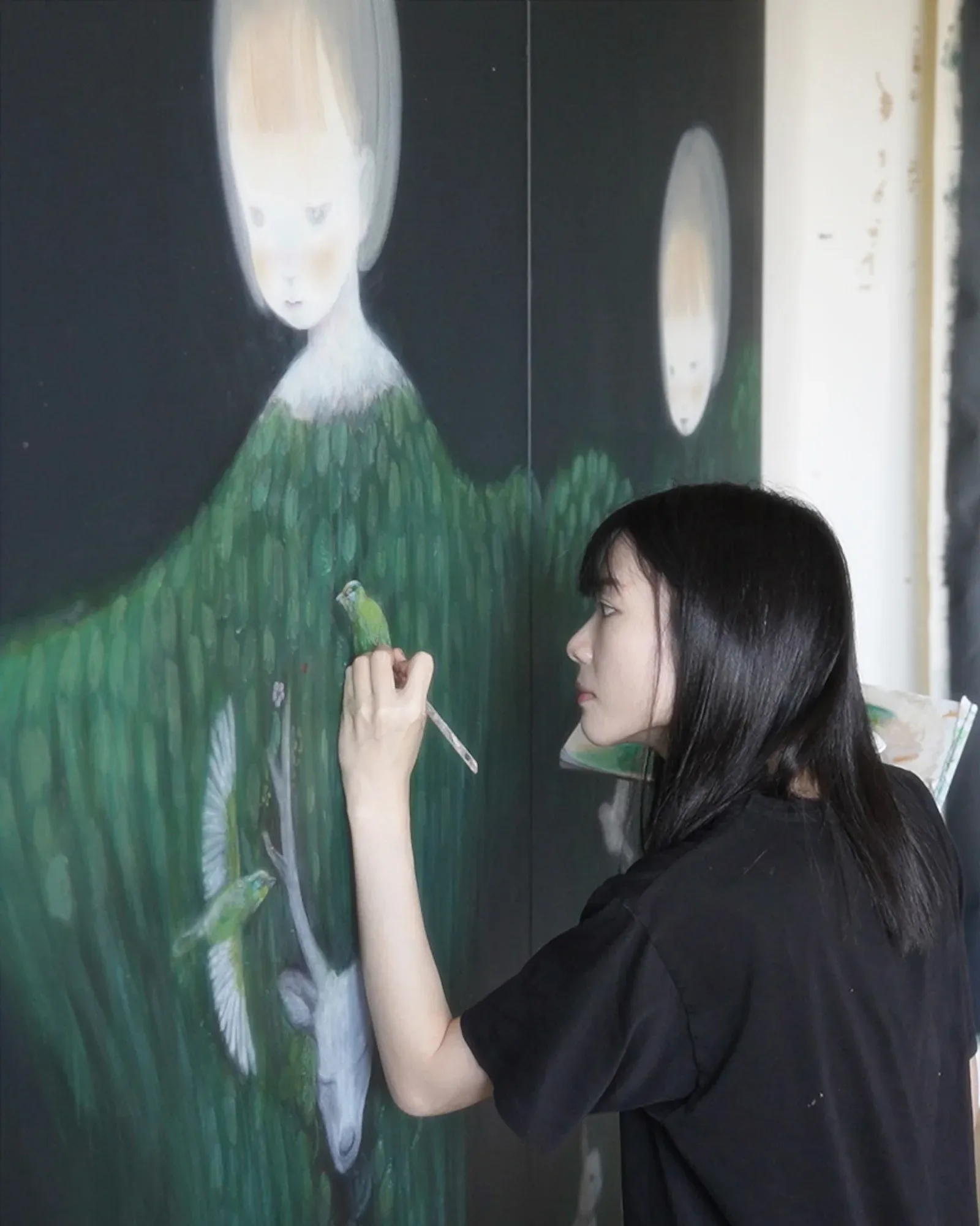 Wu's paintings operate through radical reduction. Monochromatic palette: glowing pale figures against absolute darkness. No background, no horizon line, no spatial reference. The blackness isn't empty space, it's dense, pressurized, physical. Like deep water or the inside of closed eyelids.