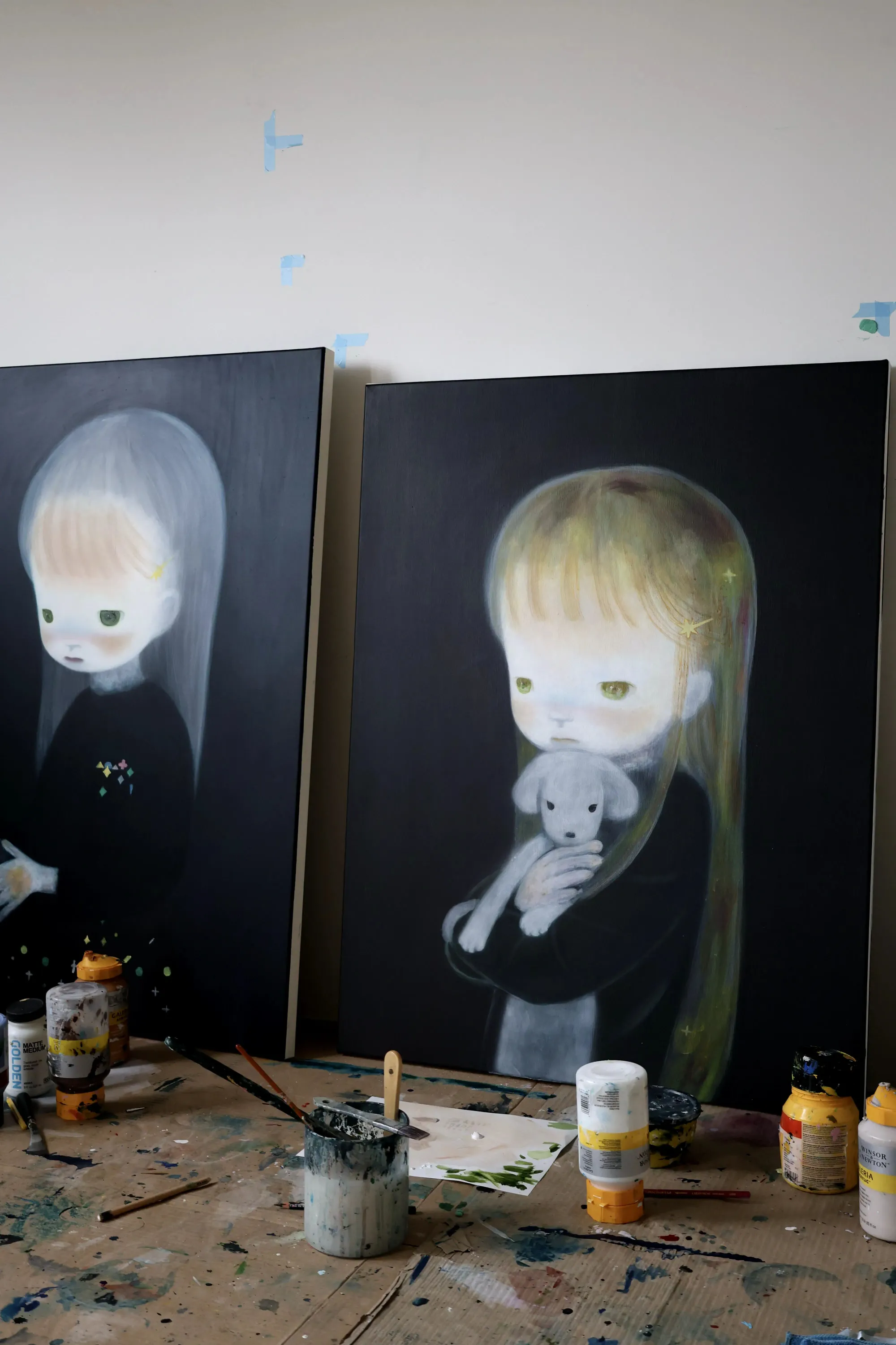 Ruo-Hsin Wu, studio views Left: the artist at work with an unfinished painting Right: studio view, Soka Art, Art Taipei Courtesy of the artist