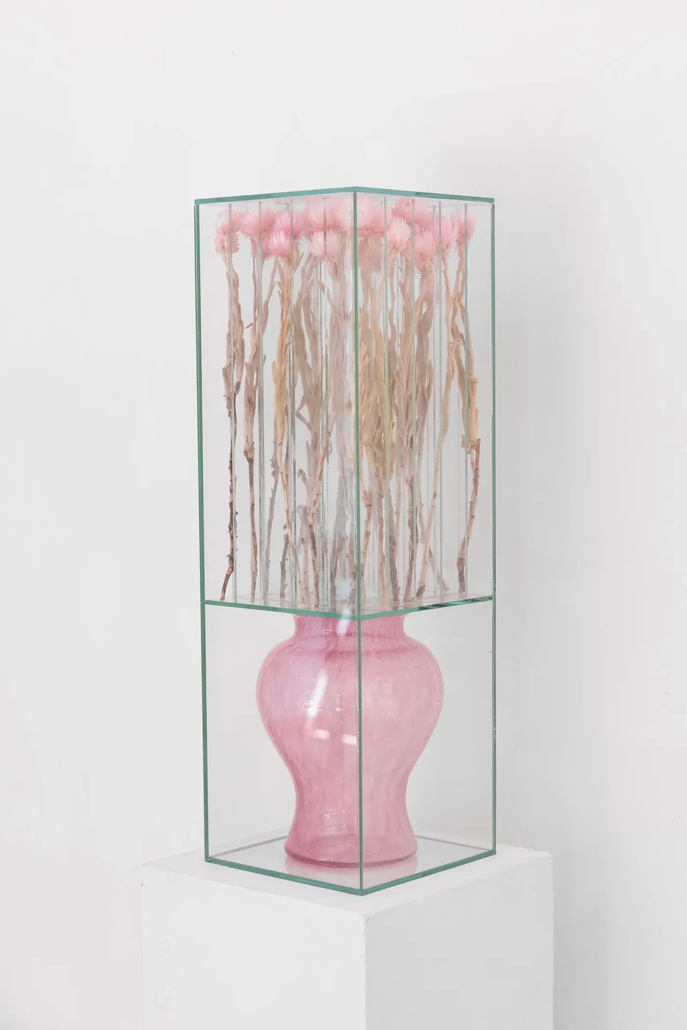 Sándor Körei: Left: Orchealis Luminis, 2024, flat glass, vase, artificial plant, 26 × 26 × 60 cm. Right: Pink Glass Vase with Pink Cornflower, 2025, flat glass, vase, flowers, 18 × 18 × 60 cm. Courtesy of Ani Molnár Gallery.