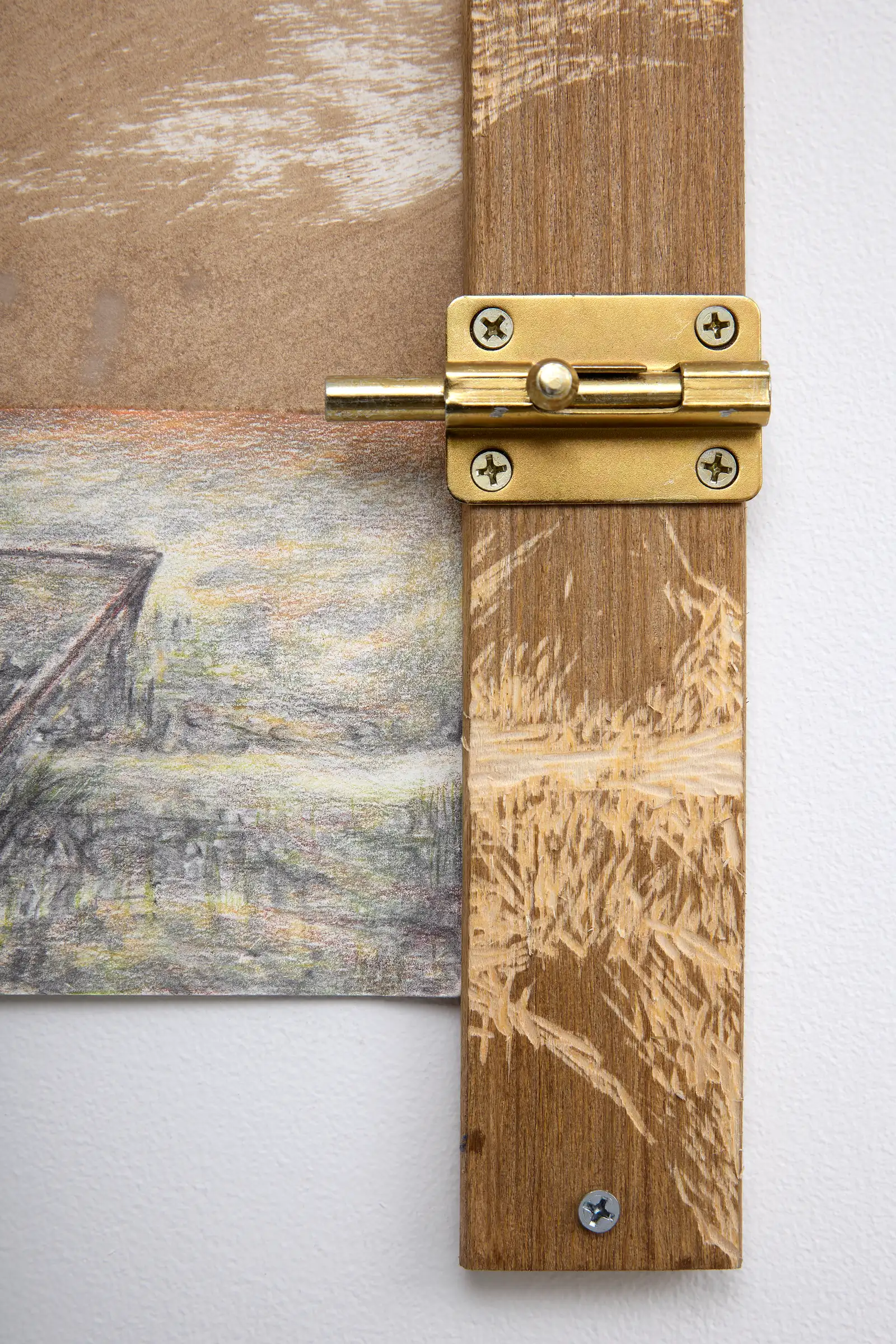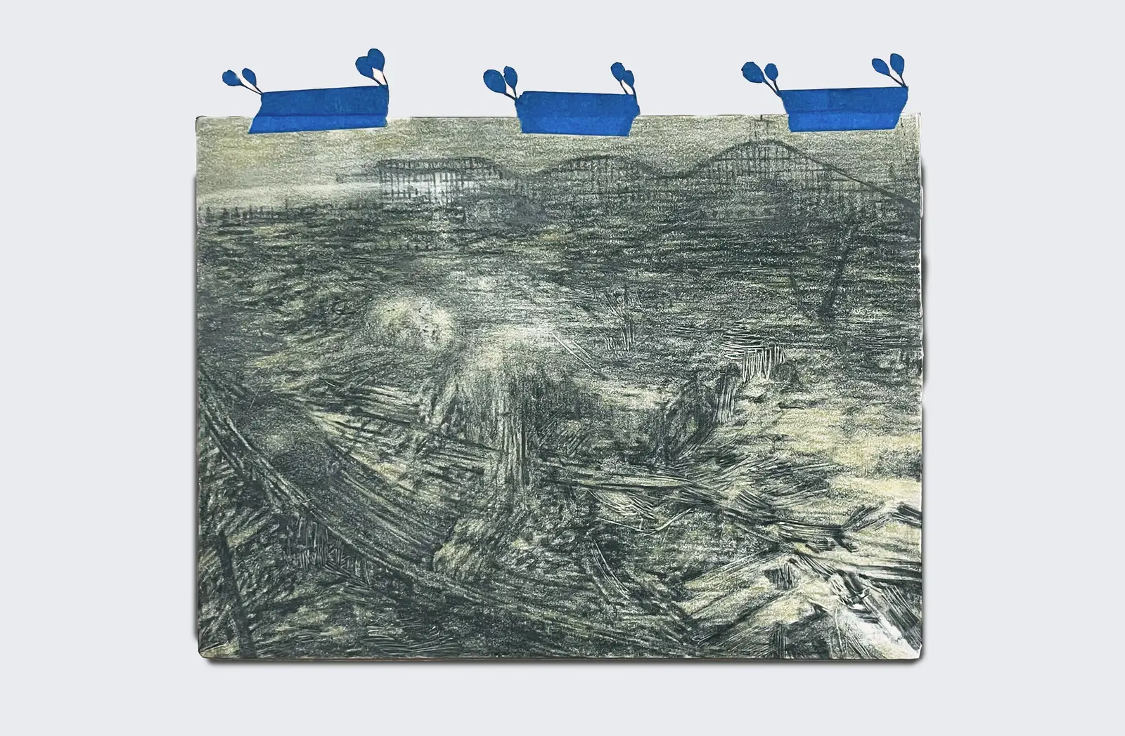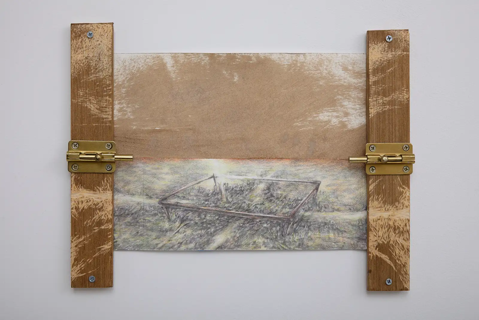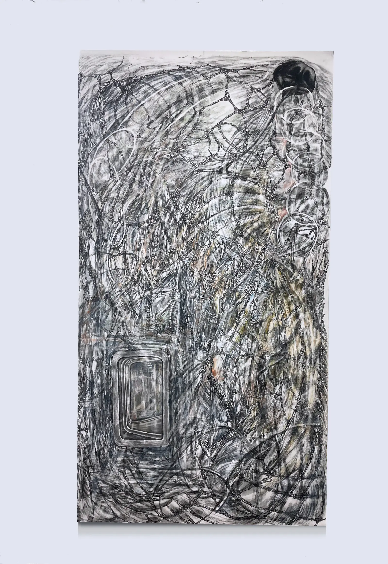 The work is driven by duration and repetition. Graphite and colored pencil are layered through sustained labor, producing images that feel less composed than worn in. Frames, supports and add-ons, from mixed-media constructions to taped or wooden elements, are not decorative but structural.