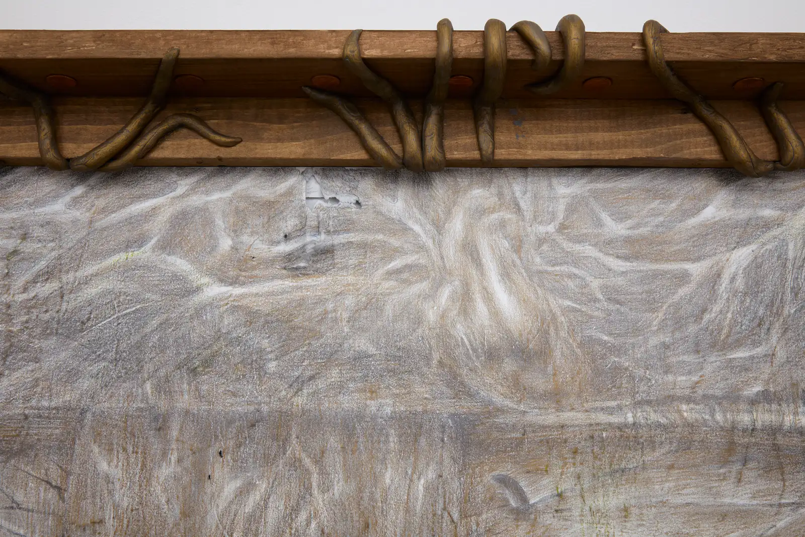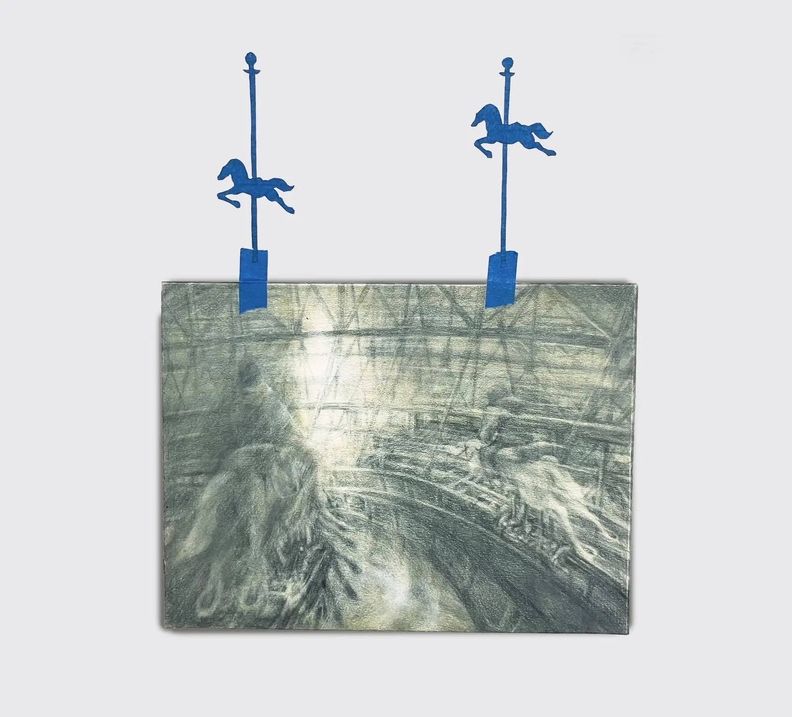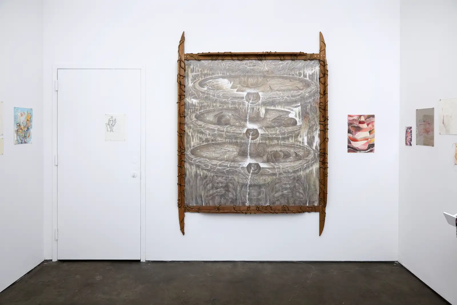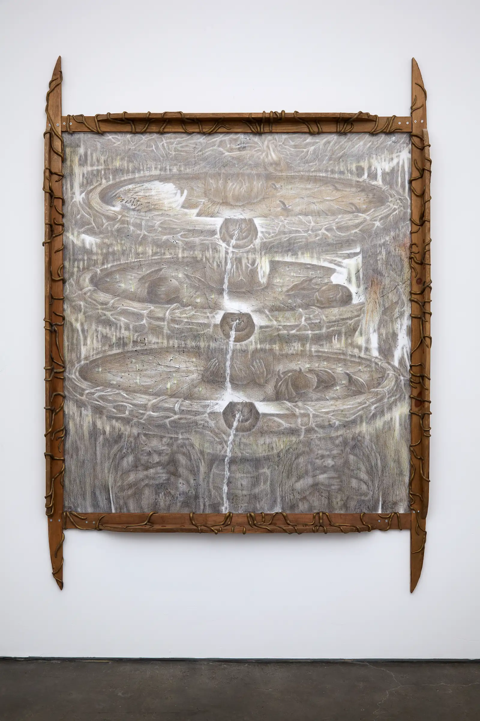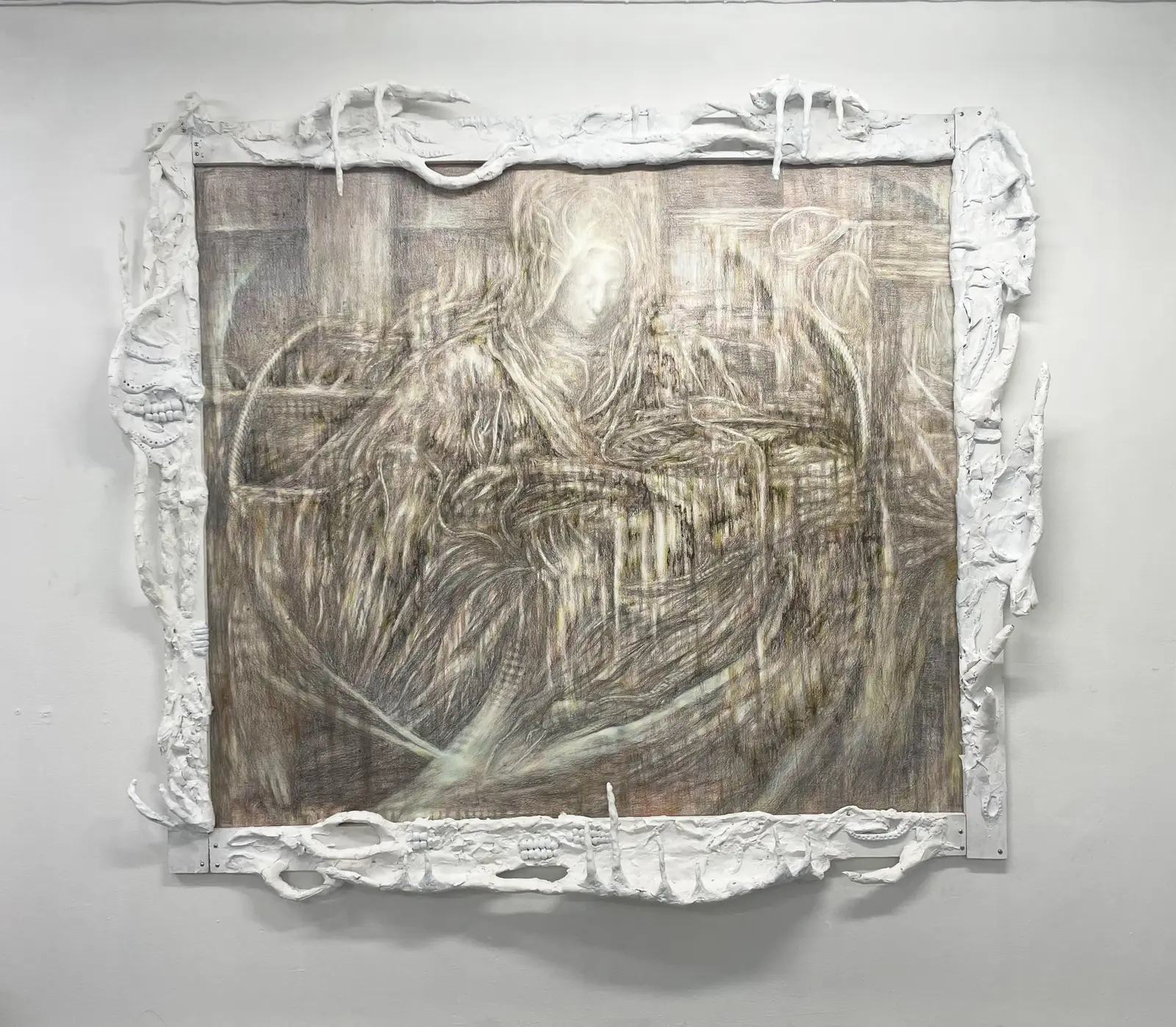 The work is driven by duration and repetition. Graphite and colored pencil are layered through sustained labor, producing images that feel less composed than worn in. Frames, supports and add-ons, from mixed-media constructions to taped or wooden elements, are not decorative but structural.