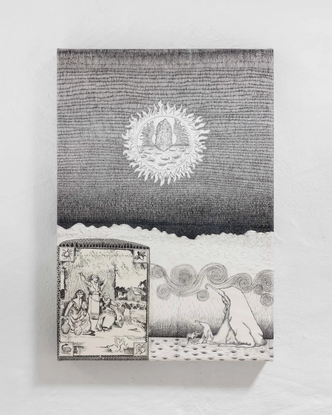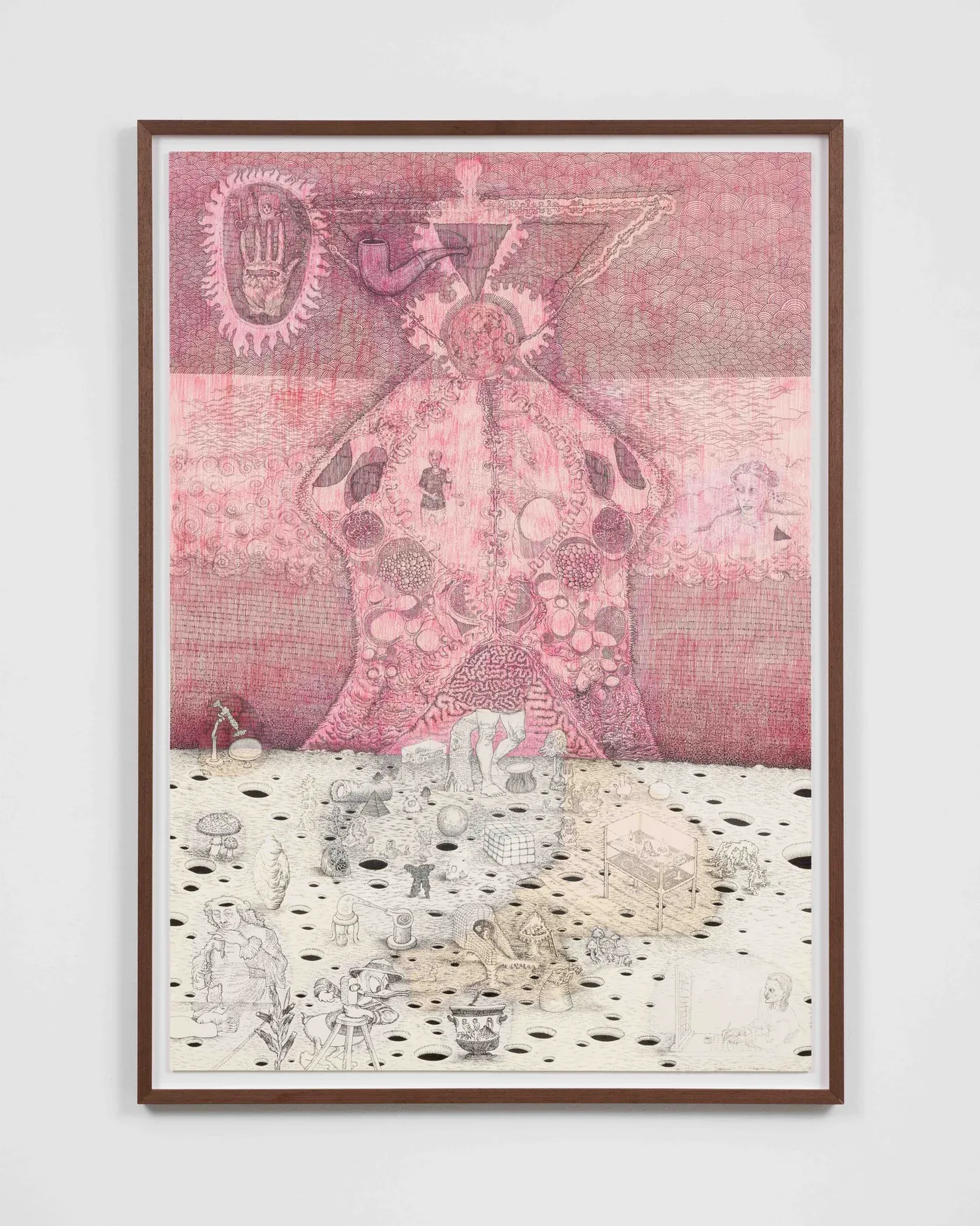 It echoes medieval marginalia, outsider cosmologies, and scientific illustration, while sidestepping nostalgia.