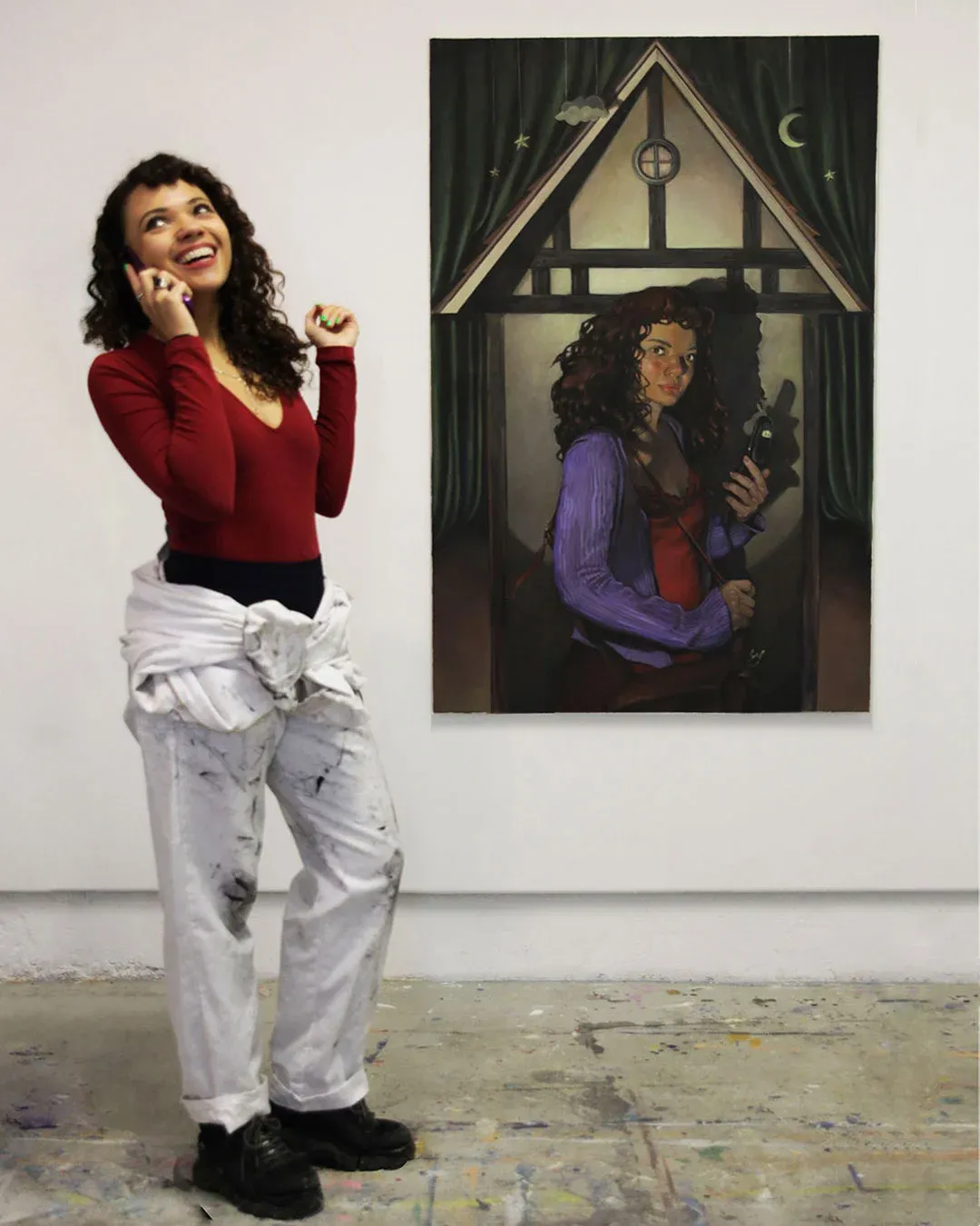 Eliane Diur paints layered oil scenes in Leipzig: a recurring avatar moves through rooms, curtains, and windows to turn looking into patient self-inquiry.