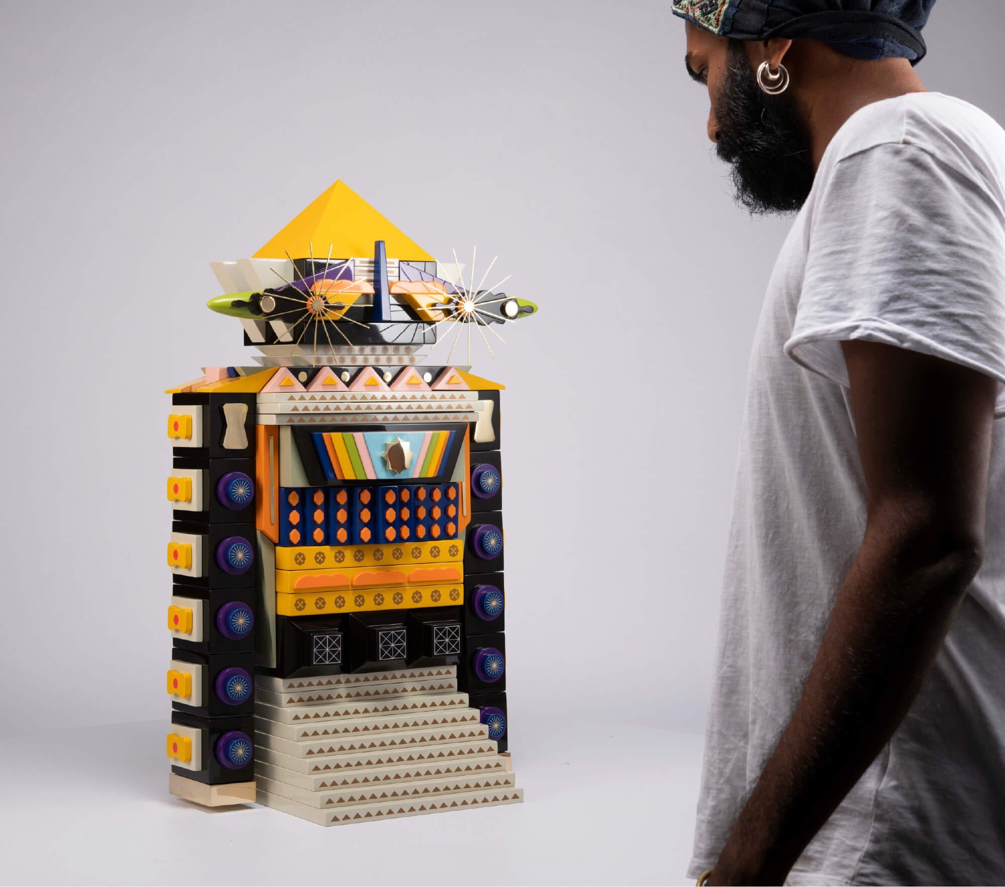 Kumkum Fernando builds mythological robots from wood and pigment, hybrid icons drawn from South Asian cosmology and childhood memory.