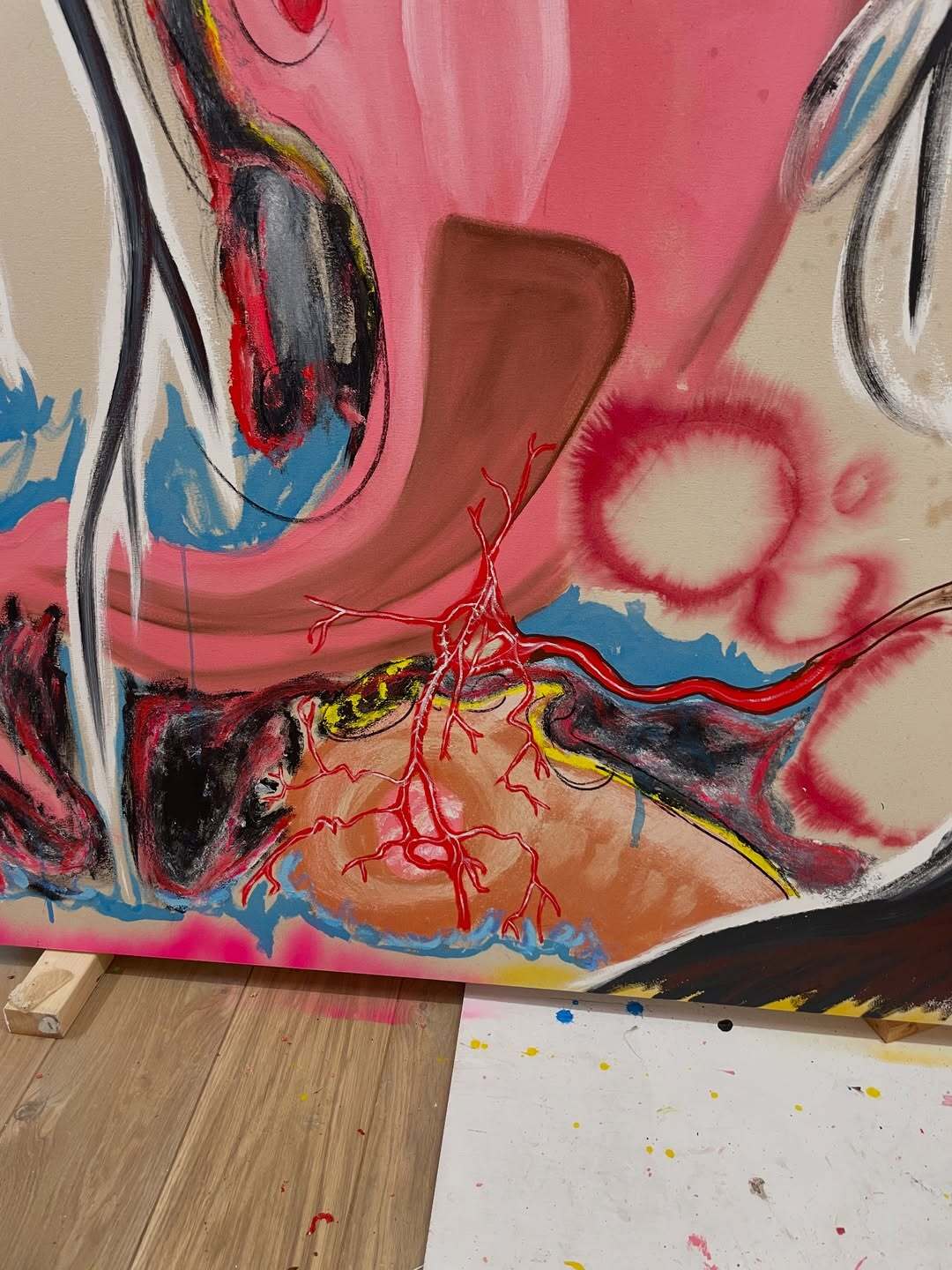 Her visual language borrows from graphic design, graffiti, and abstraction, creating direct but vulnerable registers of expression. Exhibited widely across the UK, her practice speaks to immediacy and intimacy.