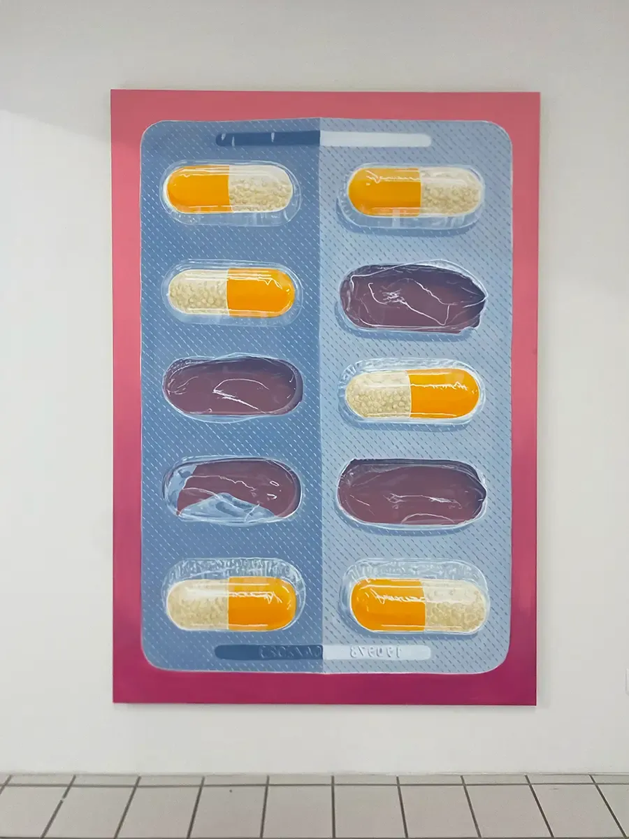 Toninho Dingl; Vitamin B | 130 x 190 cm | Acrylic on Canvas | Vitamin B for Everyone! In the Salon der Gegenwart, known as a launchpad for emerging art, a large-scale painting of a Vitamin B pill blister is showcased. Here, the term 'Vitamin B' takes on a satirical edge, highlighting the importance of networking in the art world for artists seeking to establish connections or gain recognition. Toninho Dingl plays with the dual meaning of 'Vitamin B' – emphasizing not just the necessity of connections but also the concept of absence (a trace) and its associated temporal dimension.Ibuprofen | 140x85 cm | Acrylic on Canvas | The opposite of aesthetics, which numbs and silences, can be seen as anesthesia. This concept suggests that the artist's antagonist is the anesthetist, who temporarily closes the gateway of sensations to numb pain, creating a state of temporary or localized death. This painting embodies a contradiction between these two extremes, engaging in a dialectic shaped by impressions and expressions. A distant thought about this work concerns pain management: the pharmaceutical industry seeks to internalize or silence pain, while opera externalizes or dramatizes it. The piece is also deeply connected to my friend, who suffers from migraines. | Image Courtesy by the Artist |