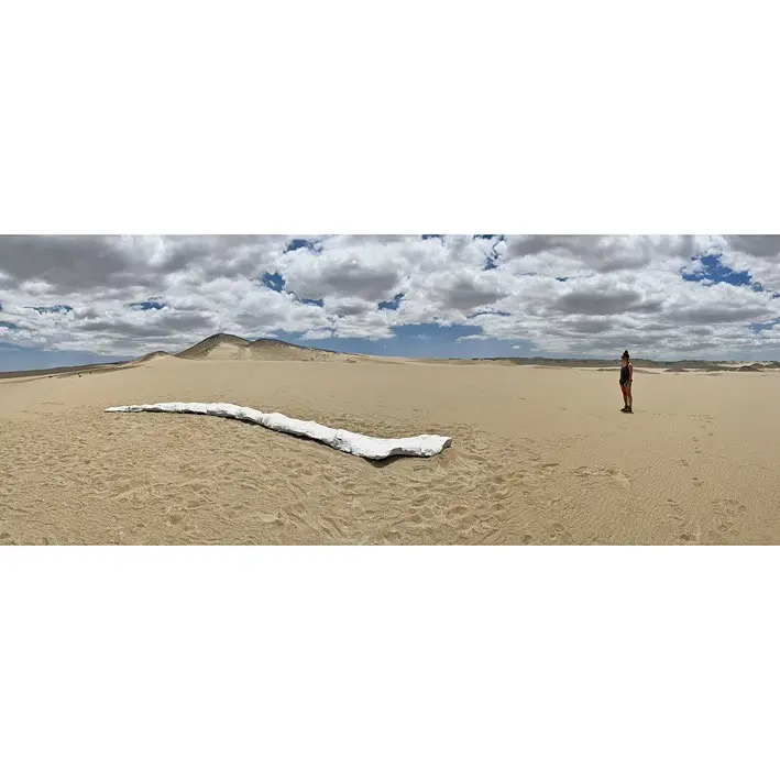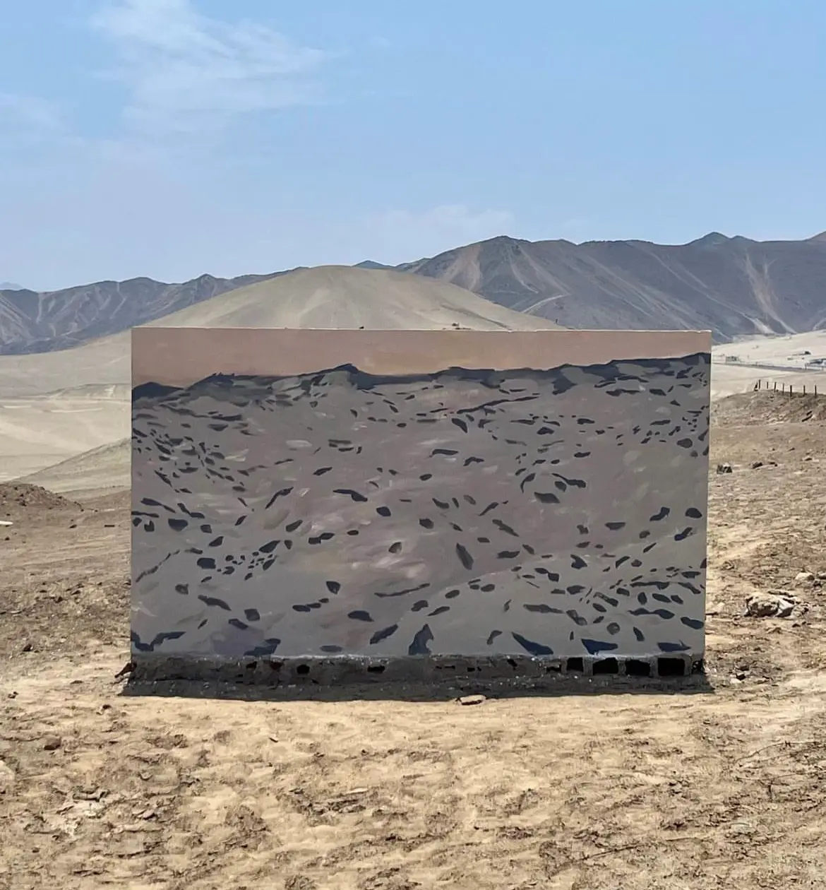 Valentina Maggiolo: (left) Origin Site specific sculpture in the Peruvian Desert 800 x 100 x 80 cm2023 (right) Landscape Mural 210 x 190 cm 2024 | Image Courtesy of the Artist