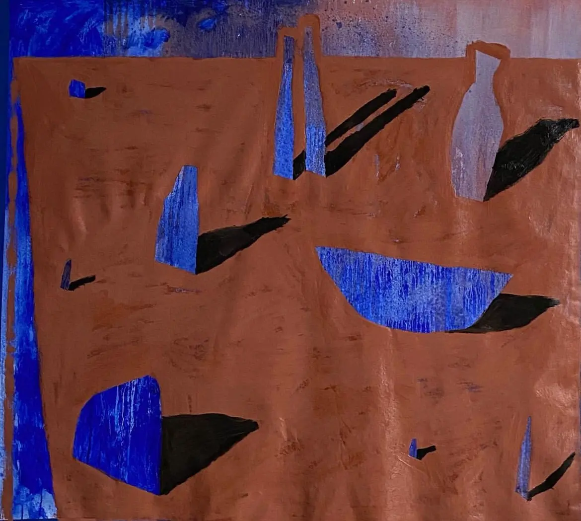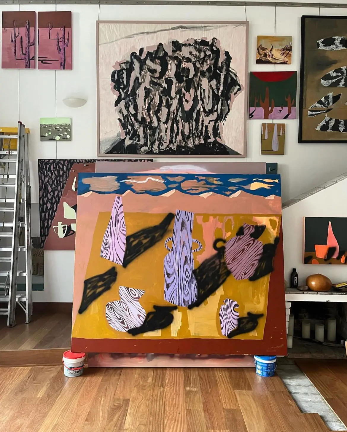 Her process isn’t just about painting, though. Maggiolo often incorporates elements from the natural world—fire, rock formations, dried vegetation—into her work.