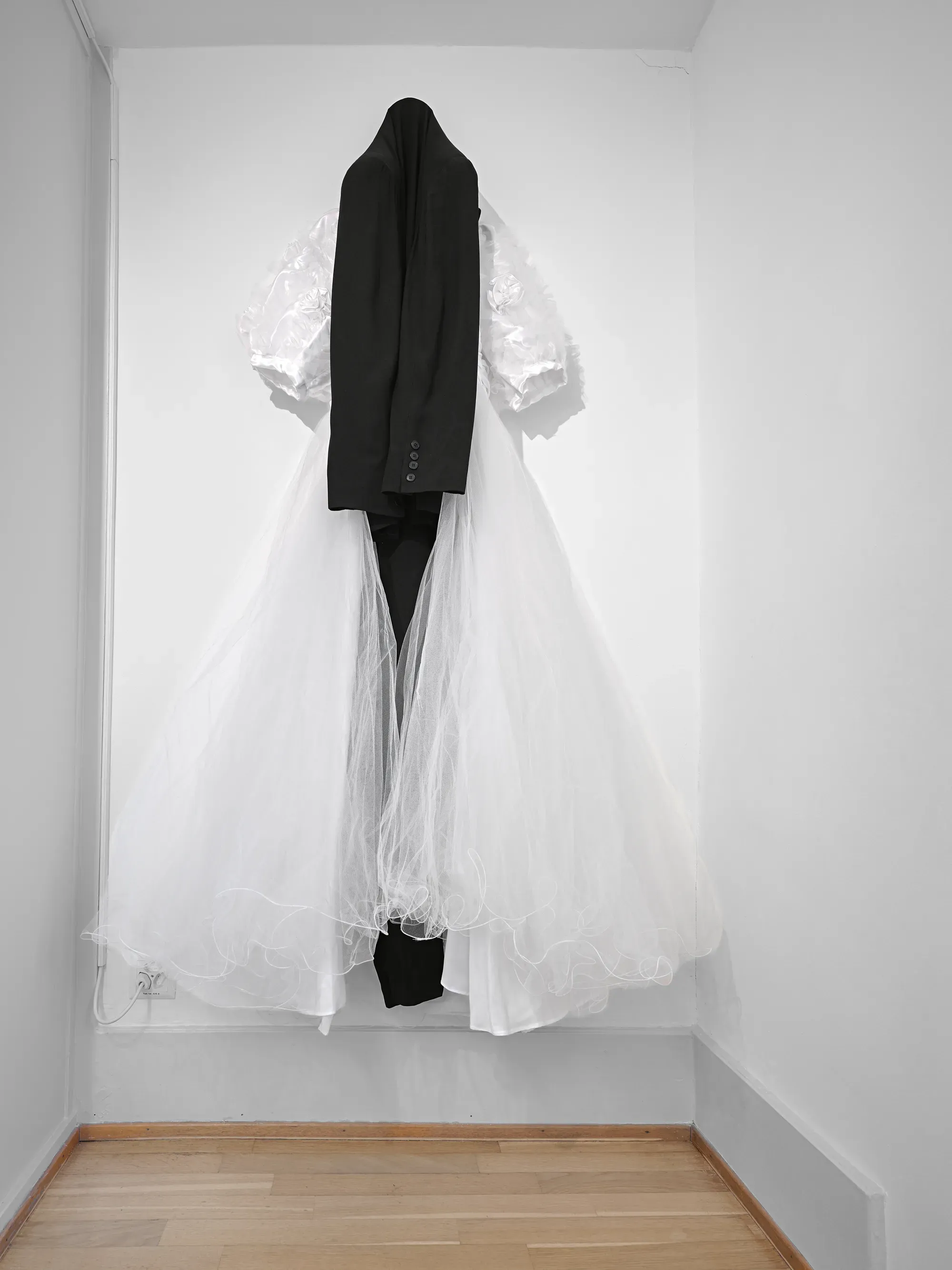(left) - Benoît Piéron, Lucie II (lampadaire), 2024, IV pole, adhesive pads, rotating beacon, silk scarf (by Sarah Schrader). Courtesy of the artist and Galerie Sultana (right) Gotscho, Wedding 1, 1992, acetate, wool, nylon (Tati dress, agnès b. costume). Collection MAMCO, “Autour de Gilles Dusein”. Installation view, “Stitches: A Haunted House and Other Ghost Stories”, Villa Bernasconi, Lancy, 2026. Photo: Nicolas Delaroche Studio.