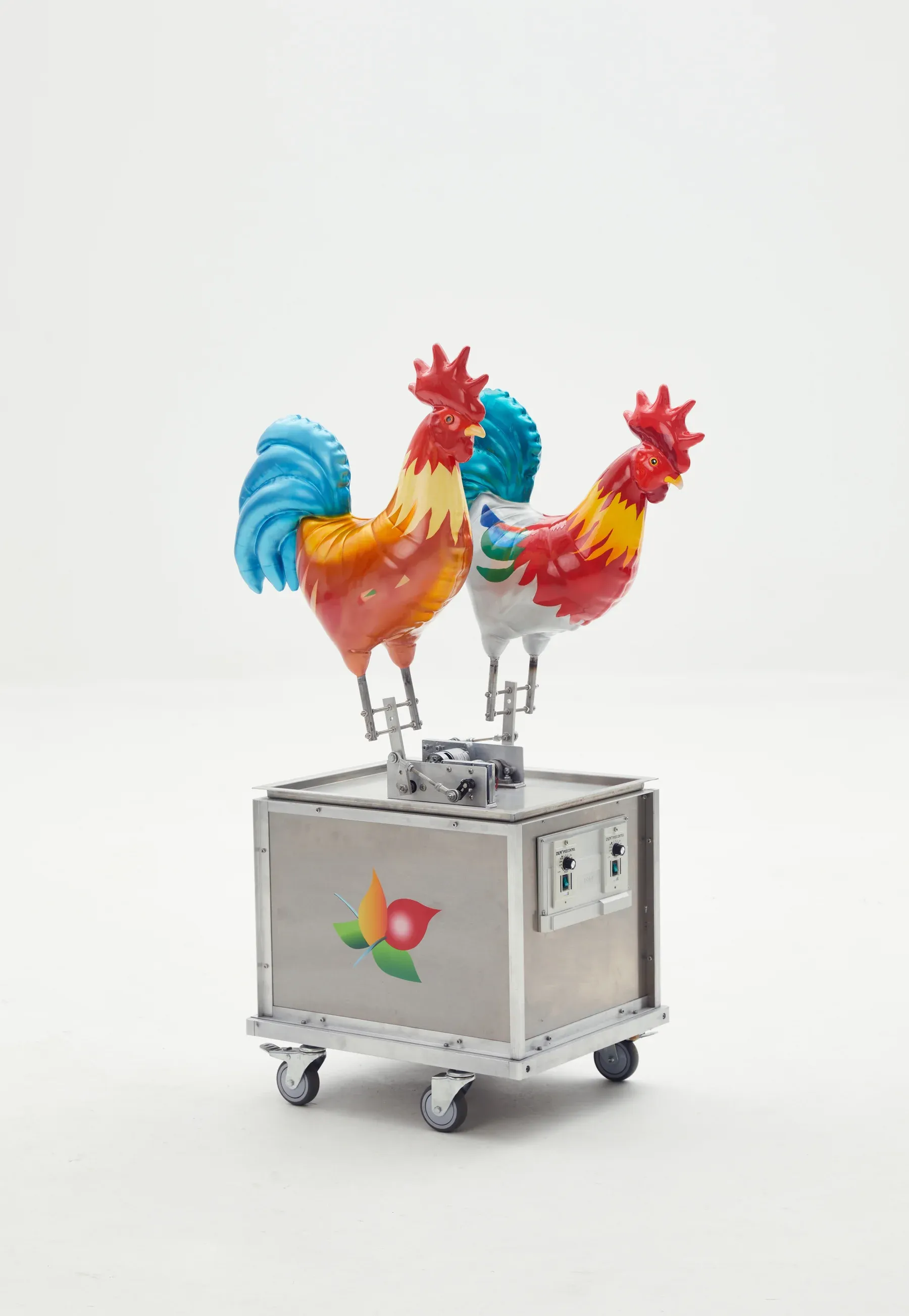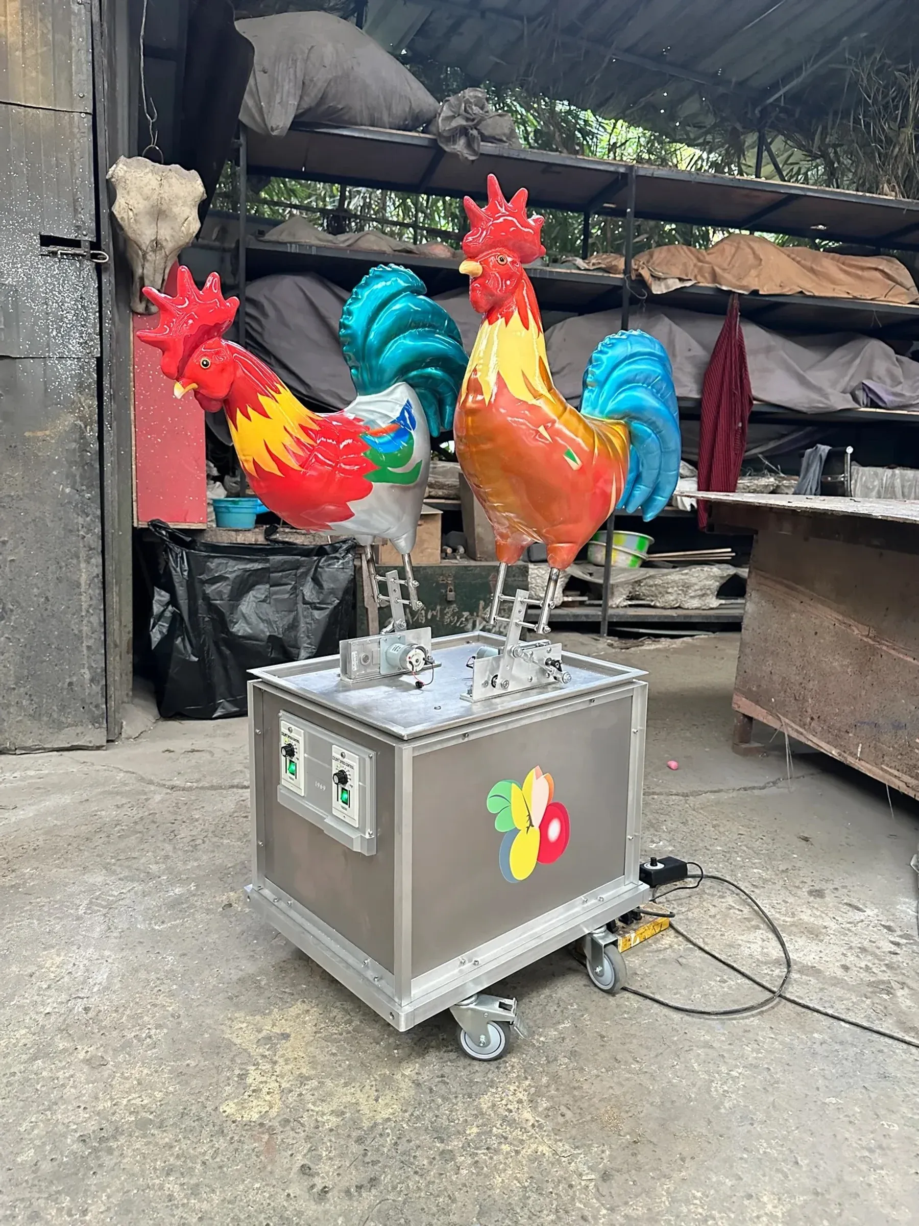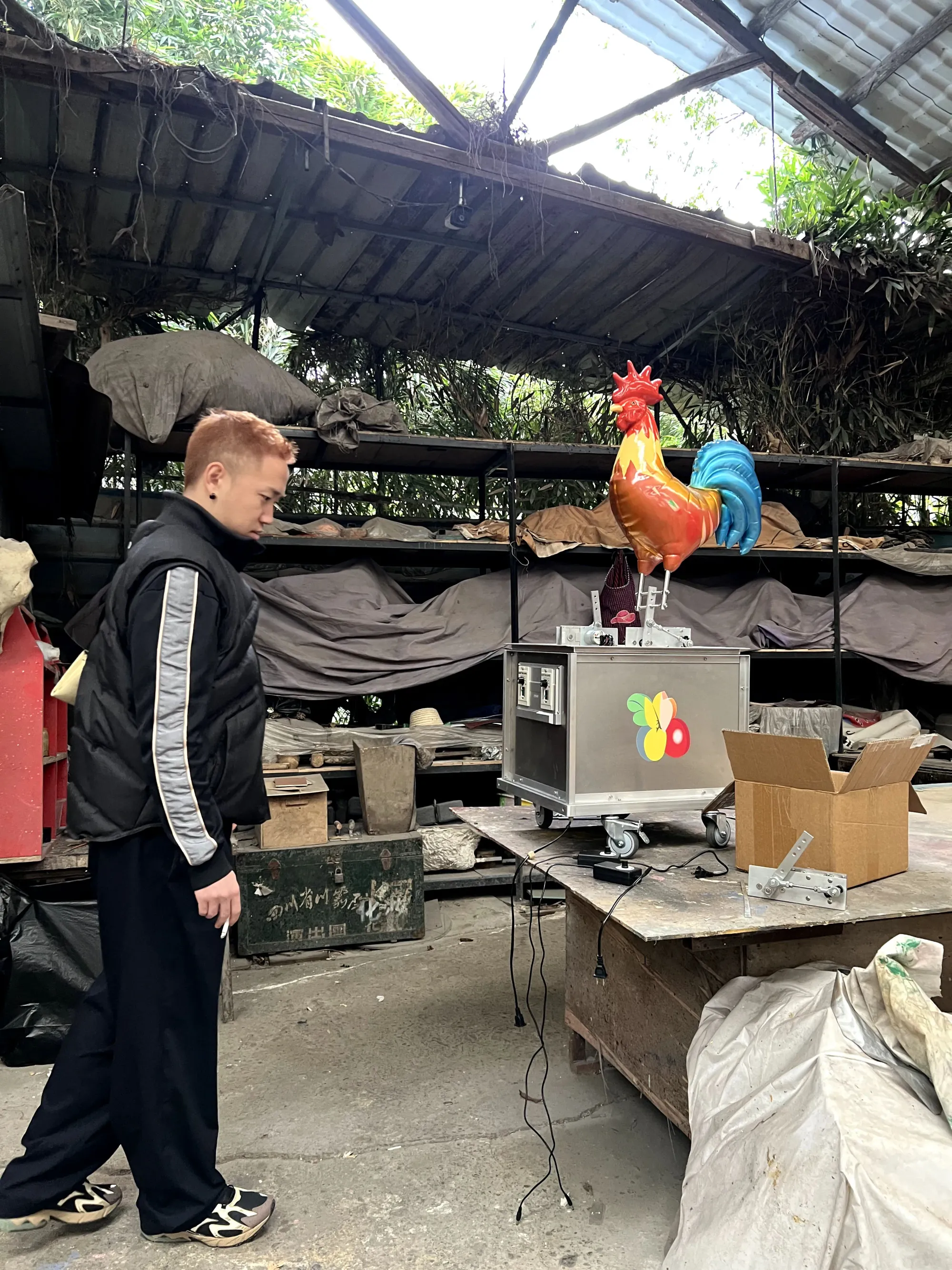 Xiaozhou Liao testing kinetic rooster sculptures in his studio workspace. Images courtesy the artist.