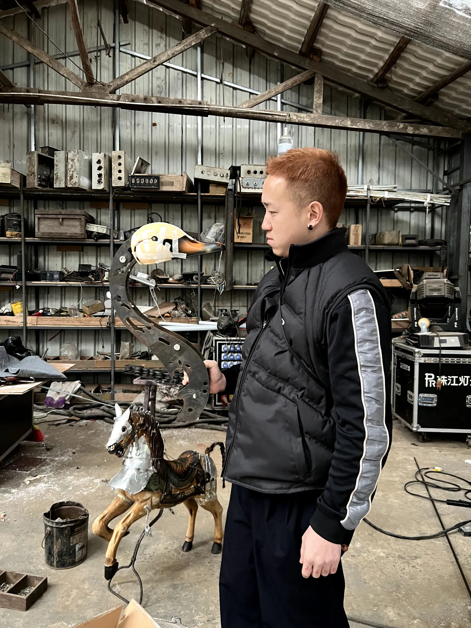 Xiaozhou Liao in his studio, working with sculptural components and metal forms. Image courtesy the artist.