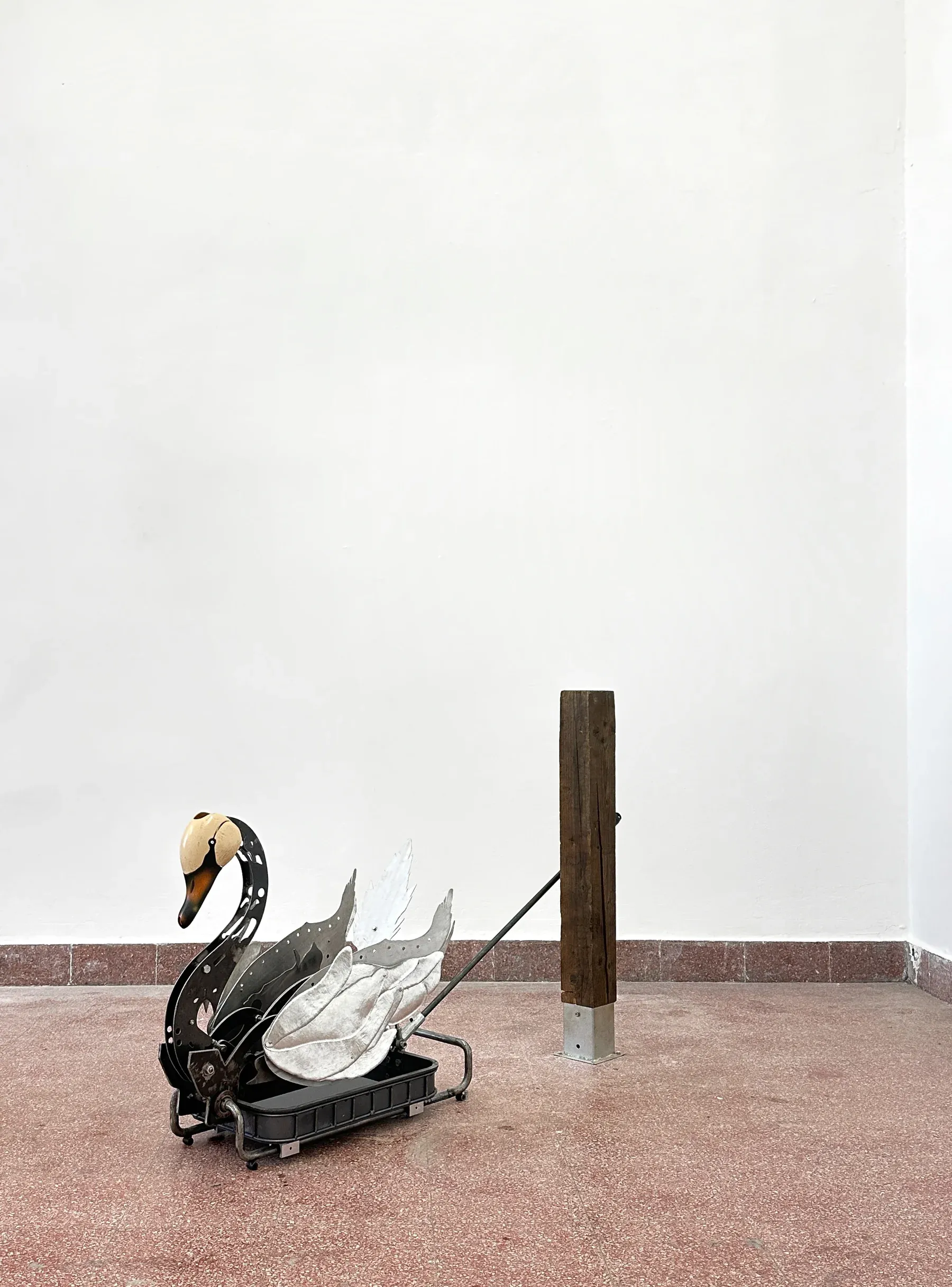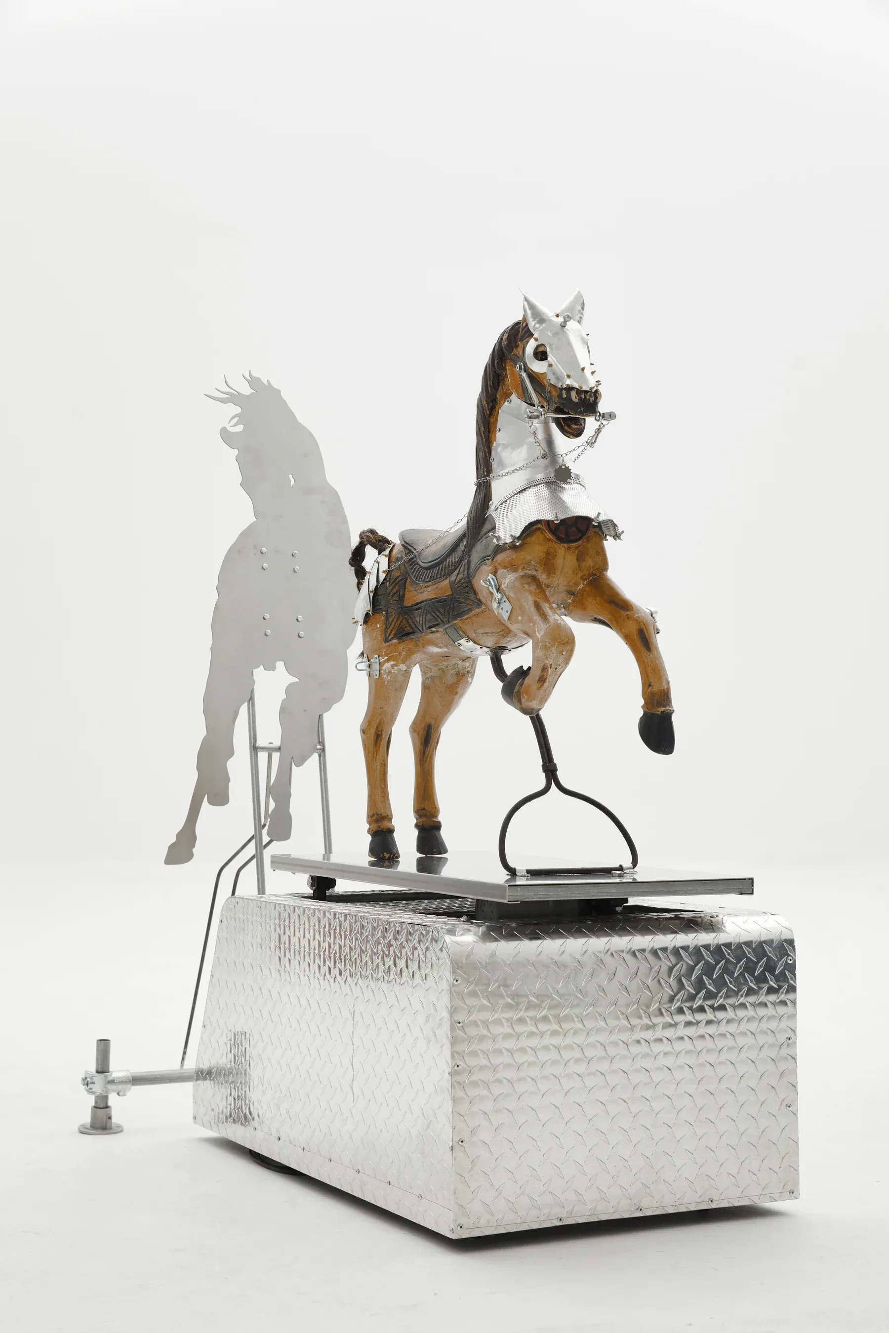 A rooster becomes a protagonist, a slide becomes a warning. Horses appear like exhausted myths, staged on platforms that feel closer to industrial traps than pedestals.
