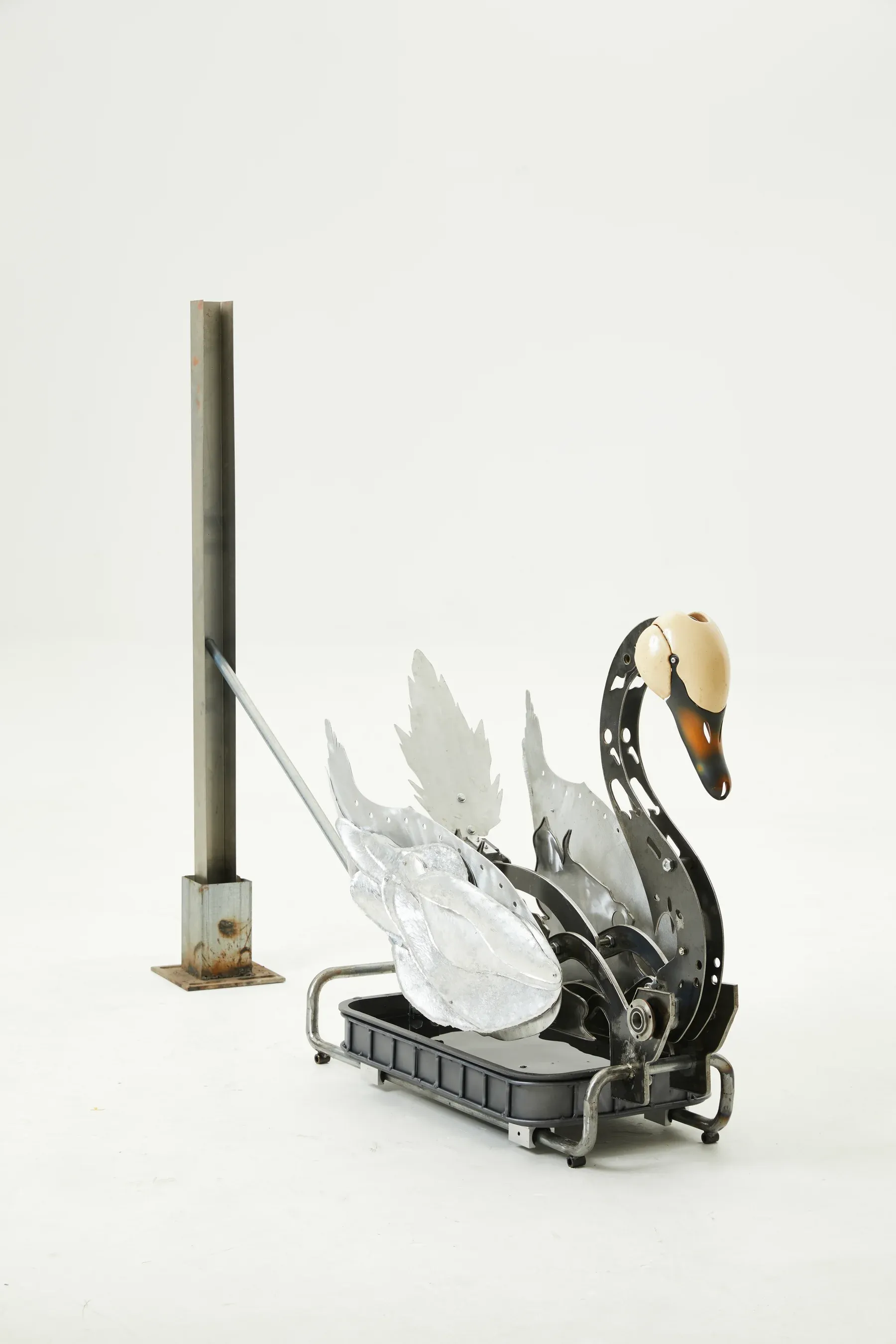 Xiaozhou Liao: ON THE LET: Der Ritter (2023), aluminum plate with galvanized and stainless steel tubing, cut iron, OSB, gear motor, metal connectors and rail rollers, 180 × 150 × 80 cm. ON THE RIGHT: Auf 1969 (2024), aluminum plate with galvanized and stainless steel tubing, cut iron, OSB, reciprocating motor, UV painted components and hollow wheel, 50 × 50 × 110 cm. Images courtesy the artist.