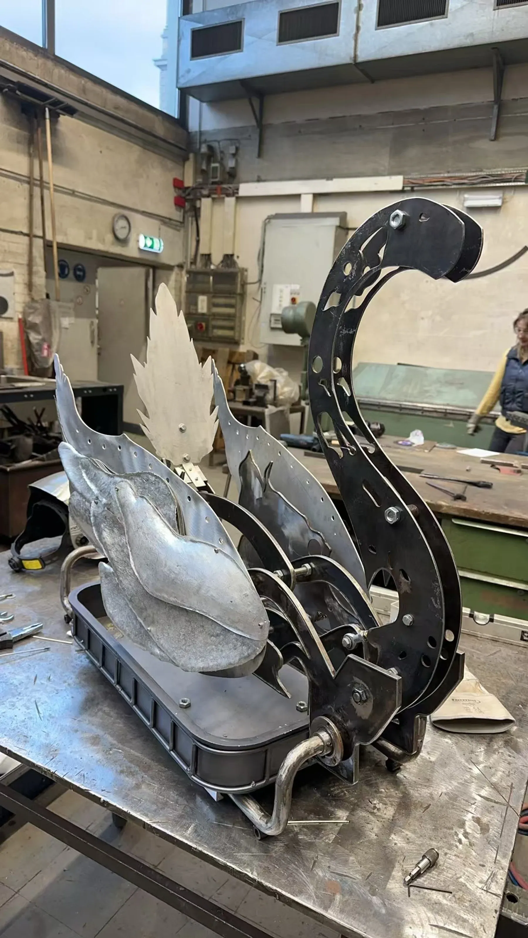 The viewer feels it the moment they enter the room. Color, steel, animal forms and industrial shine gather into scenes that read as humorous and sharp at once.