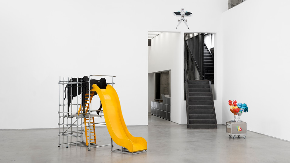 He borrows from playgrounds, prop rooms, medieval sets, and digital interfaces.