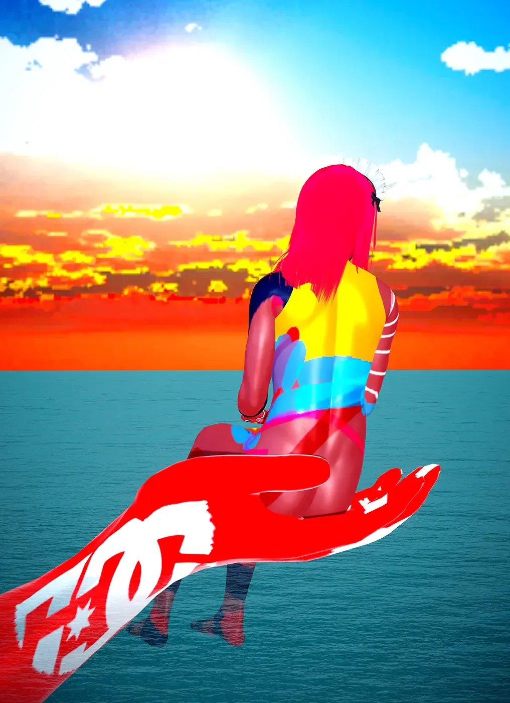 Wolfgang Saker: Artwork: "Heavenly Peach Banquet" Discription: Heavenly Peach Banquet is a vibrant and surreal digital artwork dye sublimated onto aluminum. Measuring 33.1 x 59.1 inches (84 x 150 cm), the piece features a row of identical figures with neon pink hair, dressed in bright, form-fitting costumes with maid headpieces. Each figure exhibits subtle variations in expression and gesture, adding a dynamic element to the composition. The bold use of color, especially the contrasting neon pink, yellow, and blue, creates a striking visual impact, while the repetition and uniformity of the figures evoke themes of identity, conformity, and individuality. The background, a deep green texture, contrasts with the vivid figures, enhancing the overall surreal and futuristic aesthetic of the piece.Wolfgang Saker: "Zagreus", is a striking single-channel video artwork that immerses viewers in a surreal, digitally-rendered world. The piece features a vividly colored, futuristic figure with green and red limbs, wearing VR goggles labeled "raptor vision," and adorned with star-shaped earrings and an elaborate wing-like structure. The figure's outstretched arms hold a miniature cow, poised in mid-air, while a smaller green figure rides the cow, creating an absurd yet captivating scene. The background is a bold, solid red, contrasting sharply with the blue flames erupting at the base of the composition. This work is part of a limited edition series, with editions 2-3 of 3 plus 0 artist proofs, showcasing a unique blend of technology, fantasy, and visual storytellingWolfgang Saker: About the Artwork: "2b or not 2b, 2024" is a mesmerizing artwork by Heavenly Peach Banquet Wolfgang Saker, dye sublimated onto aluminum, measuring 15.7 x 28 inches (40 x 71 cm). The piece presents a futuristic and surreal composition featuring a blue-skinned, cybernetic figure adorned with a sleek, metallic headpiece with red accents. Hovering above is a floating figure with white hair and a sleek, dark bodysuit, creating an intriguing contrast against the vibrant green background. The artwork is adorned with digitally rendered flowers and butterflies, adding an organic touch to the otherwise sci-fi aesthetic. This piece explores themes of identity, technology, and nature, blending elements of cyberpunk and digital surrealism to create a striking visual narrative.Wolfgang Saker: About this Artwork Highlight: "The Hunter is Nothing Without the Hunt, 2024" is a striking digital artwork by Heavenly Peach Banquet Wolfgang Saker, dye sublimated onto aluminum and measuring 15.7 x 28 inches (40 x 71 cm). This vibrant piece features a surreal, cybernetic figure with white hair and an imposing horned helmet, set against a vivid green background. The figure's body is a shimmering pink with abstract, green cutout patterns that reveal an almost otherworldly texture. The artwork blends elements of fantasy and futuristic aesthetics, exploring themes of power, identity, and the intrinsic connection between the hunter and the hunted. The use of bold colors and intricate digital rendering techniques creates a captivating and thought-provoking visual experience